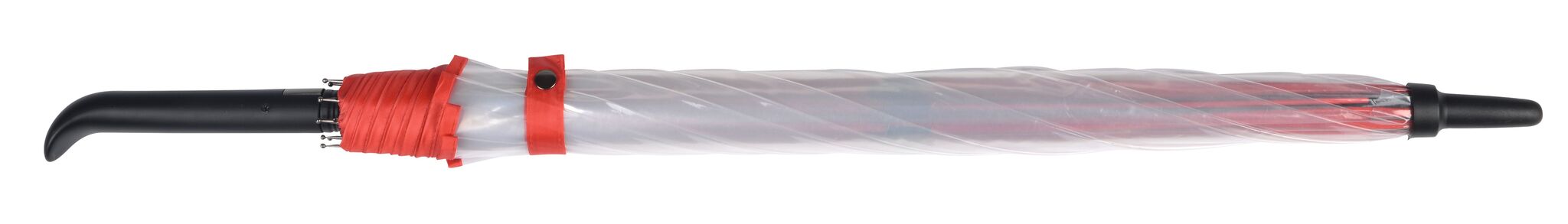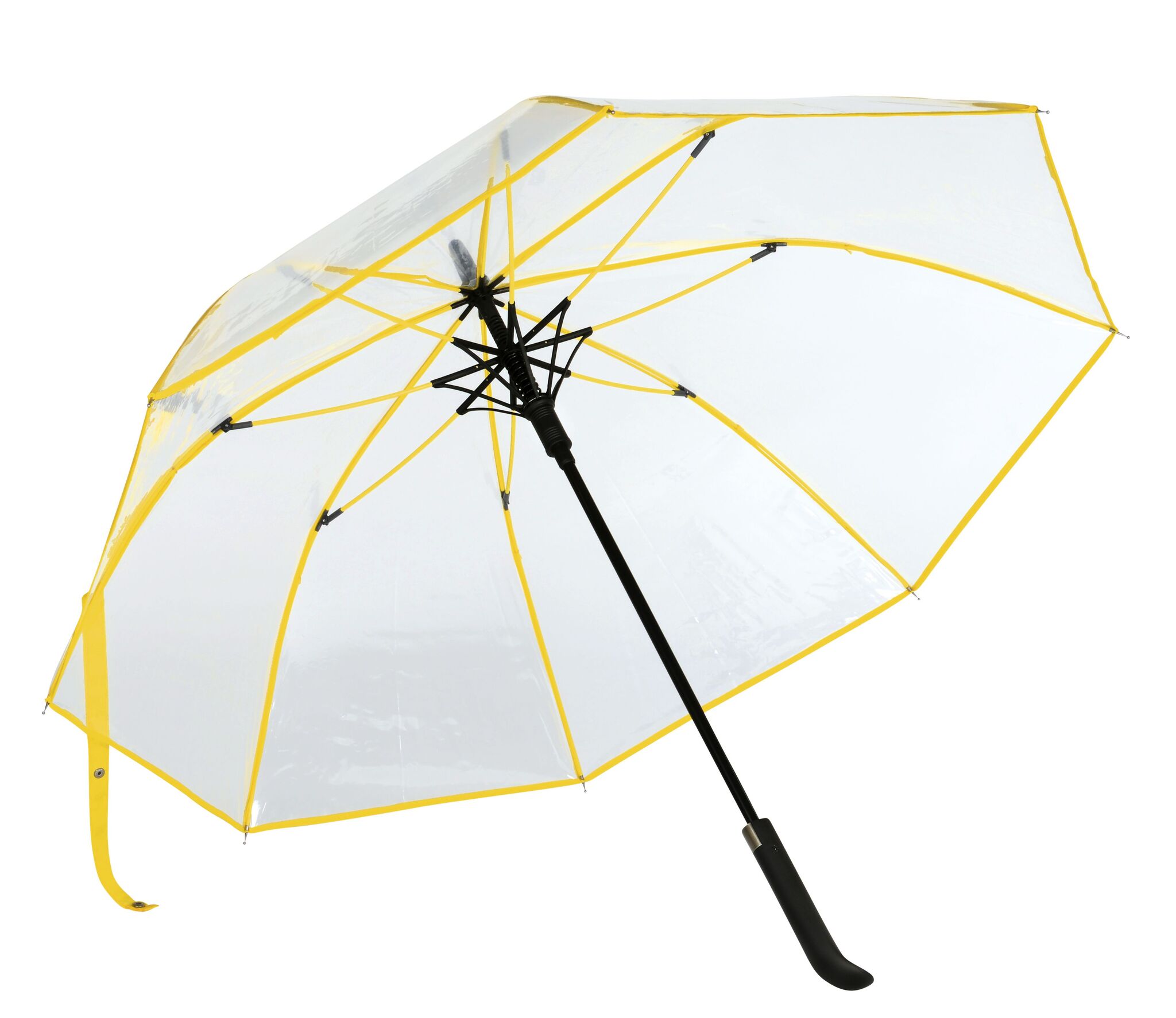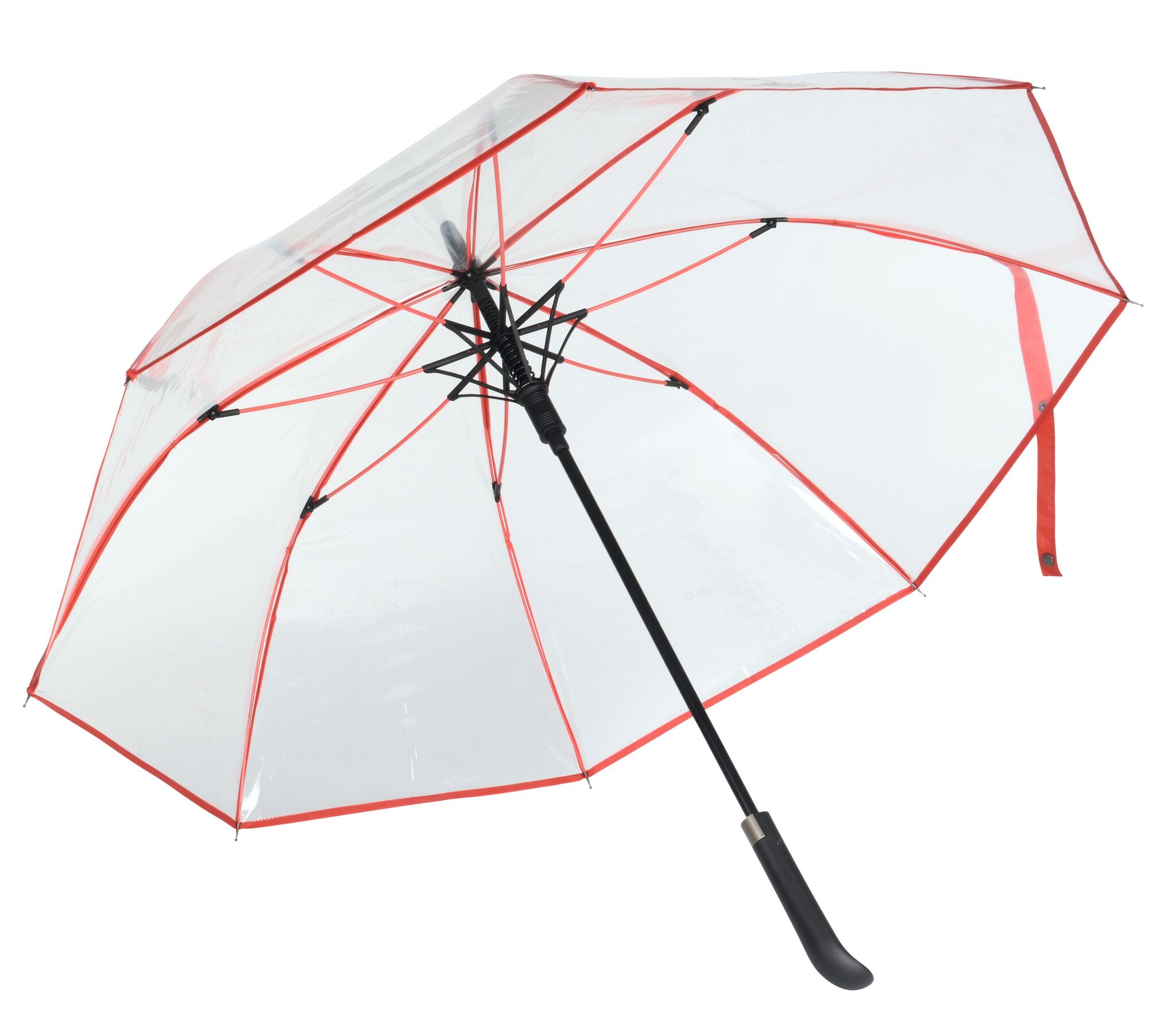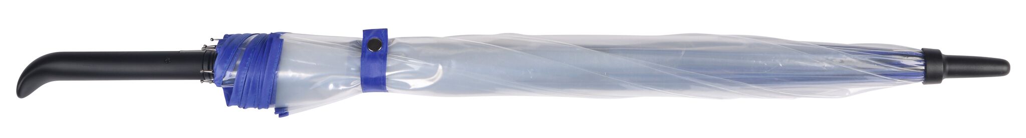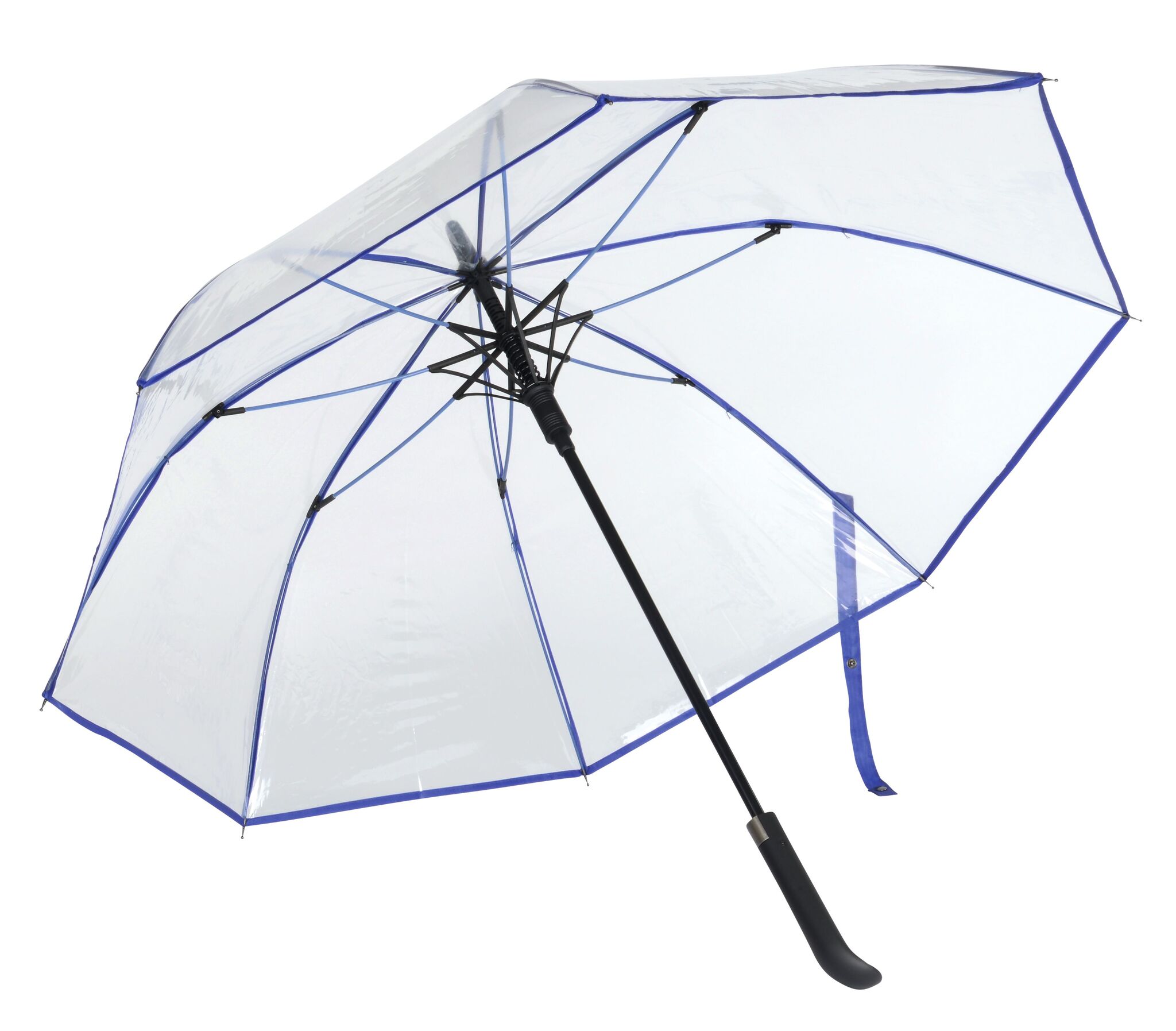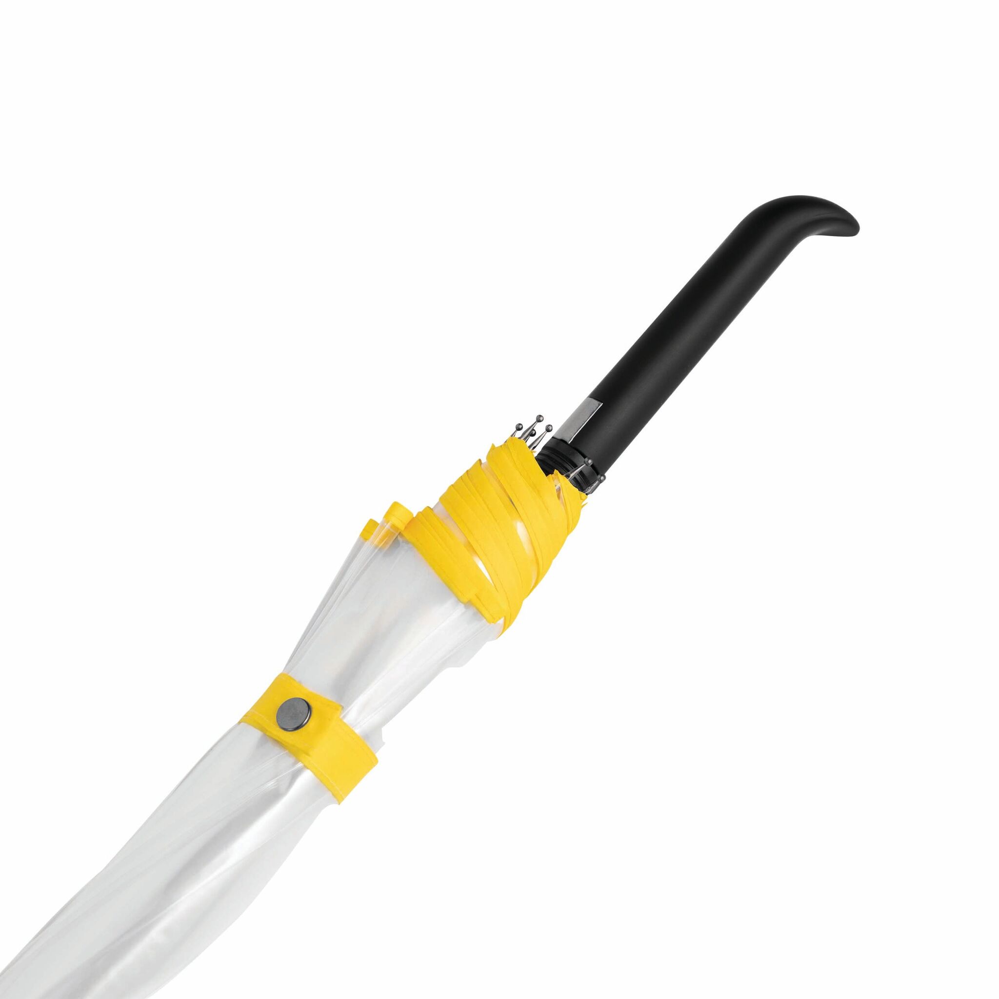 Автоматический зонт VIP : металлический стержень, цветные спицы из стекловолокна с металлическими наконечниками, пластиковая верхушка, пластиковая ручка со встроенной кнопкой откр./закр., прозрачный купол POE с цветной окантовкой, ремешок с кнопочной застёжкой