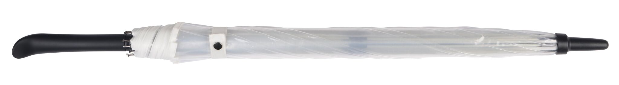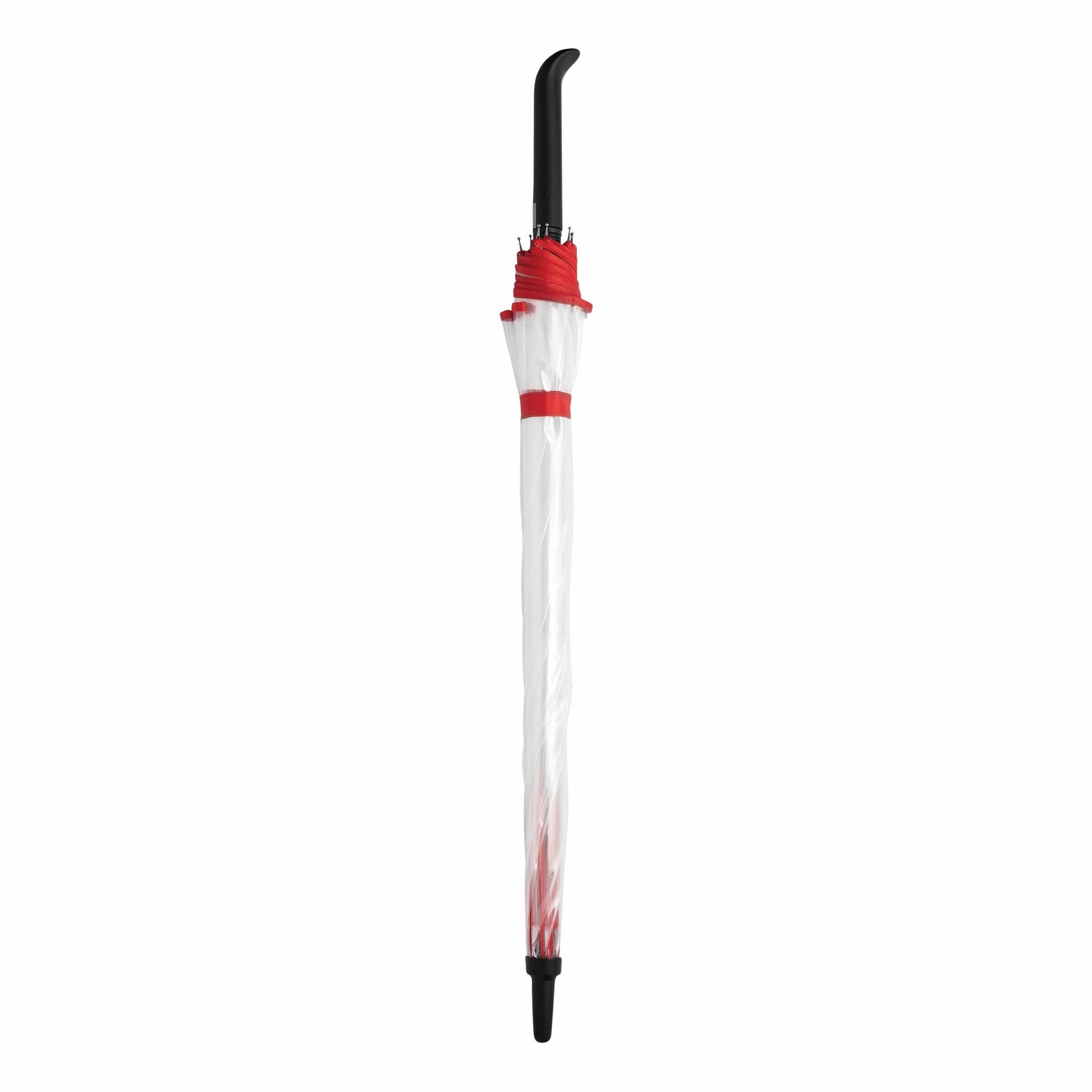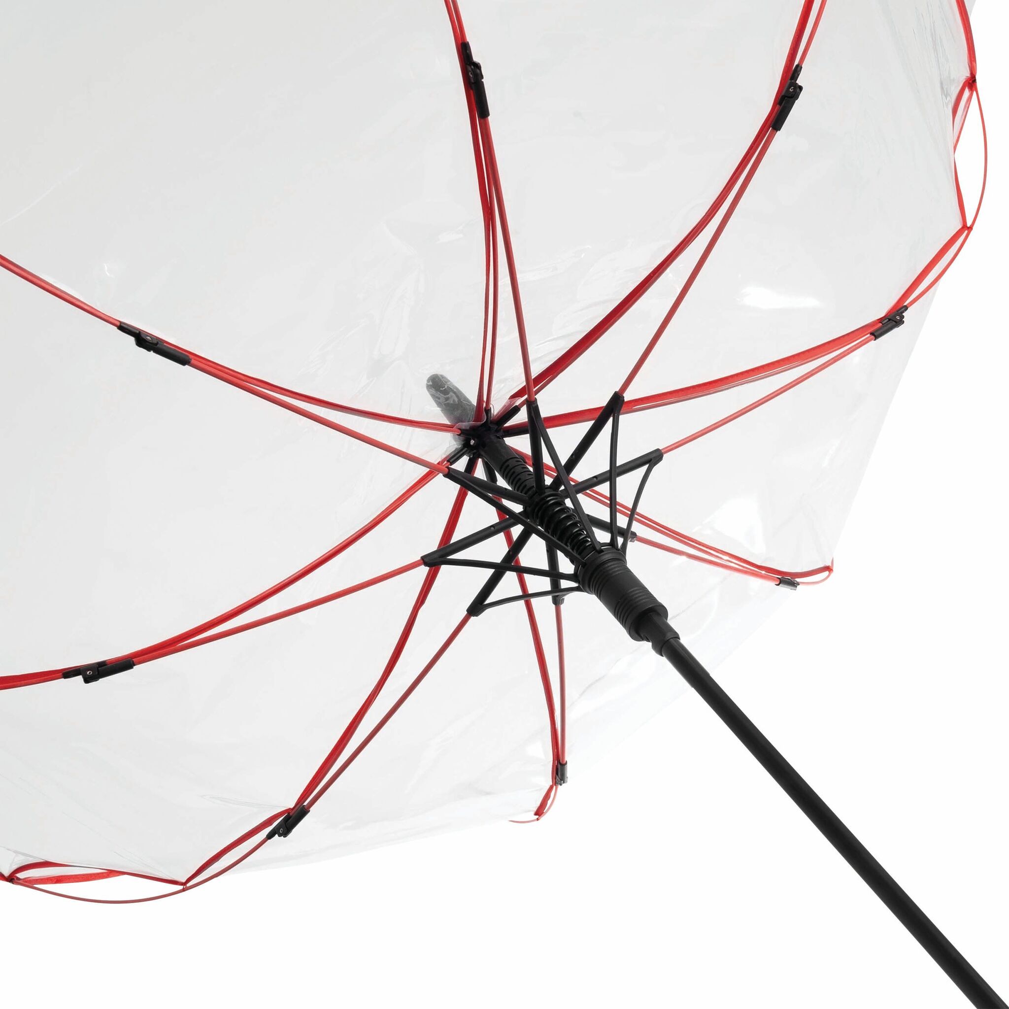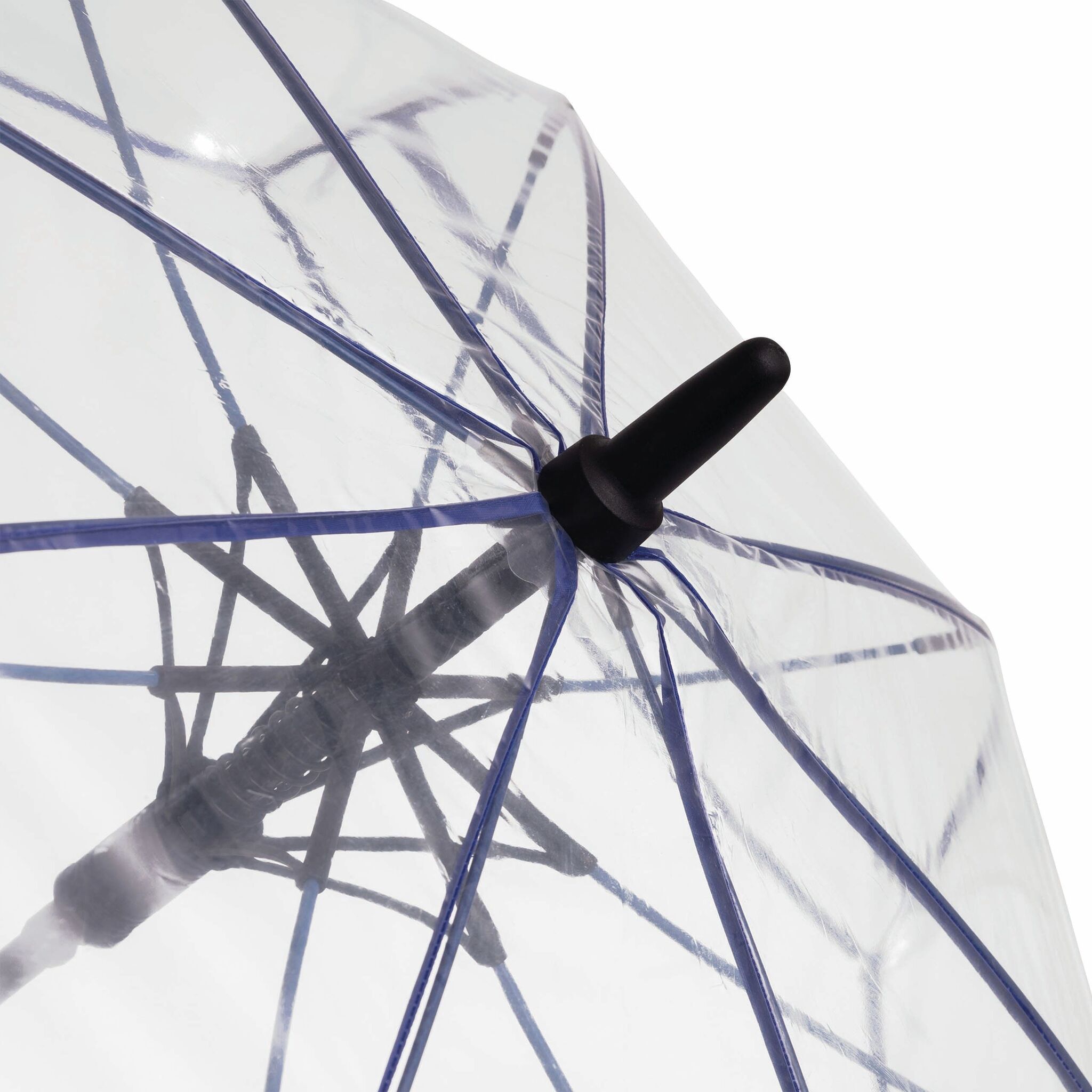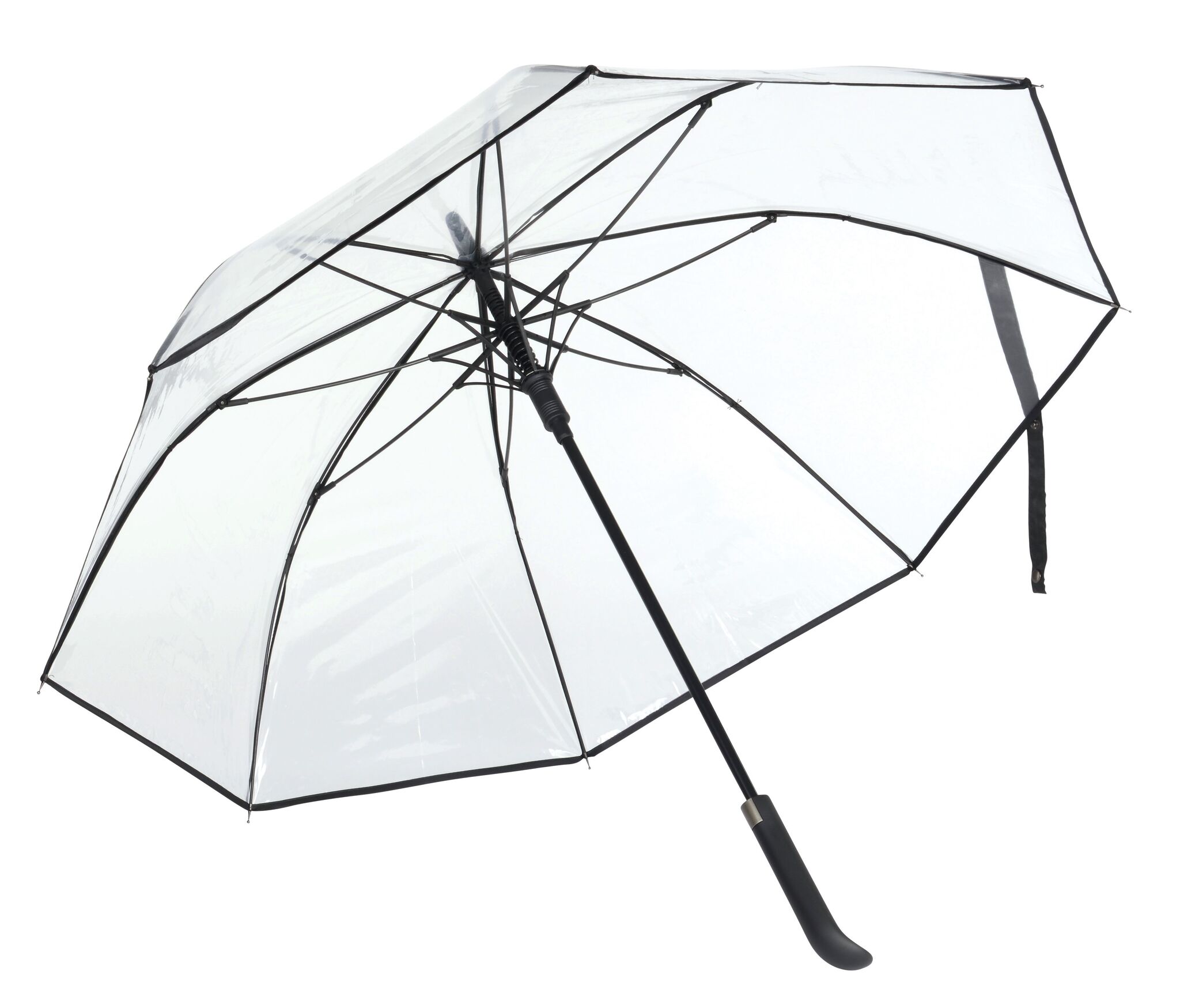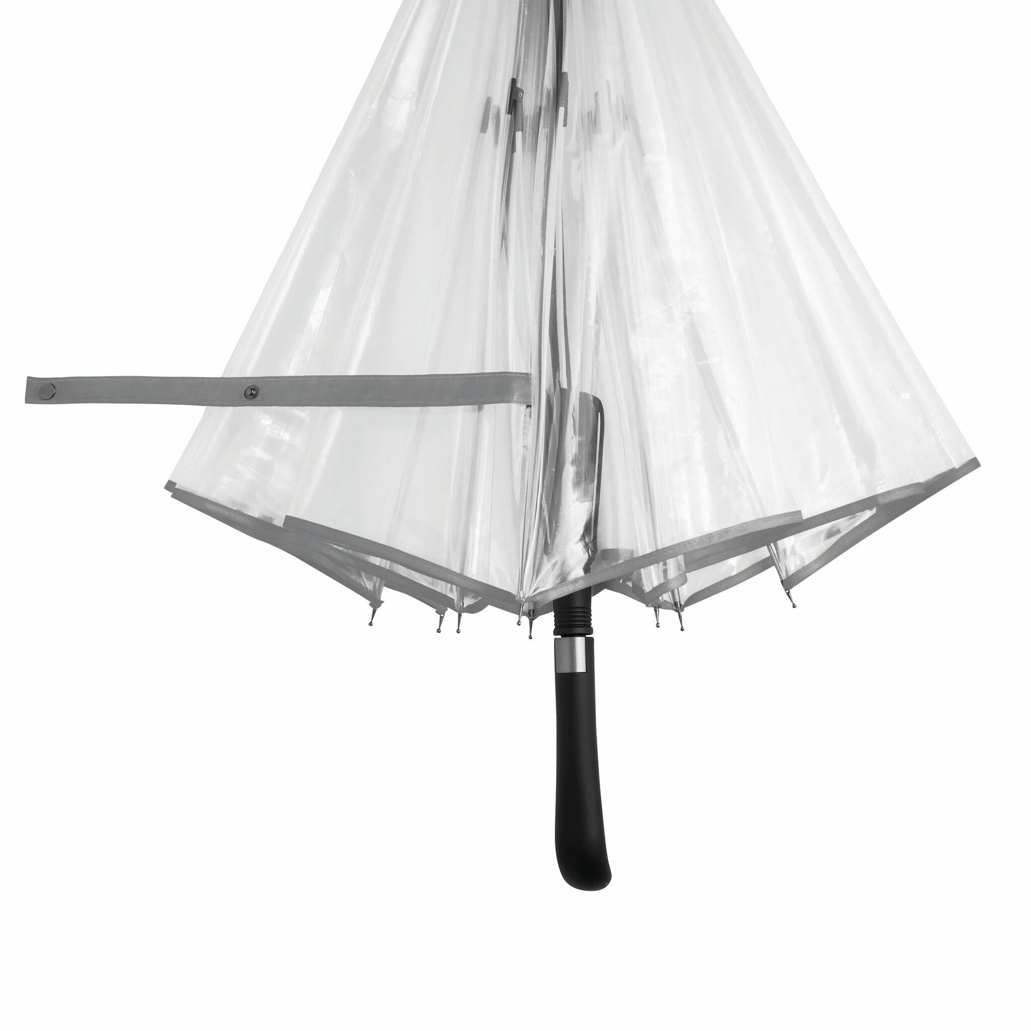 Автоматический зонт VIP : металлический стержень, цветные спицы из стекловолокна с металлическими наконечниками, пластиковая верхушка, пластиковая ручка со встроенной кнопкой откр./закр., прозрачный купол POE с цветной окантовкой, ремешок с кнопочной застёжкой
