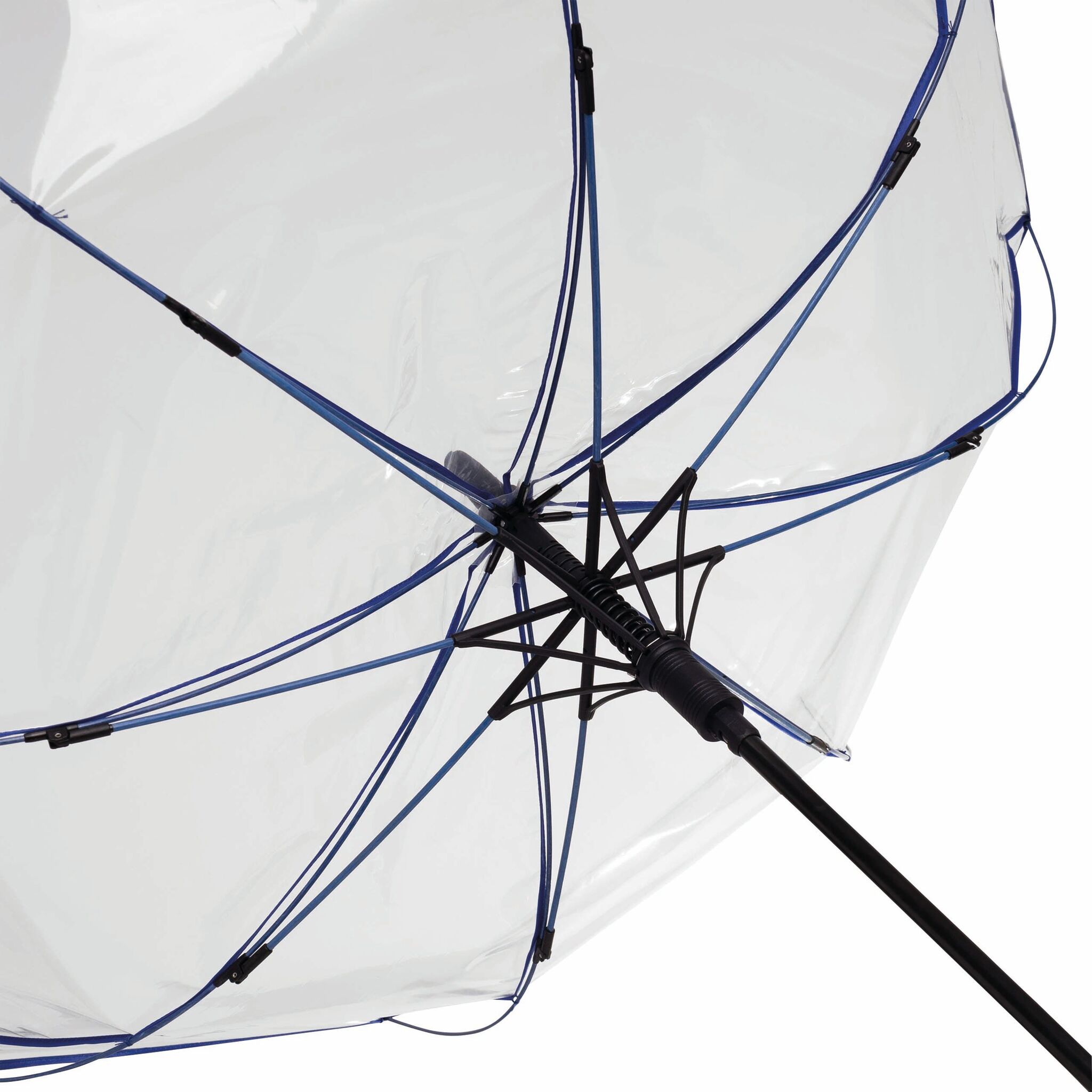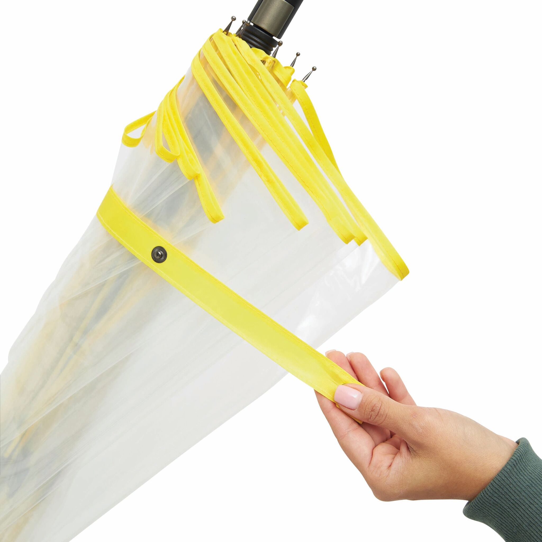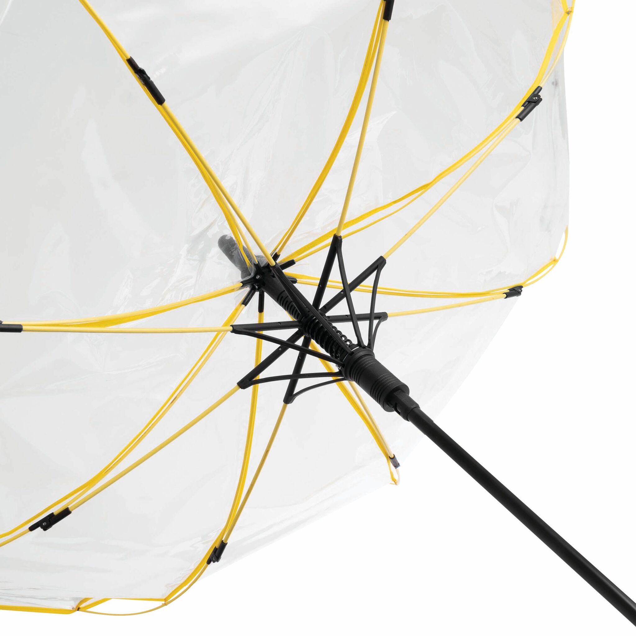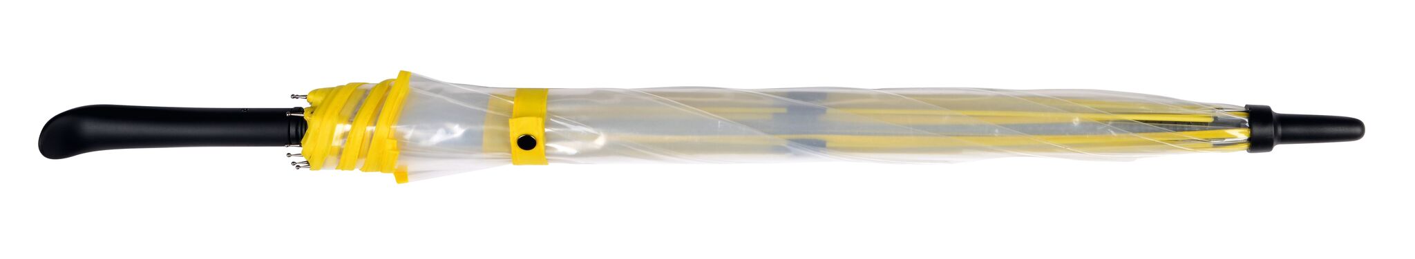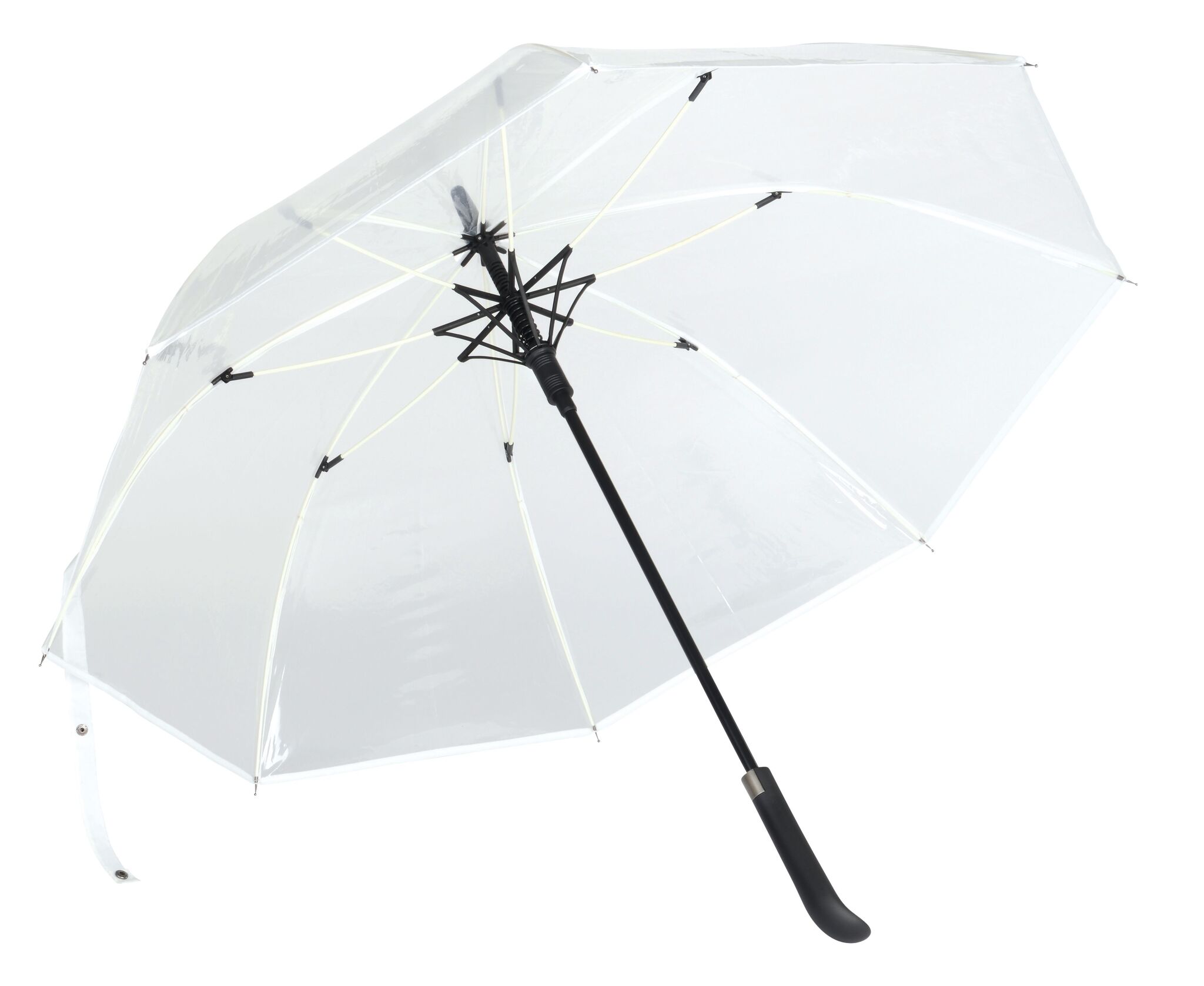 Автоматический зонт VIP : металлический стержень, цветные спицы из стекловолокна с металлическими наконечниками, пластиковая верхушка, пластиковая ручка со встроенной кнопкой откр./закр., прозрачный купол POE с цветной окантовкой, ремешок с кнопочной застёжкой