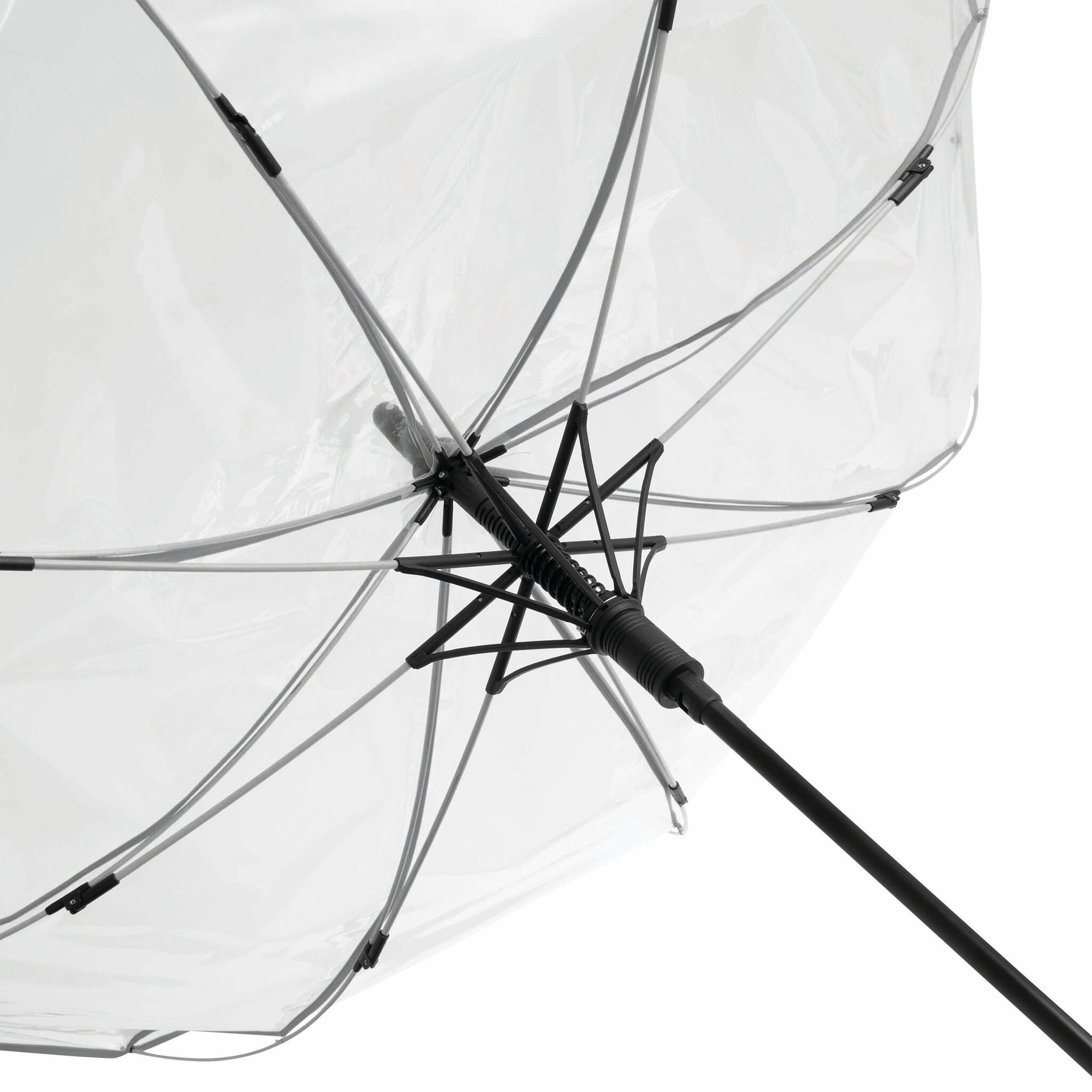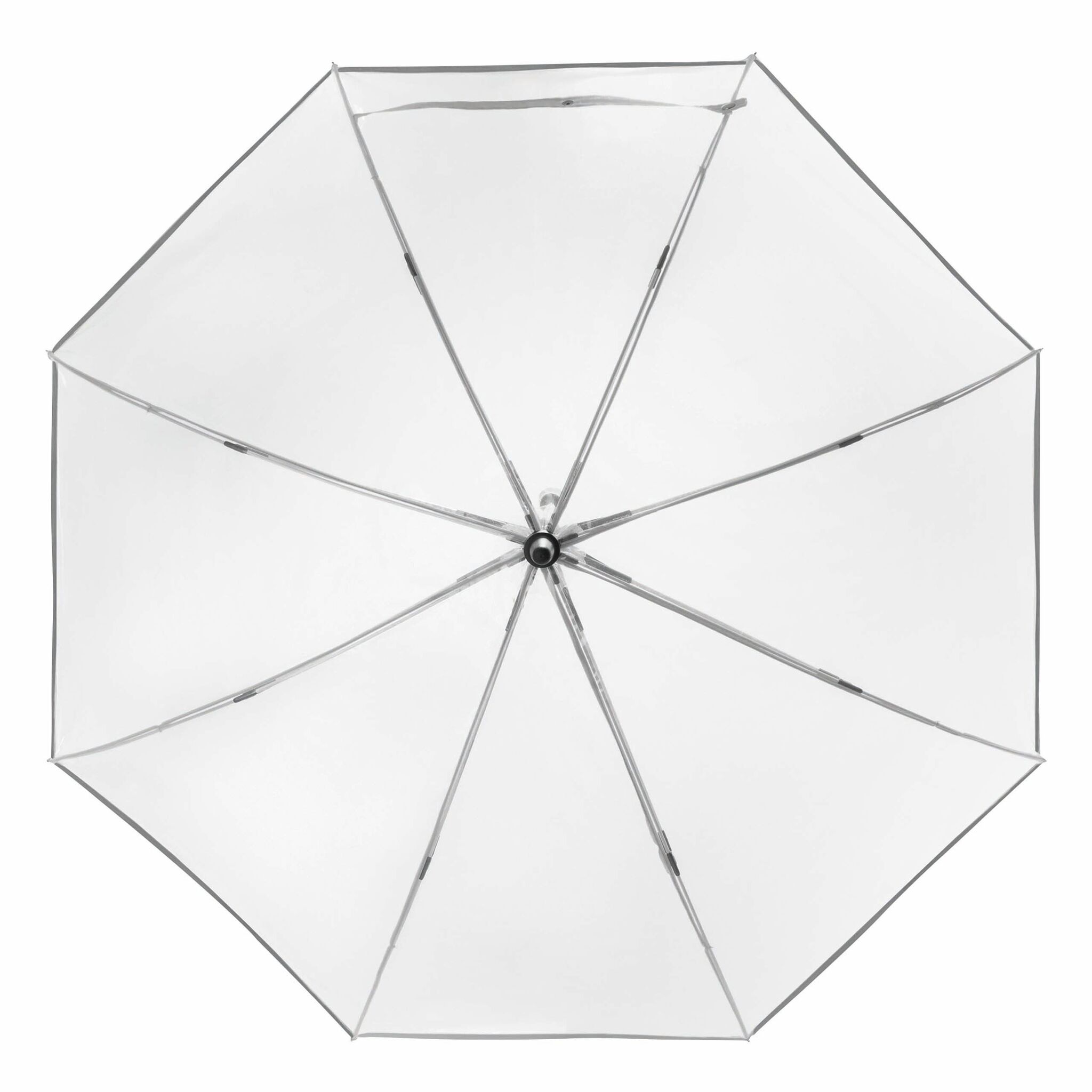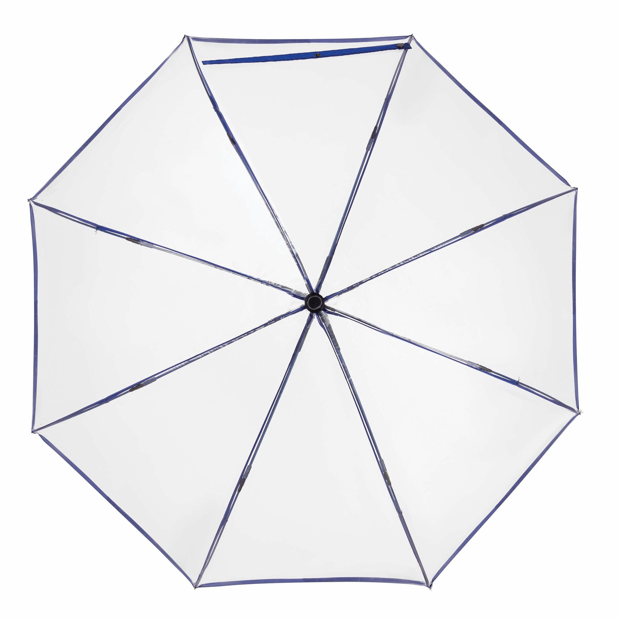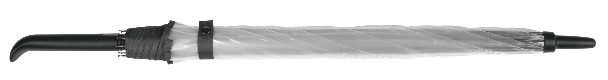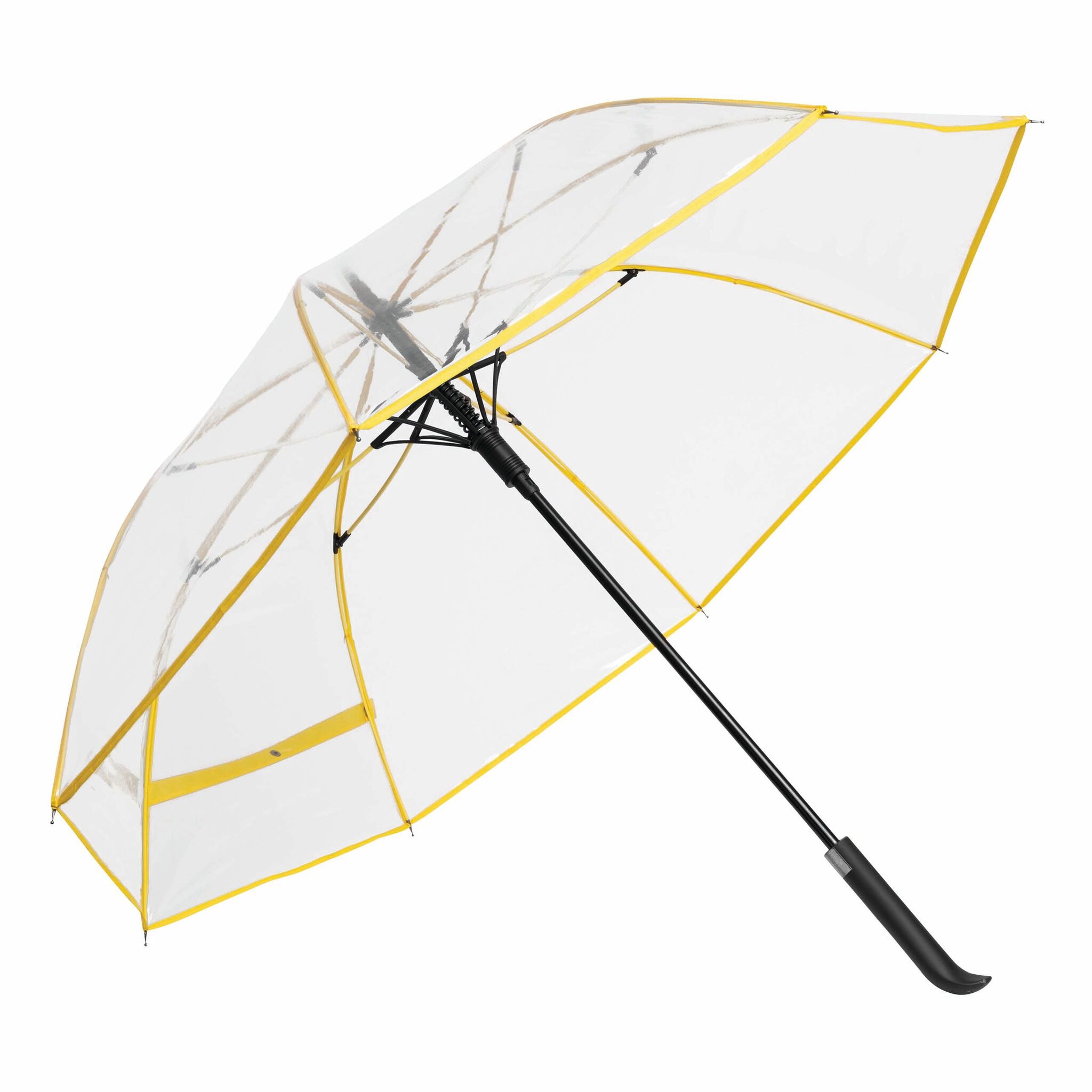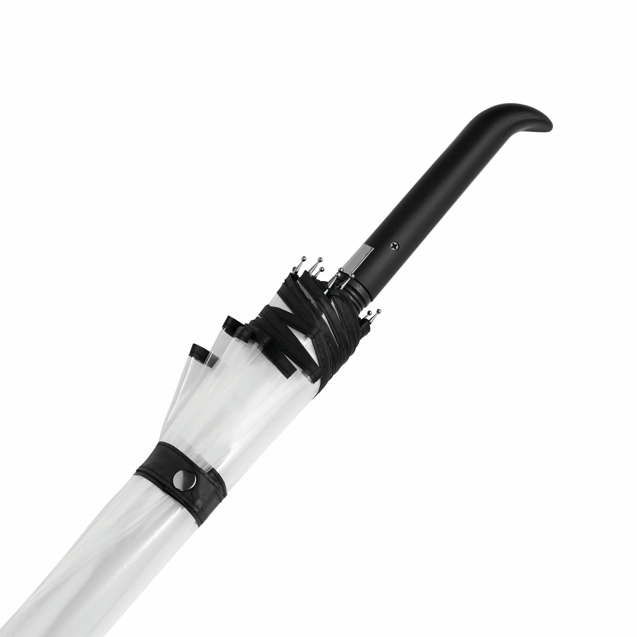 Автоматический зонт VIP : металлический стержень, цветные спицы из стекловолокна с металлическими наконечниками, пластиковая верхушка, пластиковая ручка со встроенной кнопкой откр./закр., прозрачный купол POE с цветной окантовкой, ремешок с кнопочной застёжкой