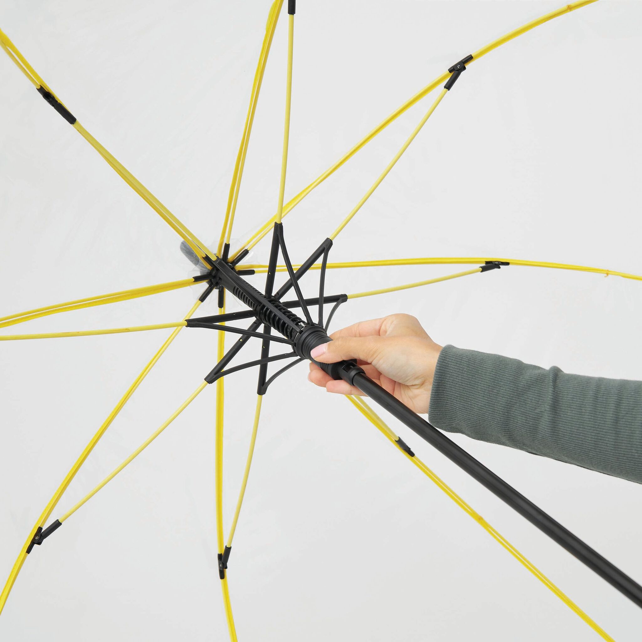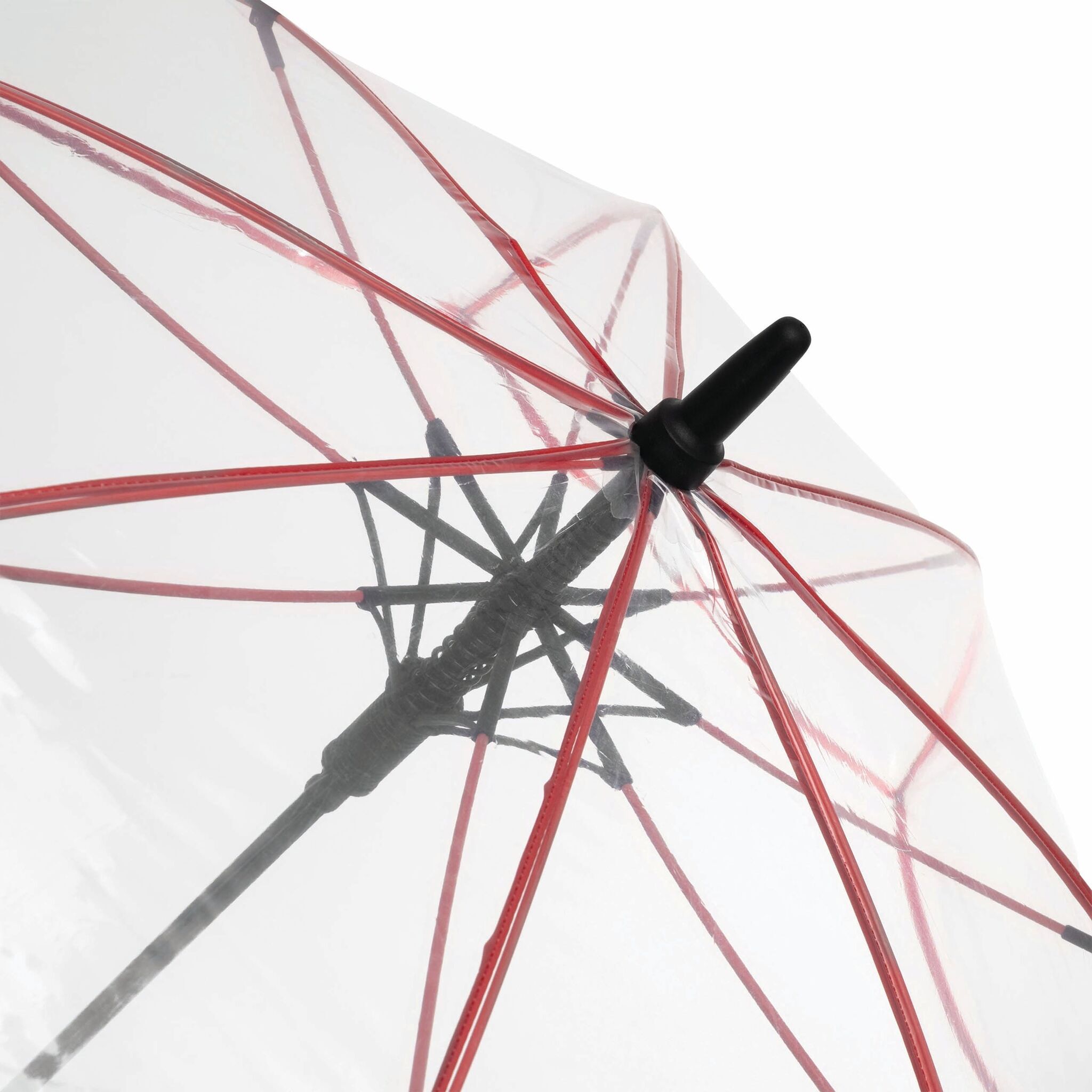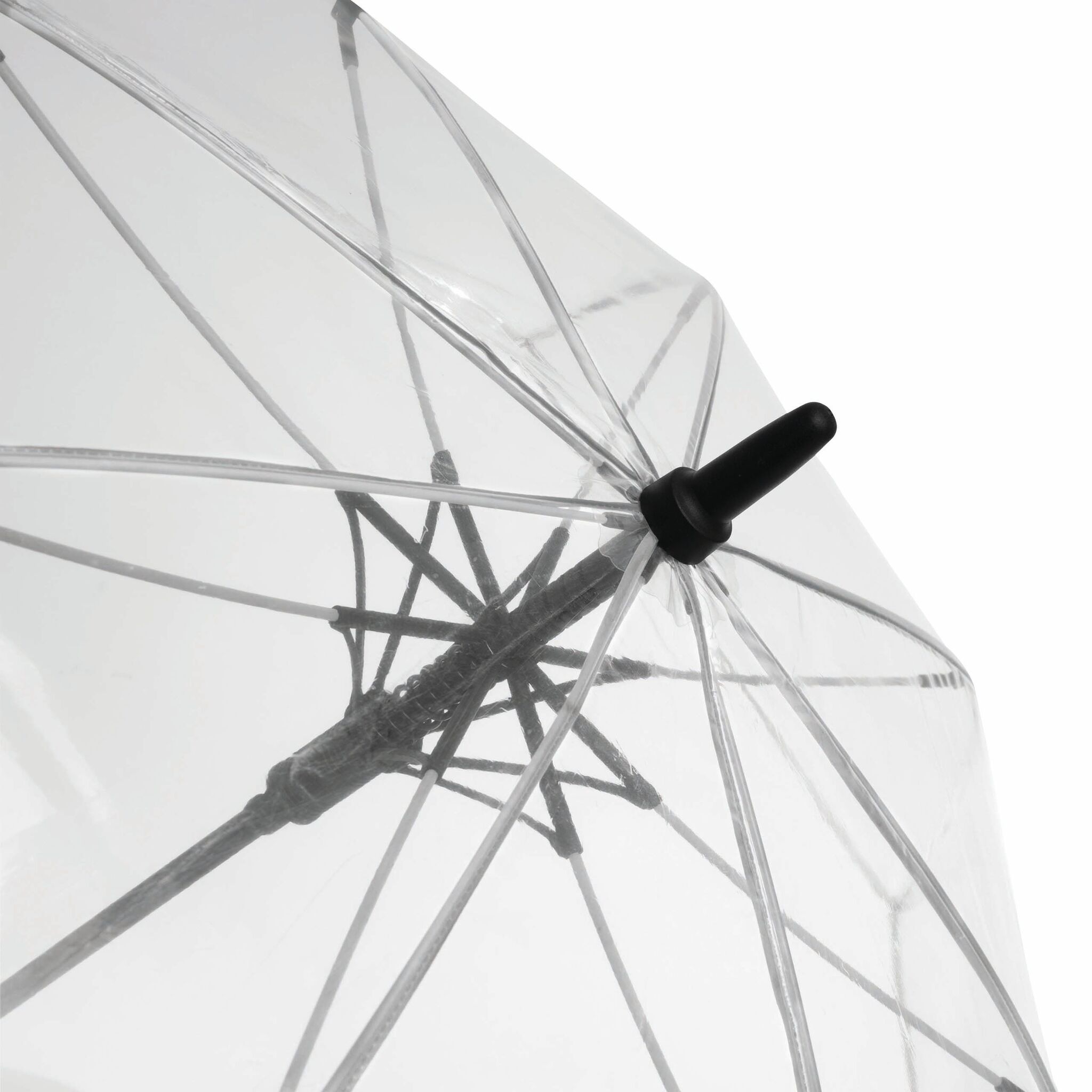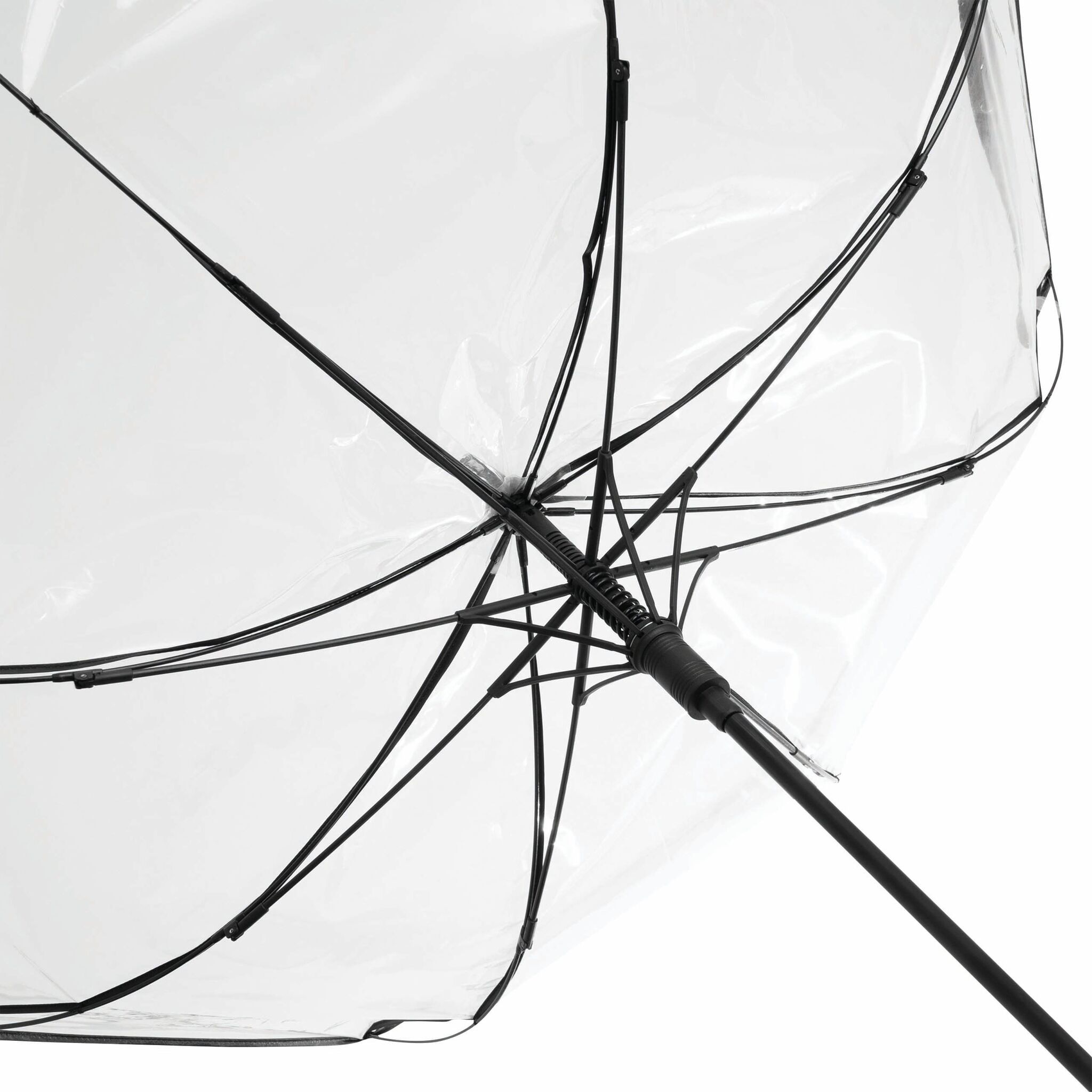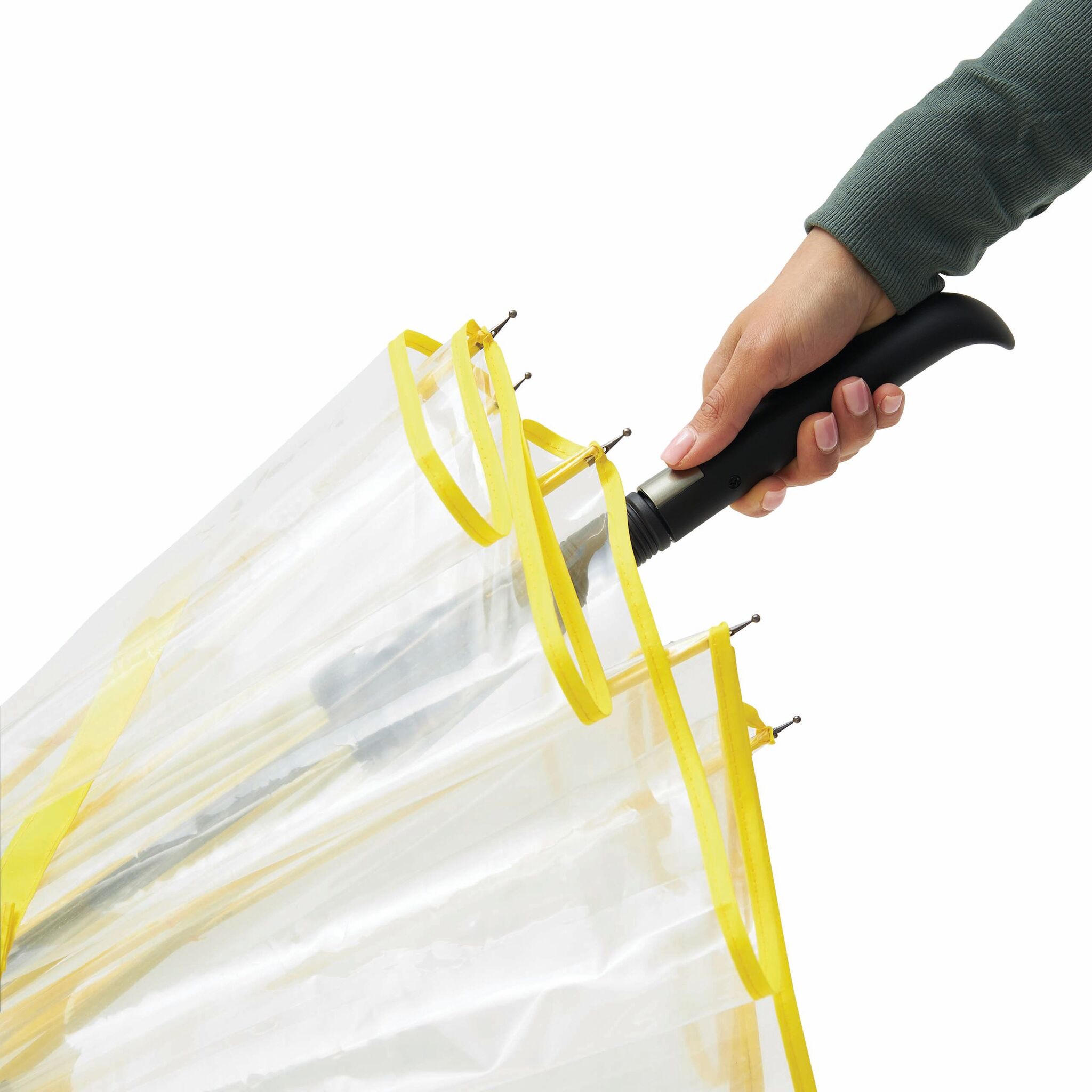 Автоматический зонт VIP : металлический стержень, цветные спицы из стекловолокна с металлическими наконечниками, пластиковая верхушка, пластиковая ручка со встроенной кнопкой откр./закр., прозрачный купол POE с цветной окантовкой, ремешок с кнопочной застёжкой