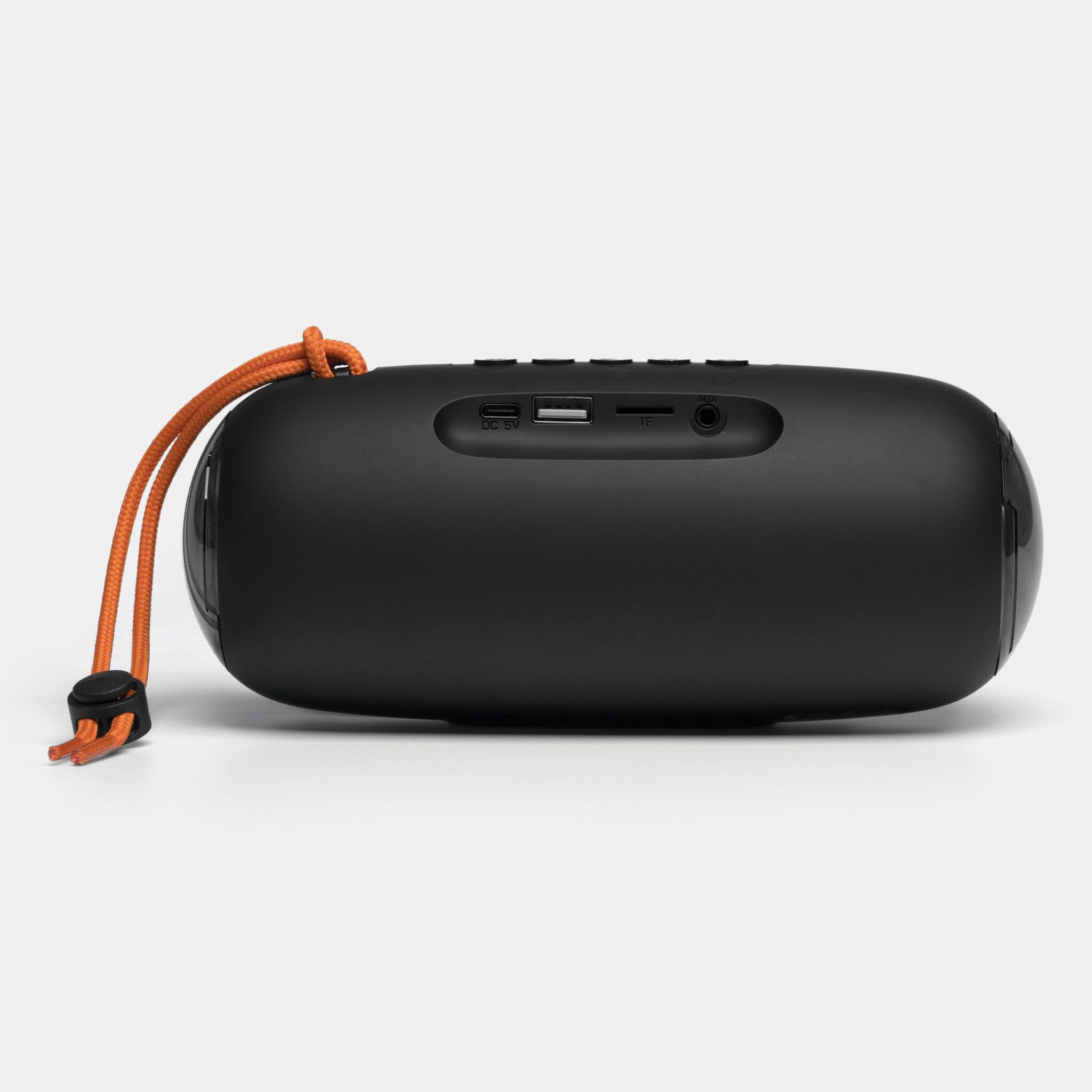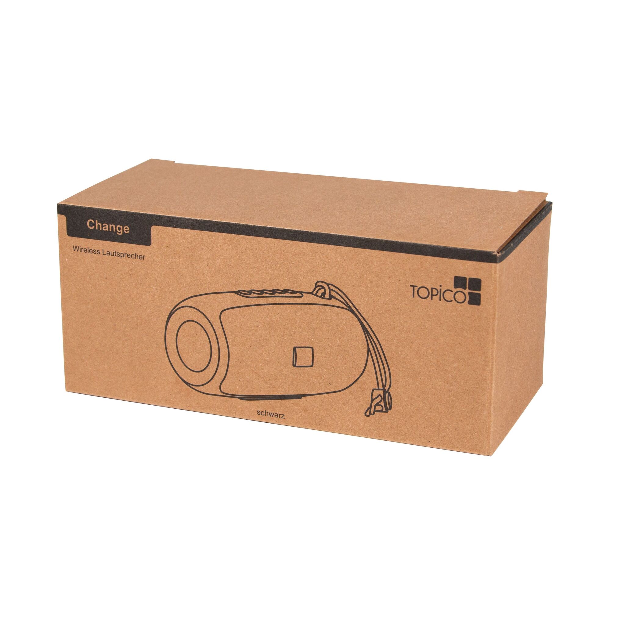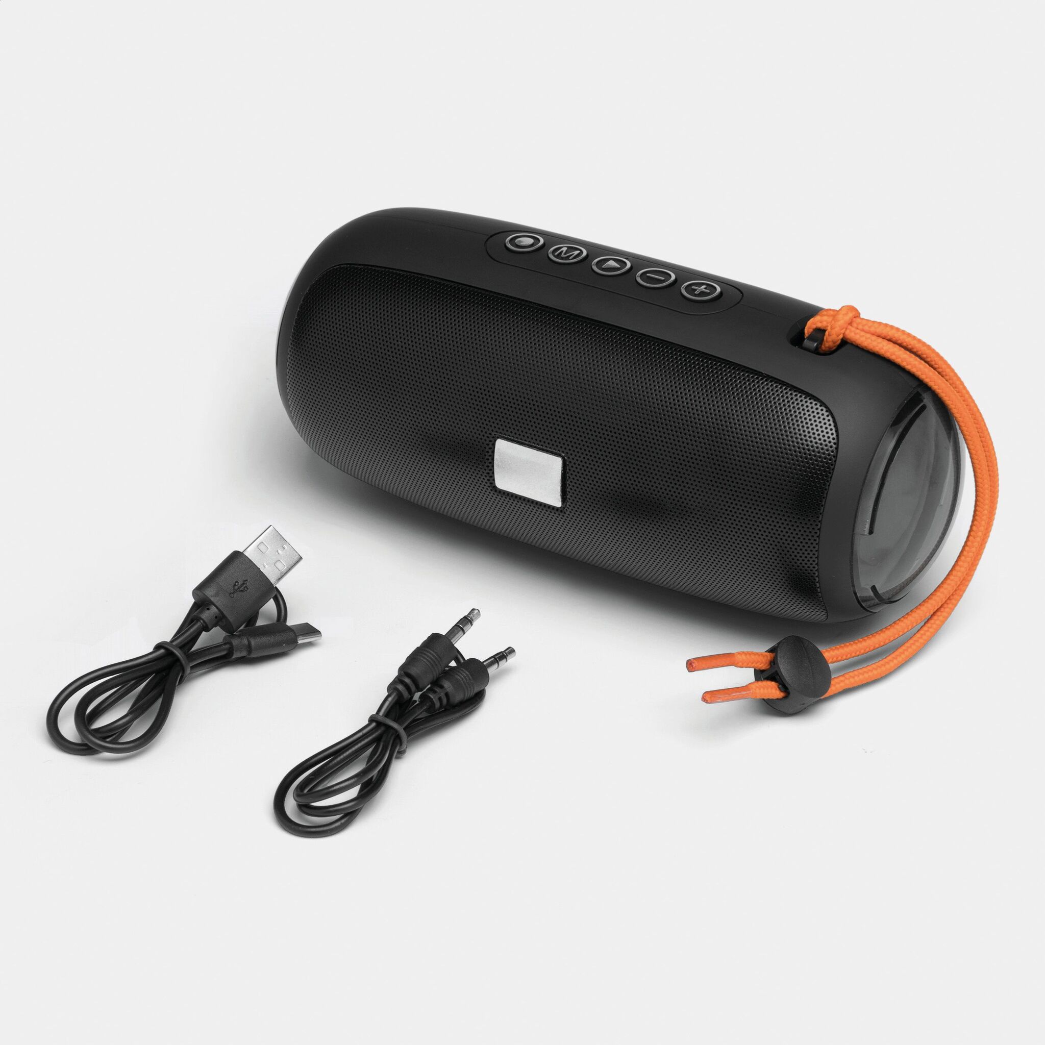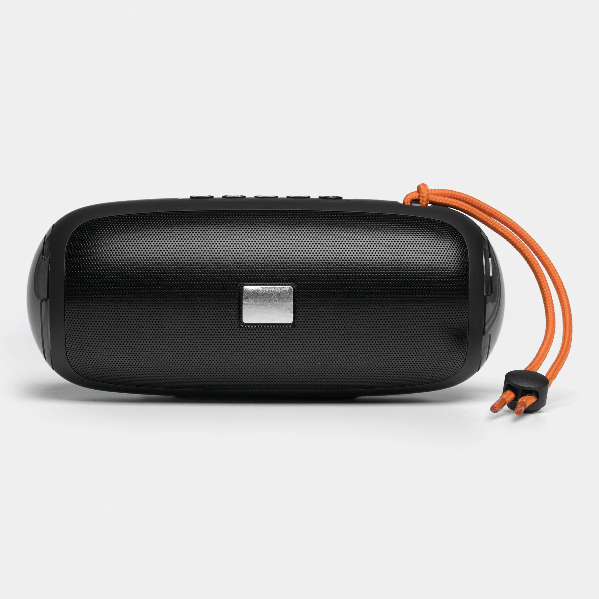 Беспроводная колонка LED CHANGE : с изменяющейся цветной светодиодной подсветкой, музыкальной мощностью 2x5 Вт, для сопряжения со смартфоном, планшетом или компьютером, с возможностью подключения к внешним устройствам через разъем AUX-IN, возможность воспроизведения MP3 через USB и карту MiroSD, громкая связь, с функцией FM-радио, мощный аккумулятор, емкость: 1200 мАч, время работы: около 2-3 часов, время зарядки: около 2 часов, максимальный радиус действия: около 10 м, в комплекте кабель для USB-зарядки с разъемом USB типа C (длина: прибл. 51 см), в комплекте небольшая пластина для гравировки, оранжевый ремешок, нескользящая ножка
