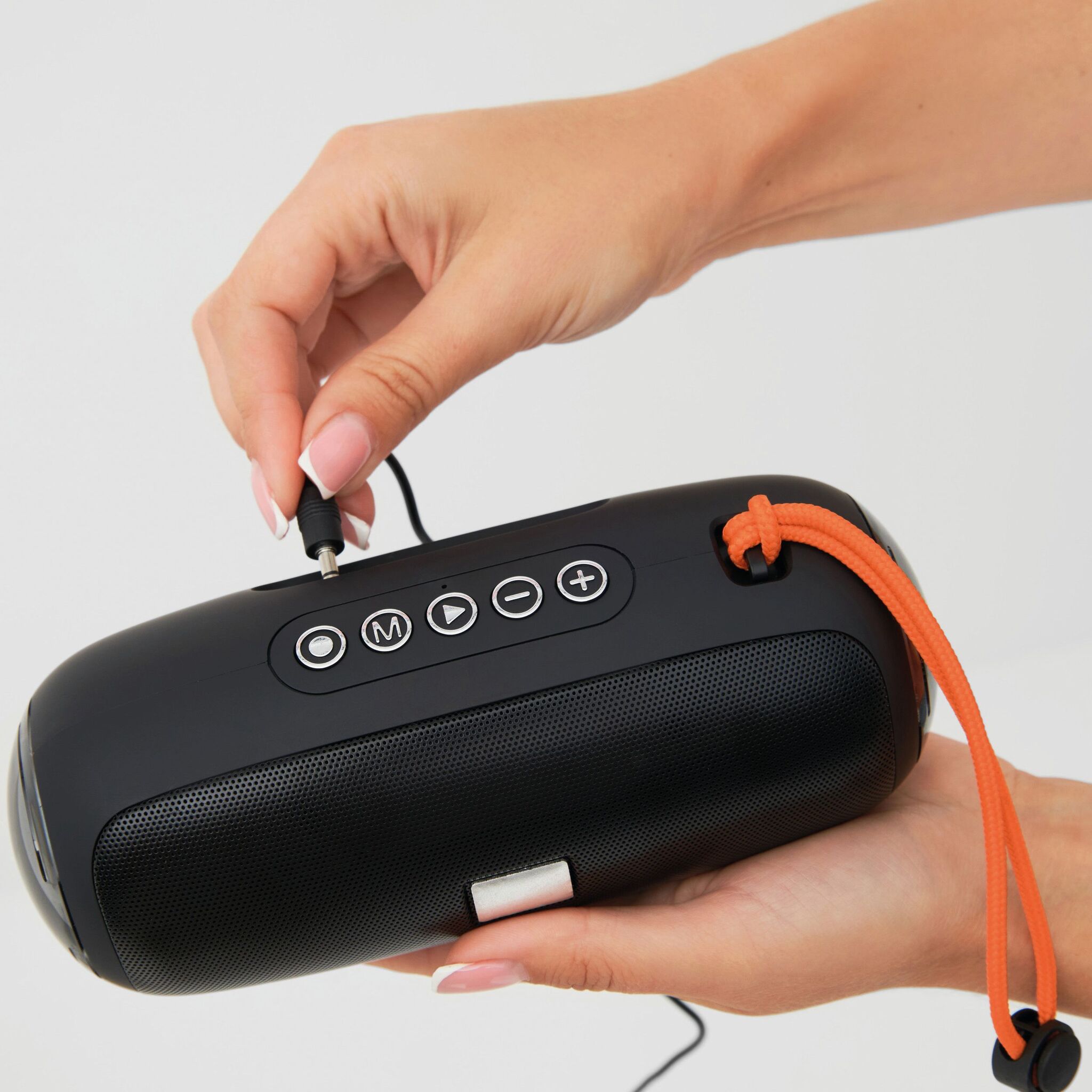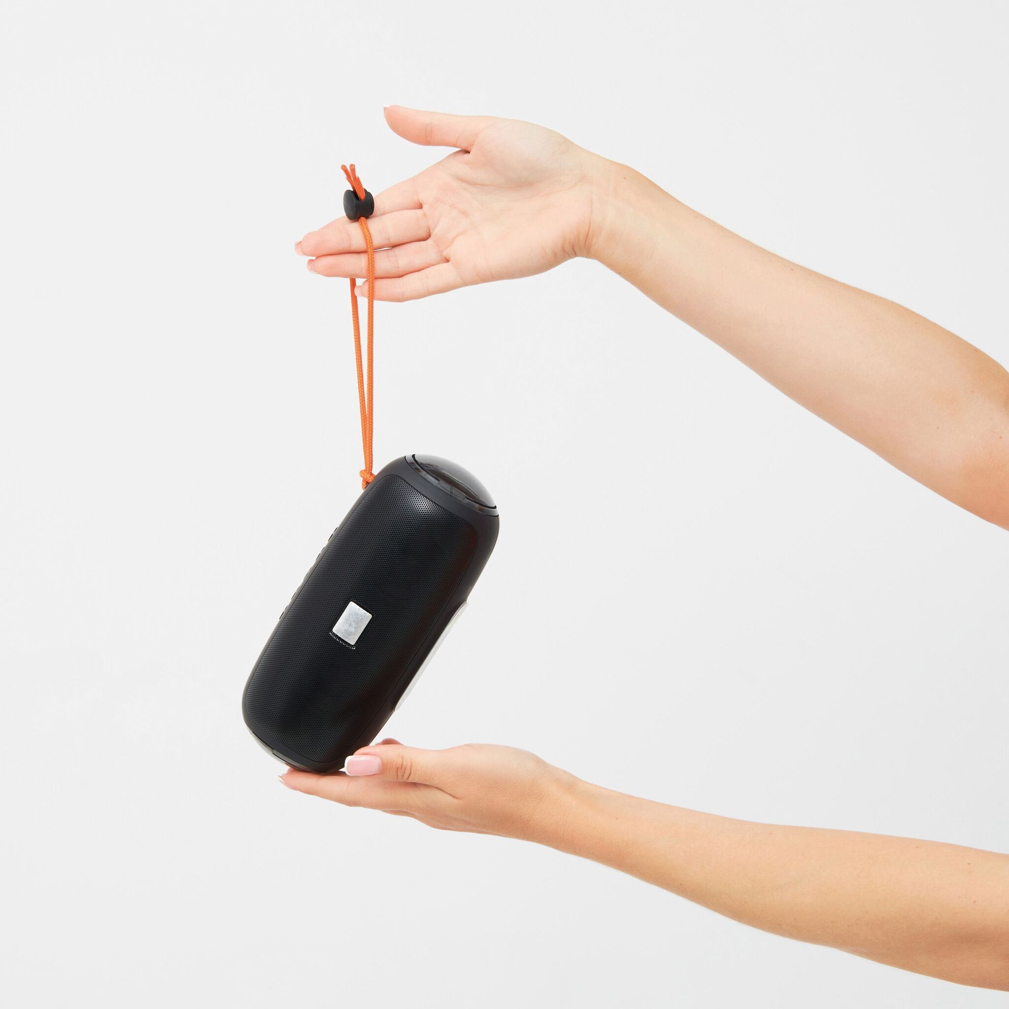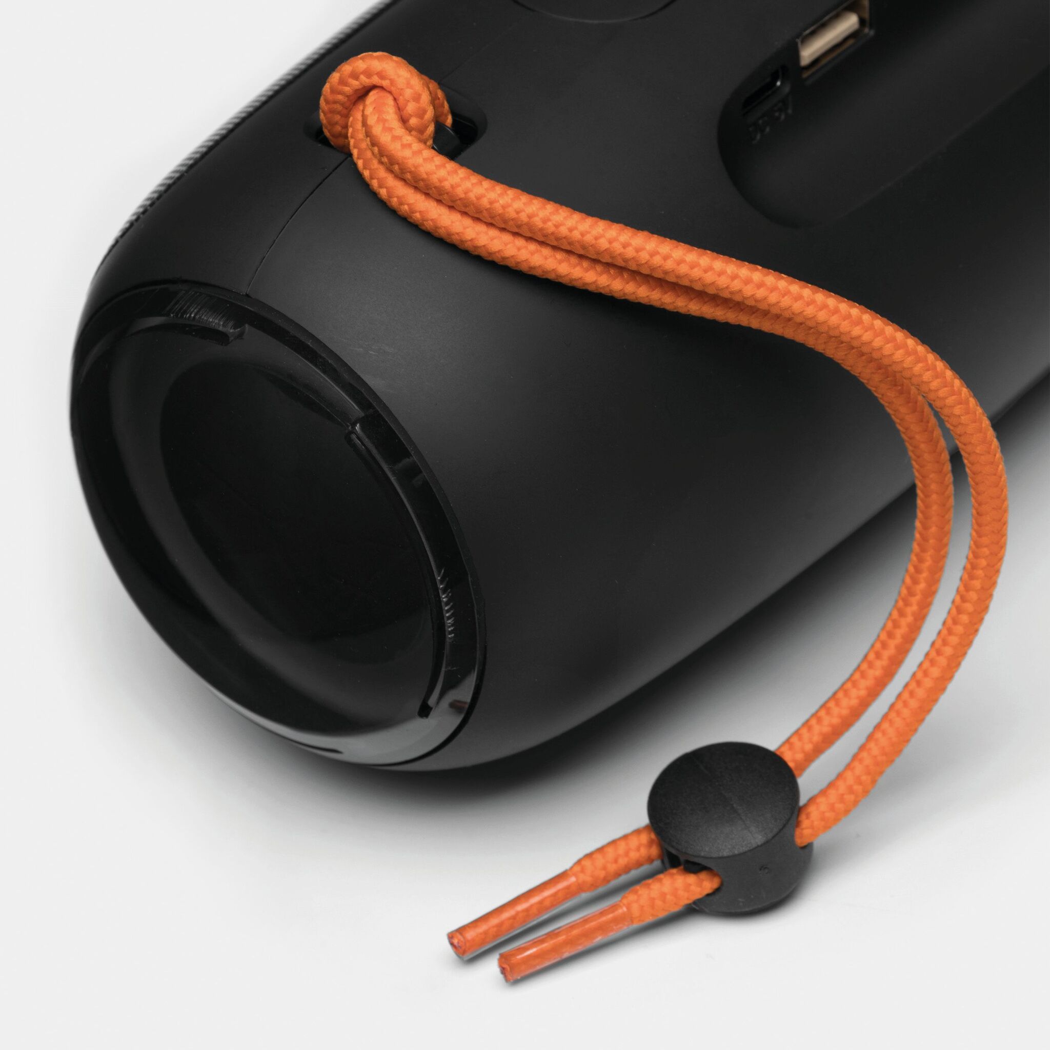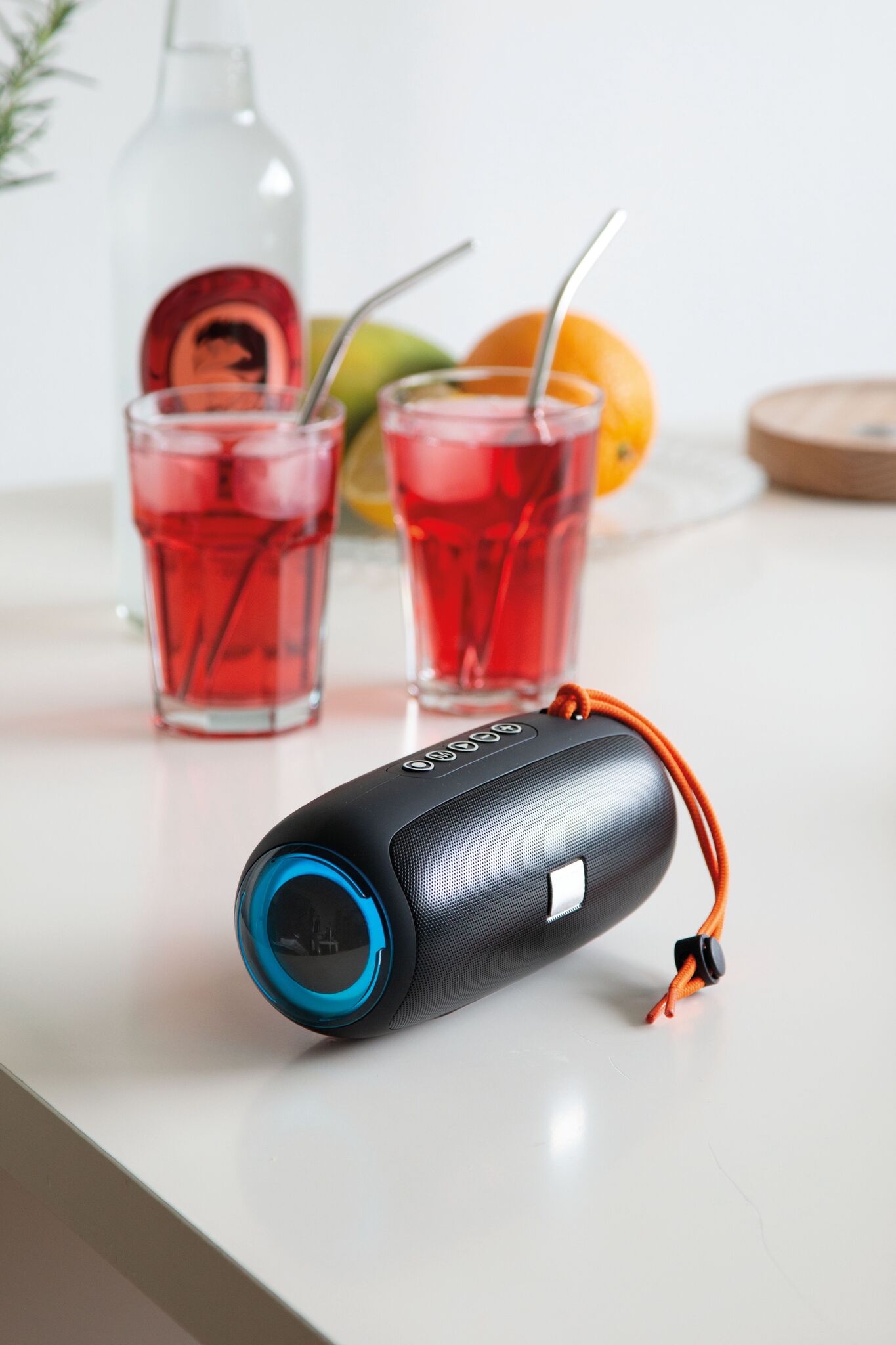 Беспроводная колонка LED CHANGE : с изменяющейся цветной светодиодной подсветкой, музыкальной мощностью 2x5 Вт, для сопряжения со смартфоном, планшетом или компьютером, с возможностью подключения к внешним устройствам через разъем AUX-IN, возможность воспроизведения MP3 через USB и карту MiroSD, громкая связь, с функцией FM-радио, мощный аккумулятор, емкость: 1200 мАч, время работы: около 2-3 часов, время зарядки: около 2 часов, максимальный радиус действия: около 10 м, в комплекте кабель для USB-зарядки с разъемом USB типа C (длина: прибл. 51 см), в комплекте небольшая пластина для гравировки, оранжевый ремешок, нескользящая ножка