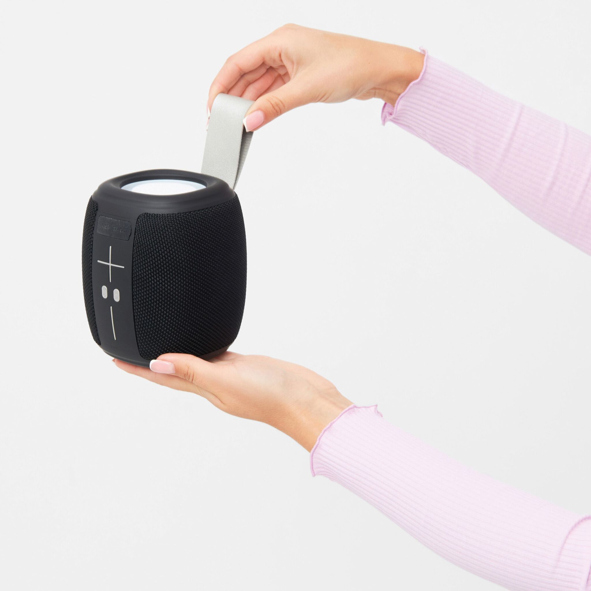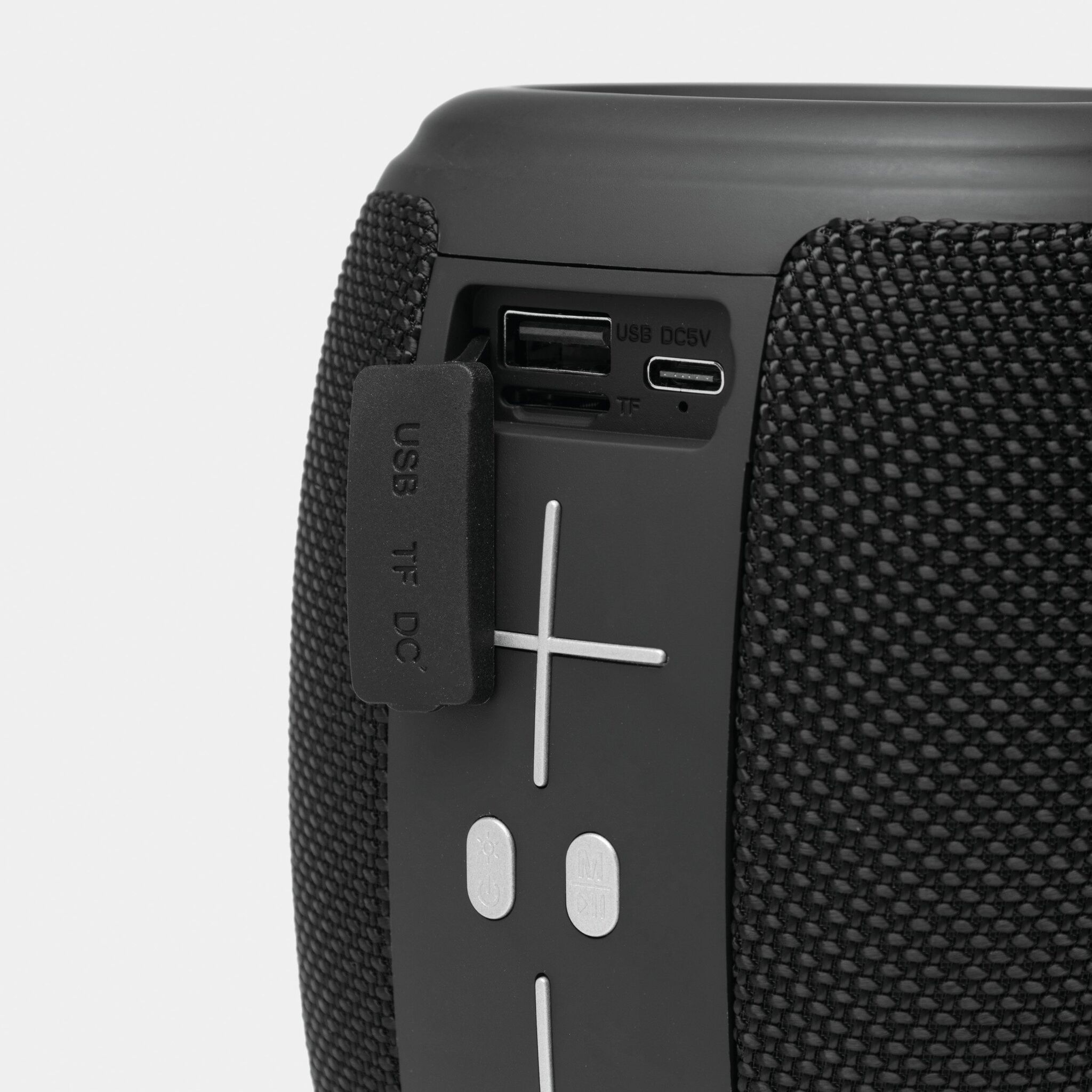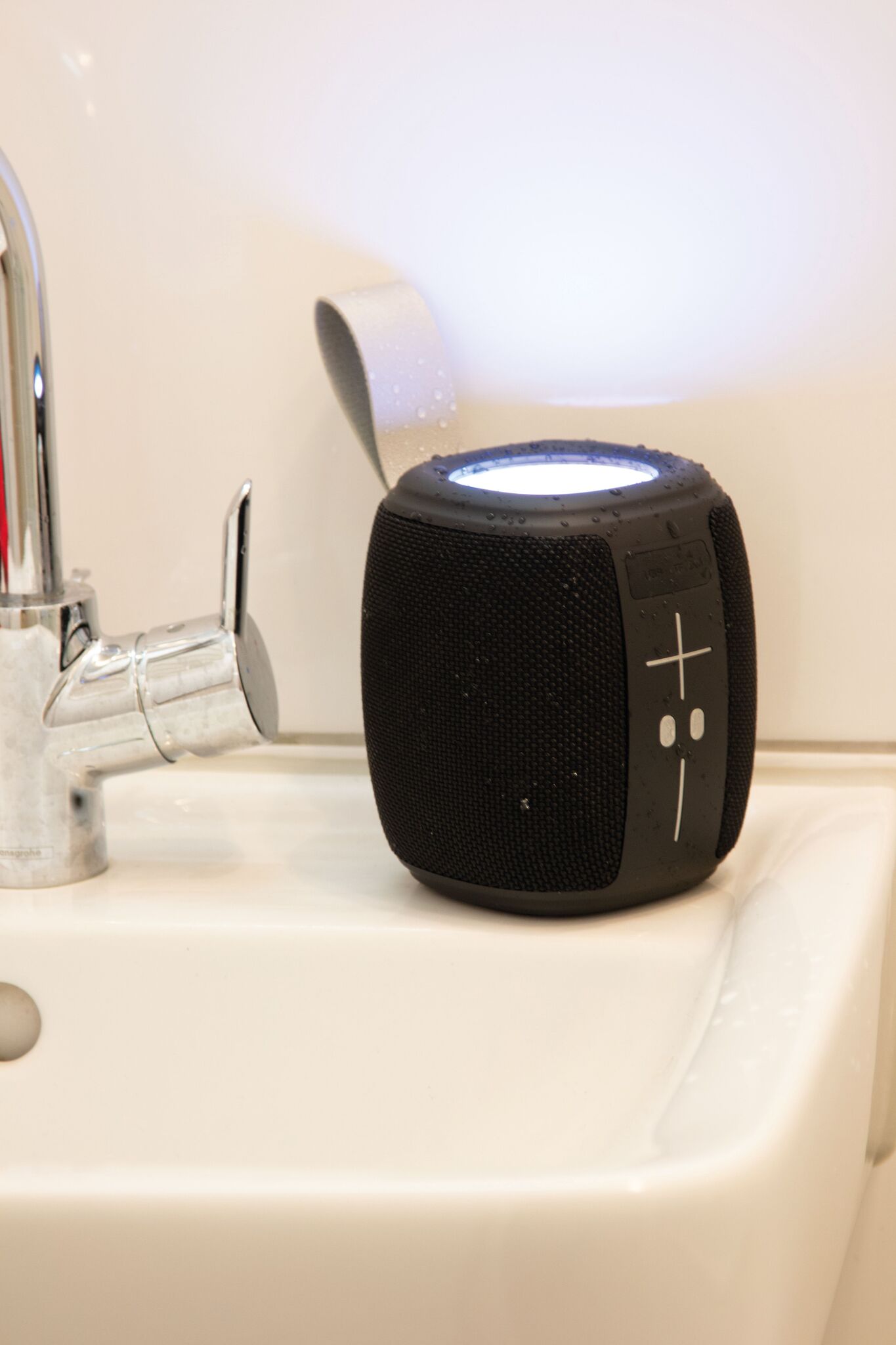 Беспроводная колонка RESISTANT : с изменяющей цвет подсветкой, защита от брызг по стандарту IPX4, музыкальный выход 1x10 Вт, возможность сопряжения со смартфоном, планшетом или компьютером, воспроизведение файлов MP3 с USB-накопителя и карты microSD, громкая связь, мощный аккумулятор, емкость: 1200 мАч, время работы: около 2-3 часов, время зарядки: около 2 часов, максимальный радиус действия: около 10 м, вкл. USB-кабель для зарядки с разъемом USB C (длина ок. 49 см), серый ремень для переноски, 2 нескользящие ножки
