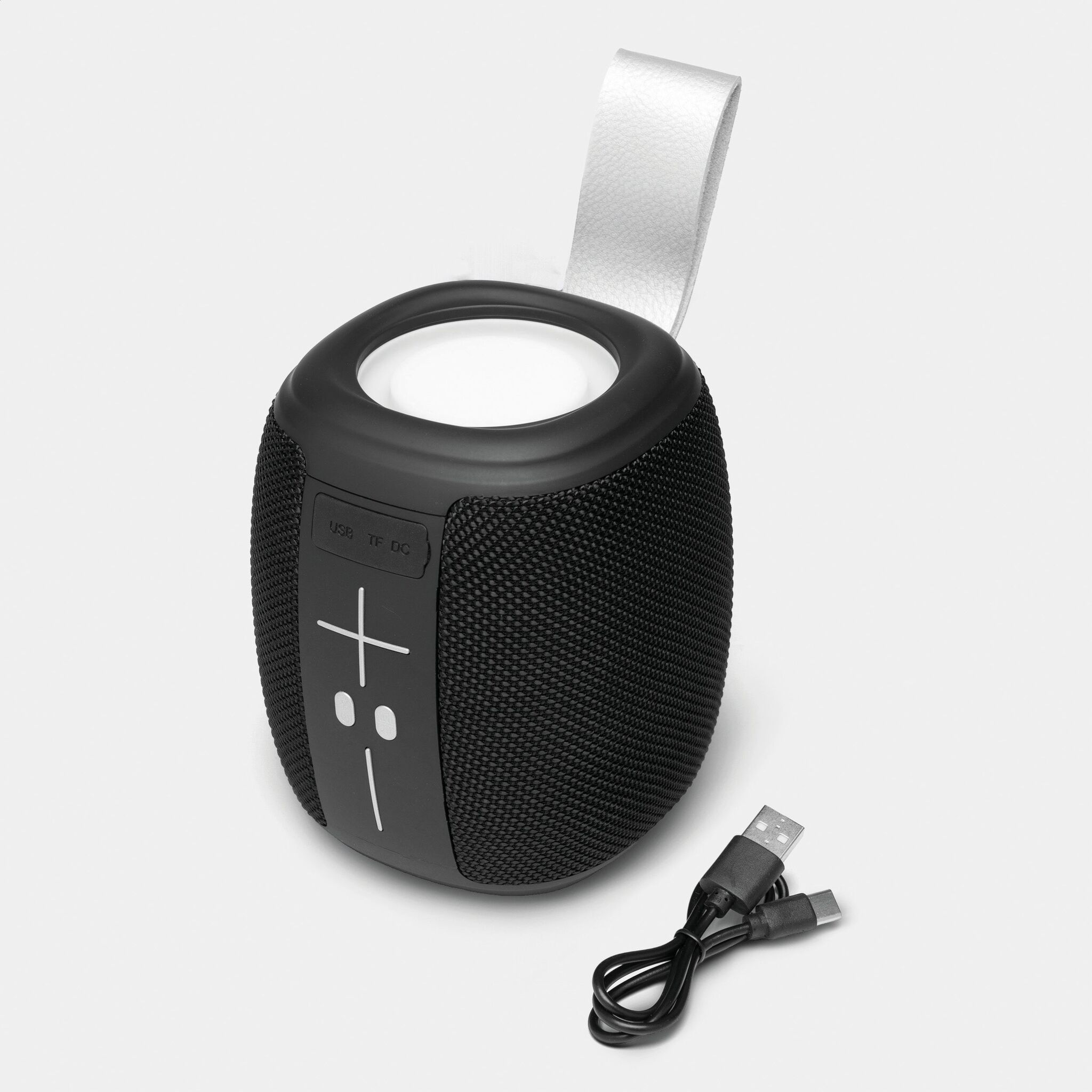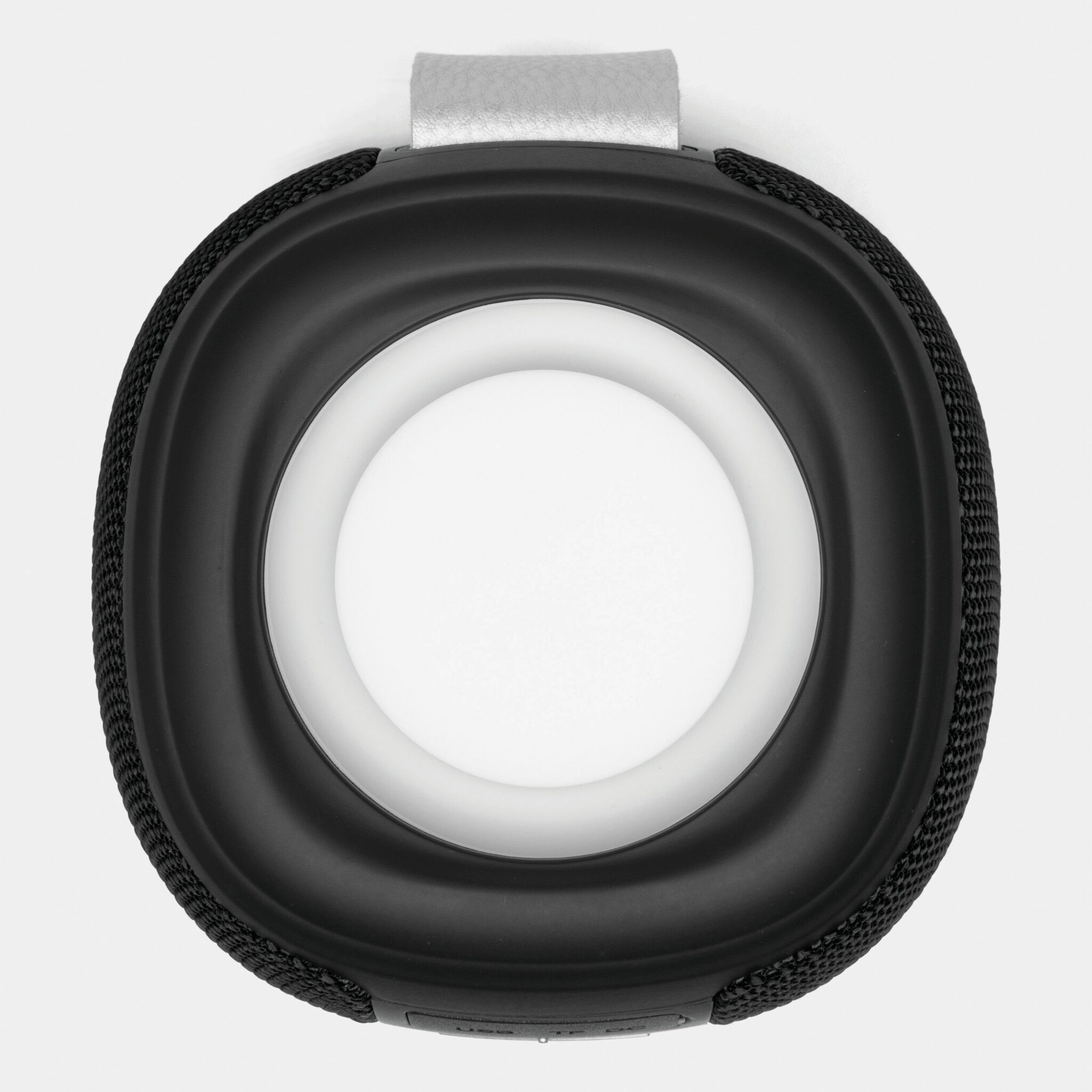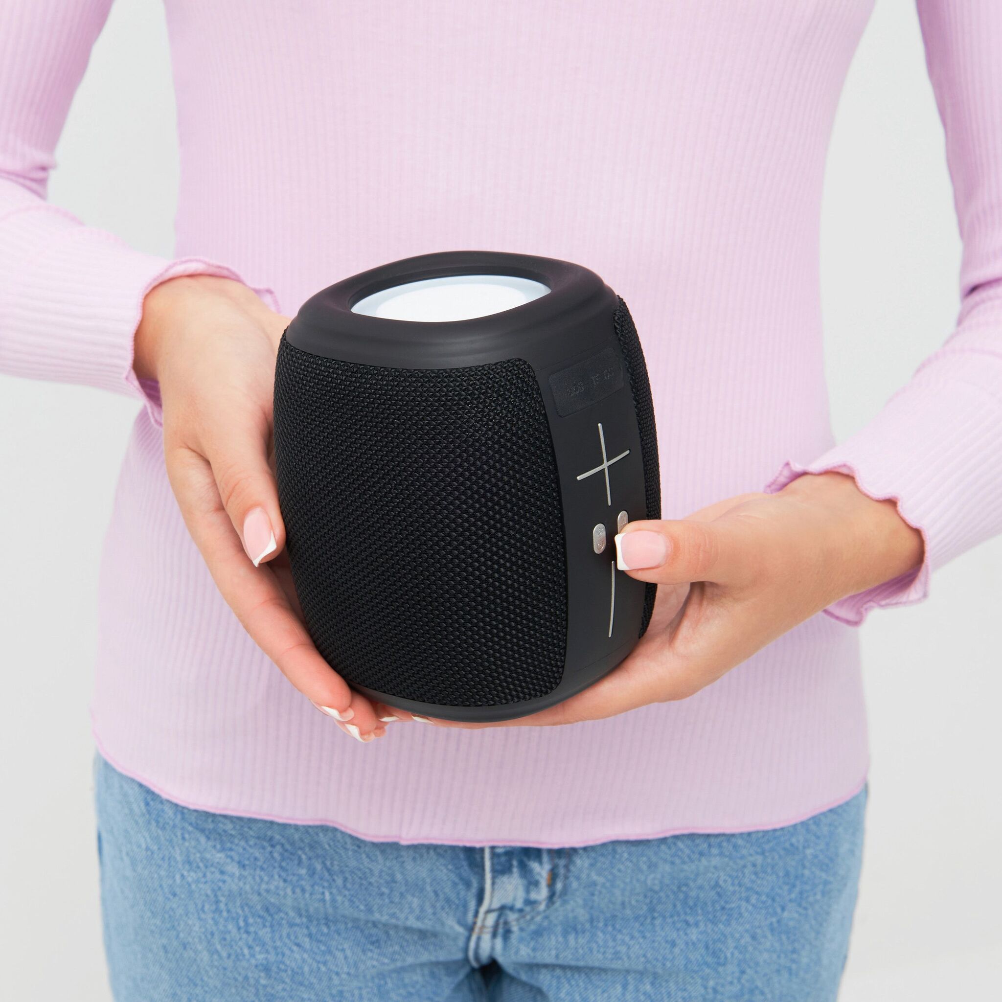 Беспроводная колонка RESISTANT : с изменяющей цвет подсветкой, защита от брызг по стандарту IPX4, музыкальный выход 1x10 Вт, возможность сопряжения со смартфоном, планшетом или компьютером, воспроизведение файлов MP3 с USB-накопителя и карты microSD, громкая связь, мощный аккумулятор, емкость: 1200 мАч, время работы: около 2-3 часов, время зарядки: около 2 часов, максимальный радиус действия: около 10 м, вкл. USB-кабель для зарядки с разъемом USB C (длина ок. 49 см), серый ремень для переноски, 2 нескользящие ножки