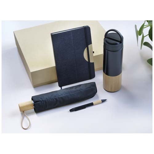 Подарочный набор Carmen включает блокнот формата А5 в твердой обложке, шариковую ручку, бутылку с водой и зонтик. Блокнот имеет черную эластичную застежку и ленточную закладку, а также 80 разлинованных листов бумаги плотностью 80 г/м² кремового цвета. Чехол для ноутбука вместе с бамбуковым полукругом выполняет функцию подставки для телефона. Шариковая ручка изготовлена из переработанного алюминия, сертифицированного RCS, с черным напылением и бамбуковой рукояткой. Чернила для ручки: черный. Длина непрерывной линии: 1000 метров. Бутылка для воды объемом 450 мл изготовлена из нержавеющей стали и украшена бамбуковым аксессуаром на дне. Только ручная мойка. Размер бутылки: 6,6 х 22,2 см. Зонт диаметром 21 дюйм имеет черный купол из эпонжа, черный металлический стержень, черные спицы из стекловолокна и бамбуковую ручку. Размер зонта: 28,3 x 5,5 см. Размер подарочной коробки: 36 x 30 x 8 см.