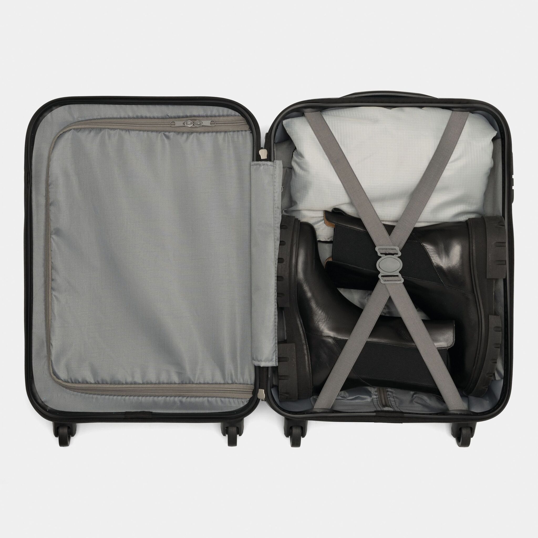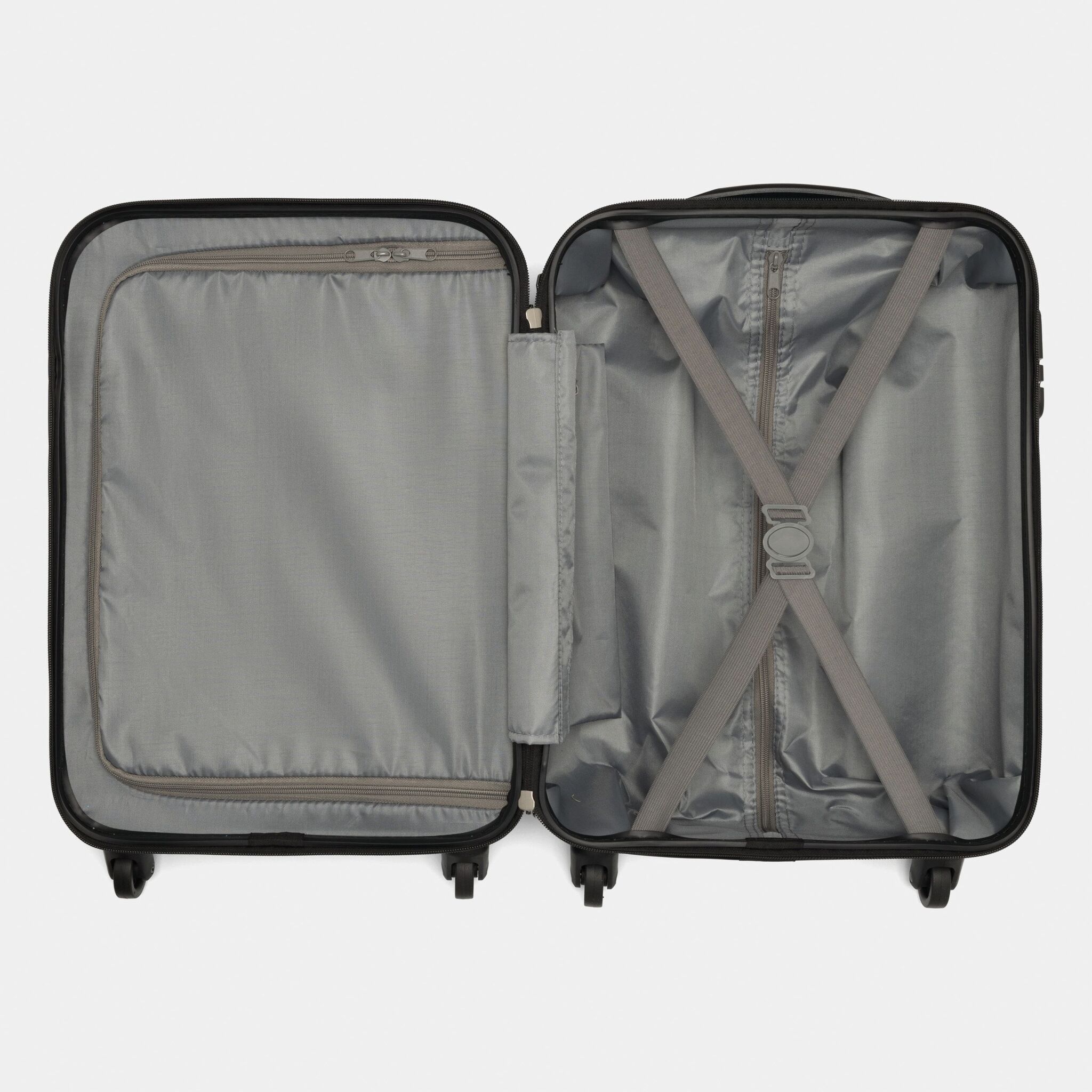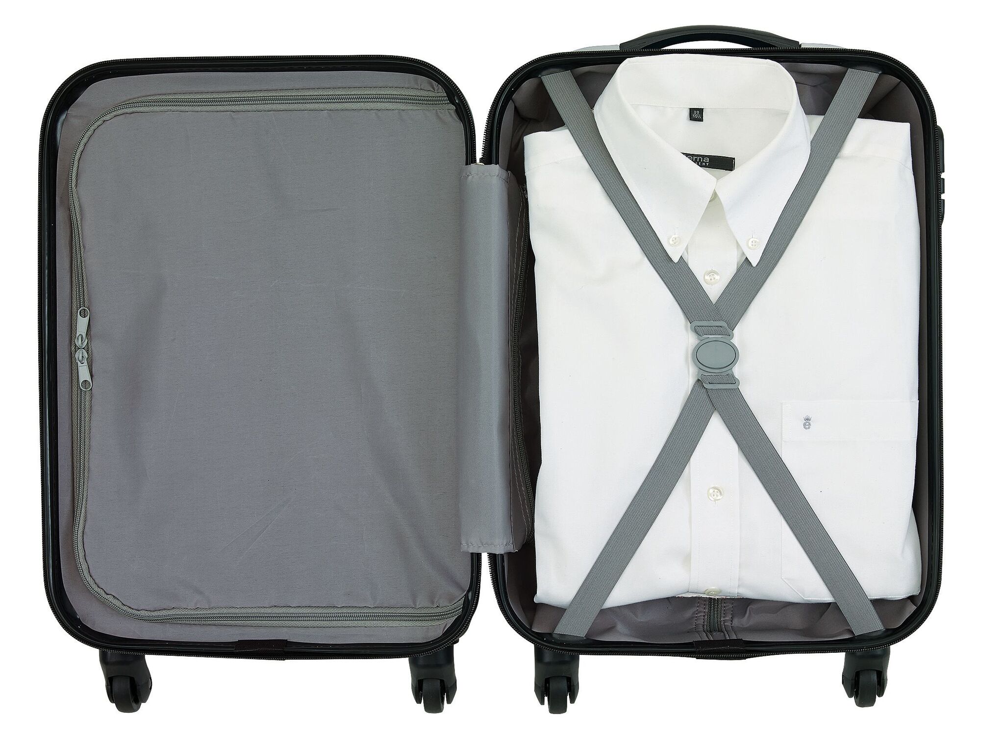 Чемодан на колесах PADUA возможно пакование с двух сторон, подкладка с перегородкой на молнии и упаковочными ремнями, телескопическая ручка, ручка для переноса, 4 легко скользящих колеса, кодовый замок, размер отвечает требованиям бюджетных авиалиний