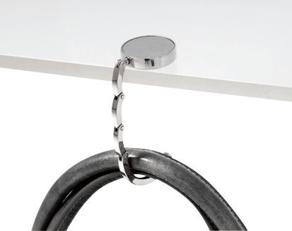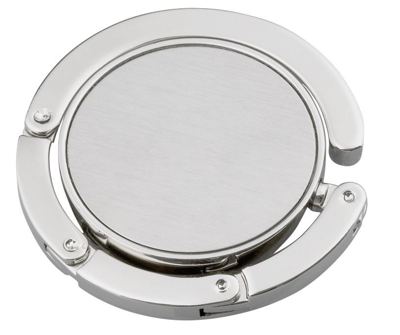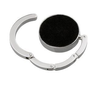 Держатель для сумки HOLD IT , складной: войлок в нижней части обеспечивает надежную фиксацию на разных поверхностях, верхняя часть подходит для размещения вашей рекламы; сделан из блестящего металла, поставляется в кейсе