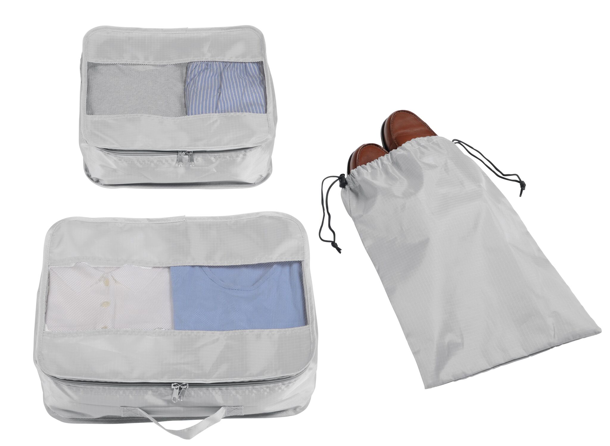 Дорожный набор TRAVEL ATTENDANT , из 3 предметов: 2 cумки для одежды разных размеров, с сетчатым окошком для циркуляции воздуха, двойным замком, большая сумка с ручкой. Мешок для обуви со шнурком и 2 пластиковыми фиксаторами – для сохранения чистоты в чемодане