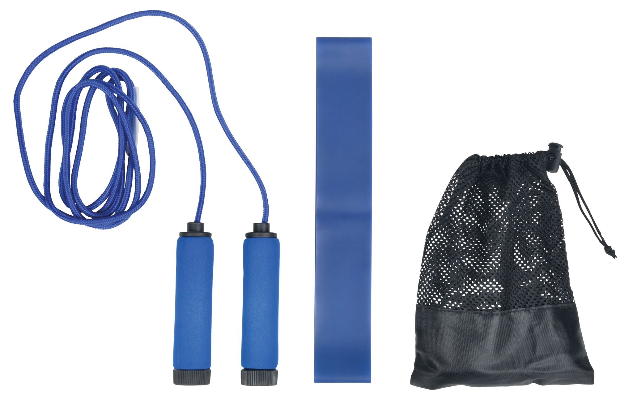 Фитнес-набор STRETCH & JUMP : регулируемая по длине скакалка (макс. 260 см, включая ручки) и эластичные ленты для упражнений на укрепление мышц (окружность 60 см, сопротивление приблизительно 6,8 кг), в черной сетчатой сумке
