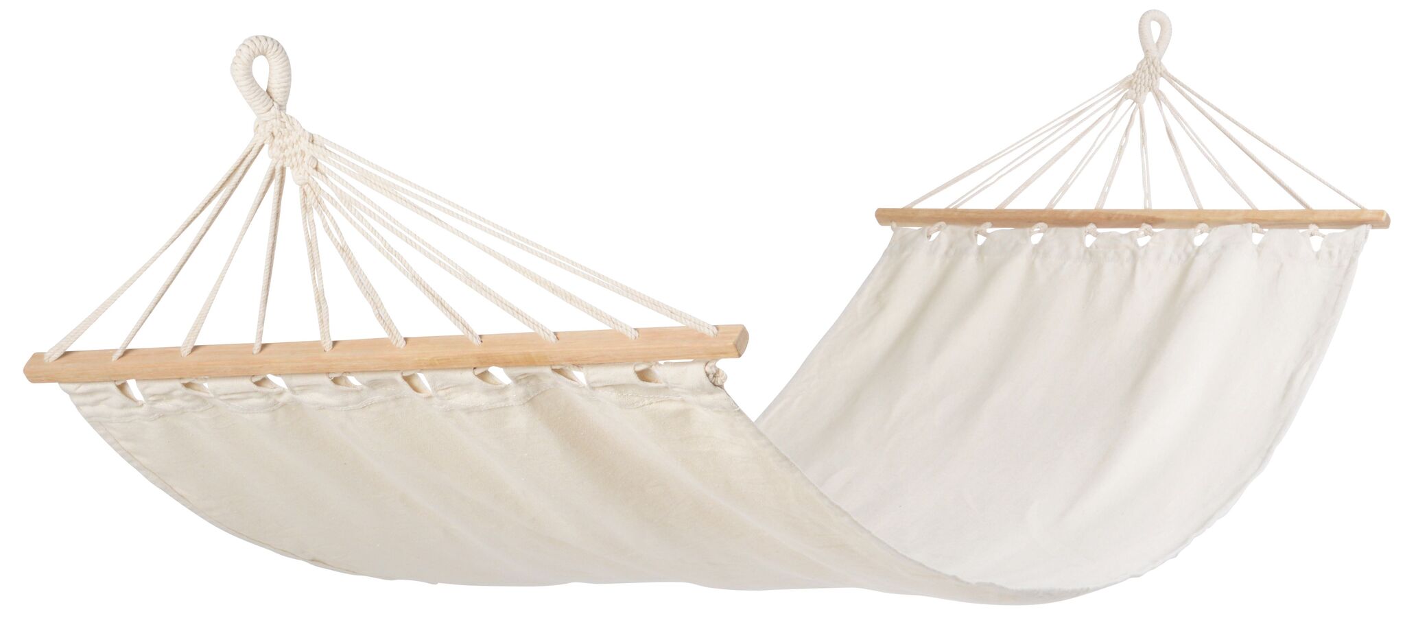 Гамак из холста SNOOZY : канаты проходят через разделительные отверстия в деревянных балках (выдерживает нагрузку до ок.120 кг), чехол со шнурком и пластиковым фиксатором в наборе