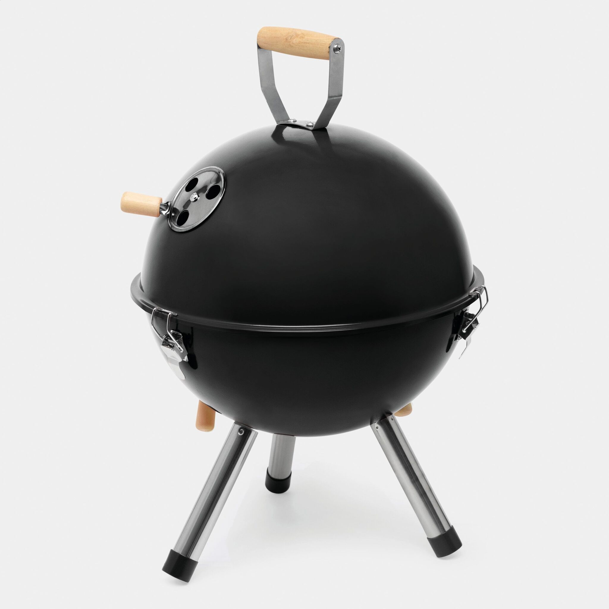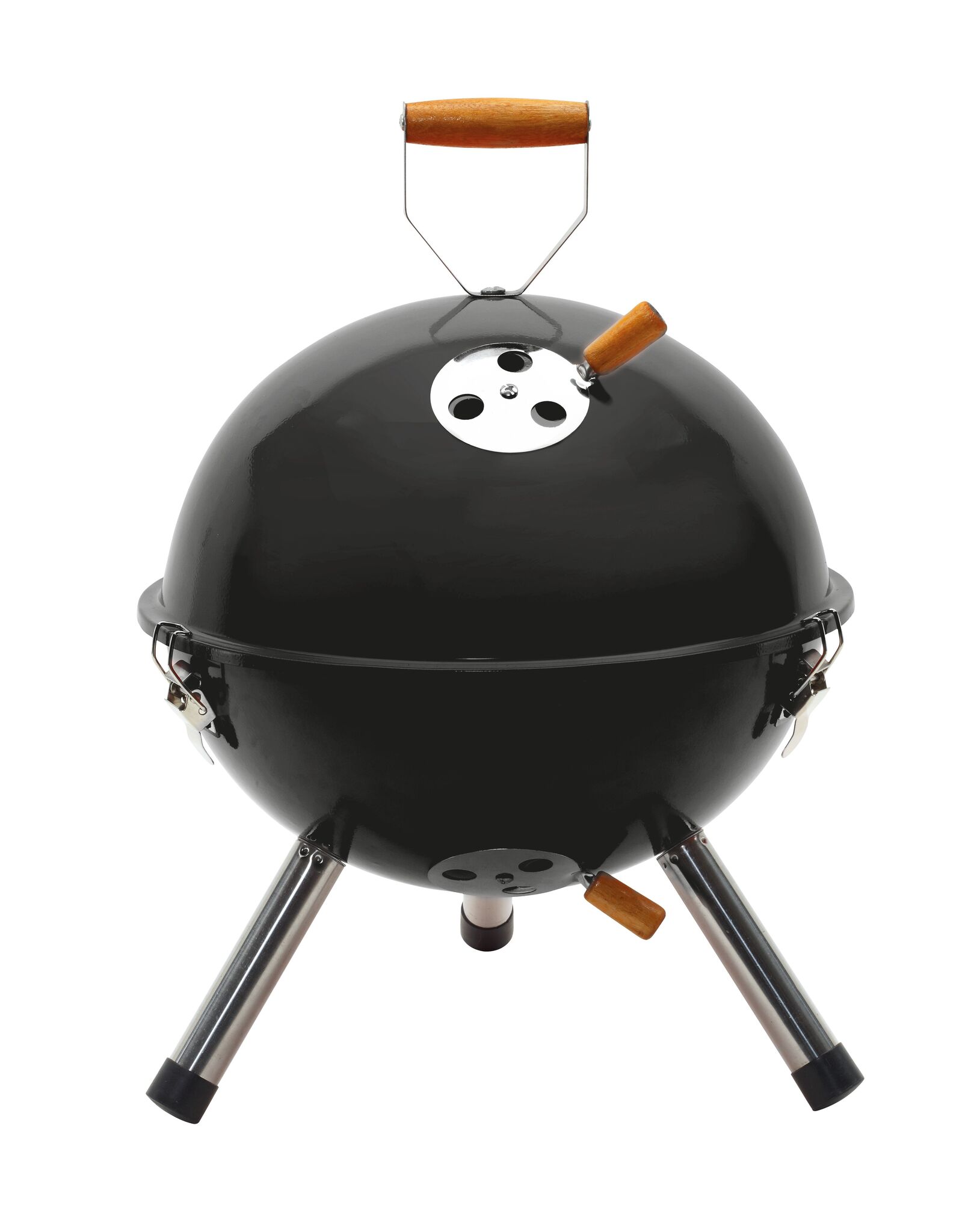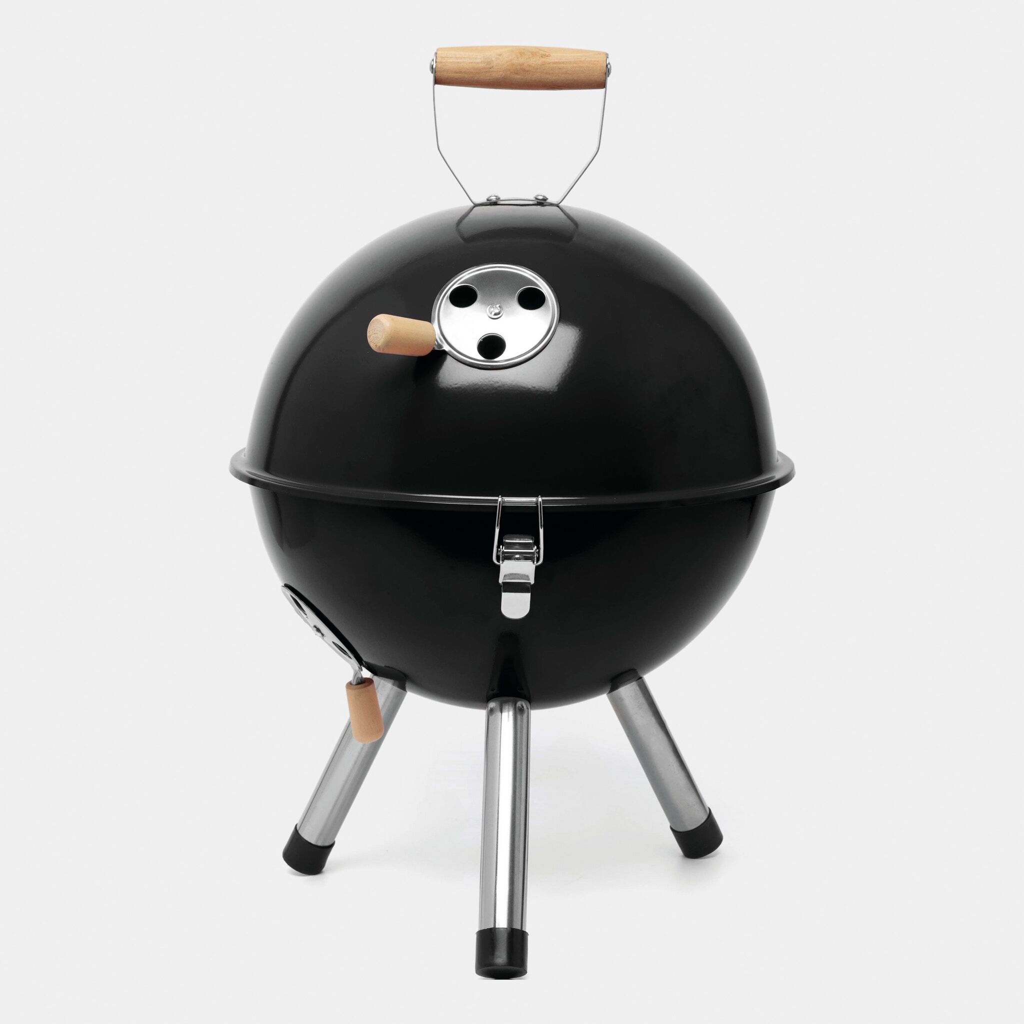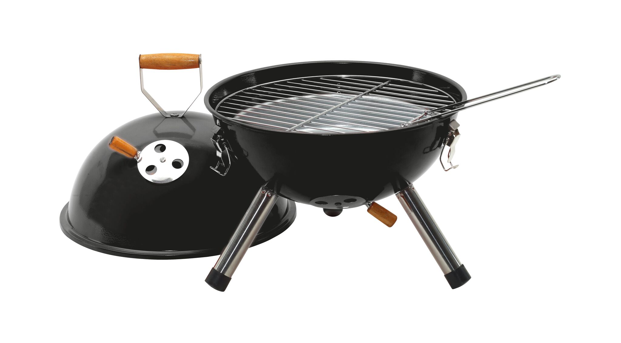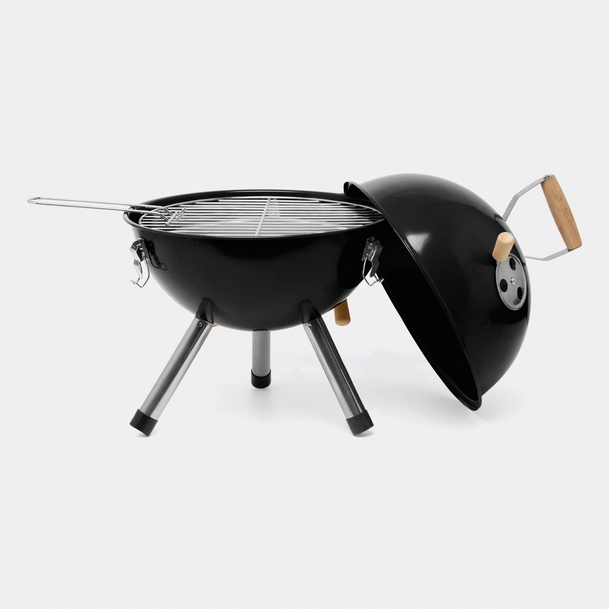 Гриль COOKOUT металлический корпус с 2 вентиляционными отверстиями, съемный поднос для угля с вентиляционными отверстиями, 1 съемная решетка диаметром около 29 см., крышка с вентиляционным отверстием и деревянной ручкой, 3 защелки, удерживающие крышку на корпусе, 3 металлические ножки с пластиковыми наконечниками, запакованный в коробку