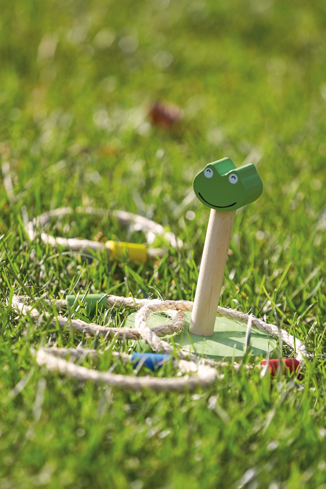 Игра CRAZY LOOP сделана из дерева, в форме лягушки, вкл. 4 кольца с деревянными знаками в разных цветах.