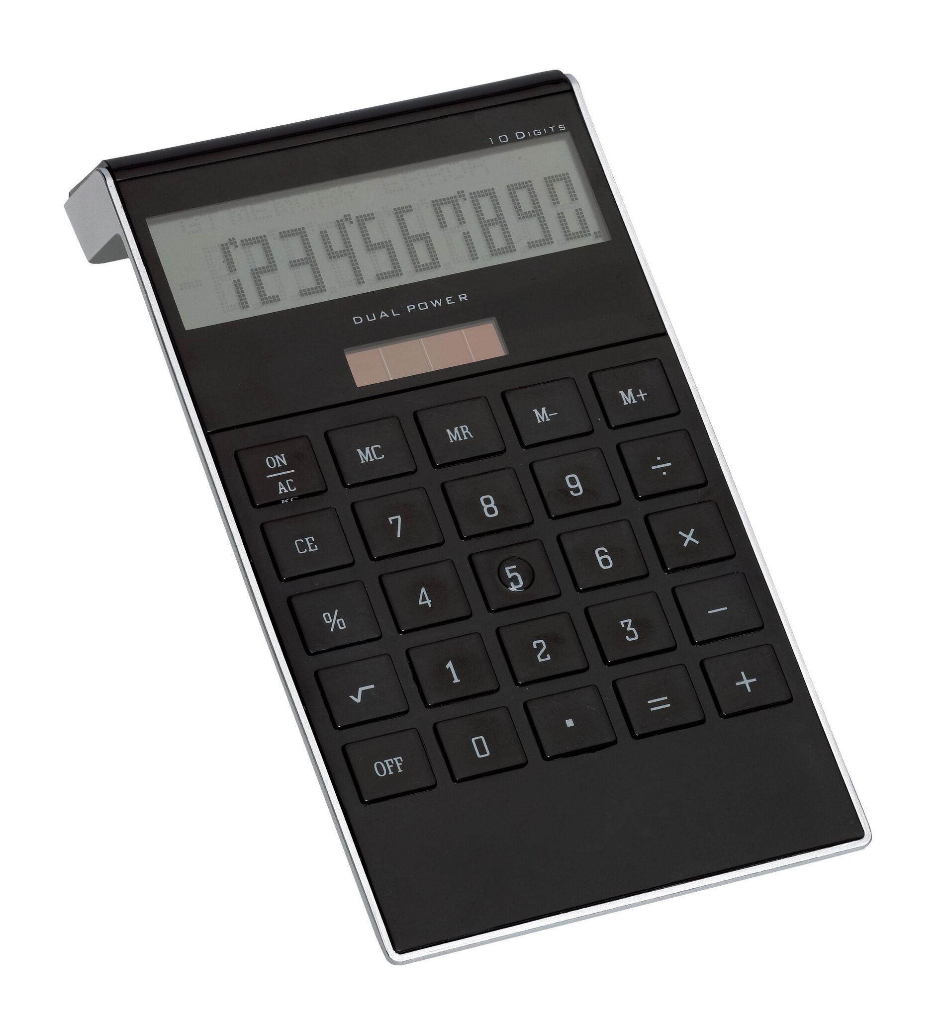 Карманный калькулятор DOTTY MATRIX с элегантно блестящей поверхностью: с двумя выдами питания и практичной подставкой, десятизначный дисплей