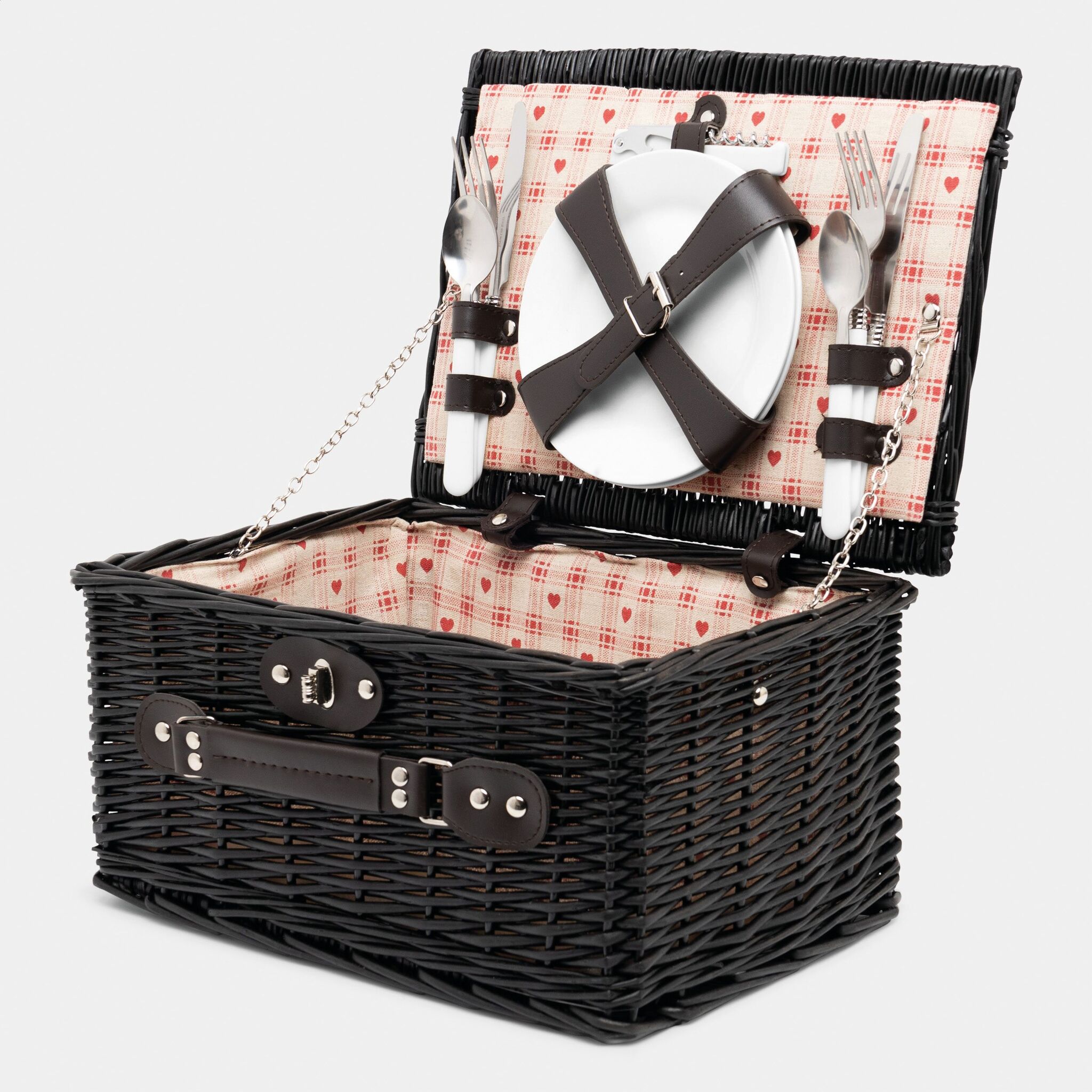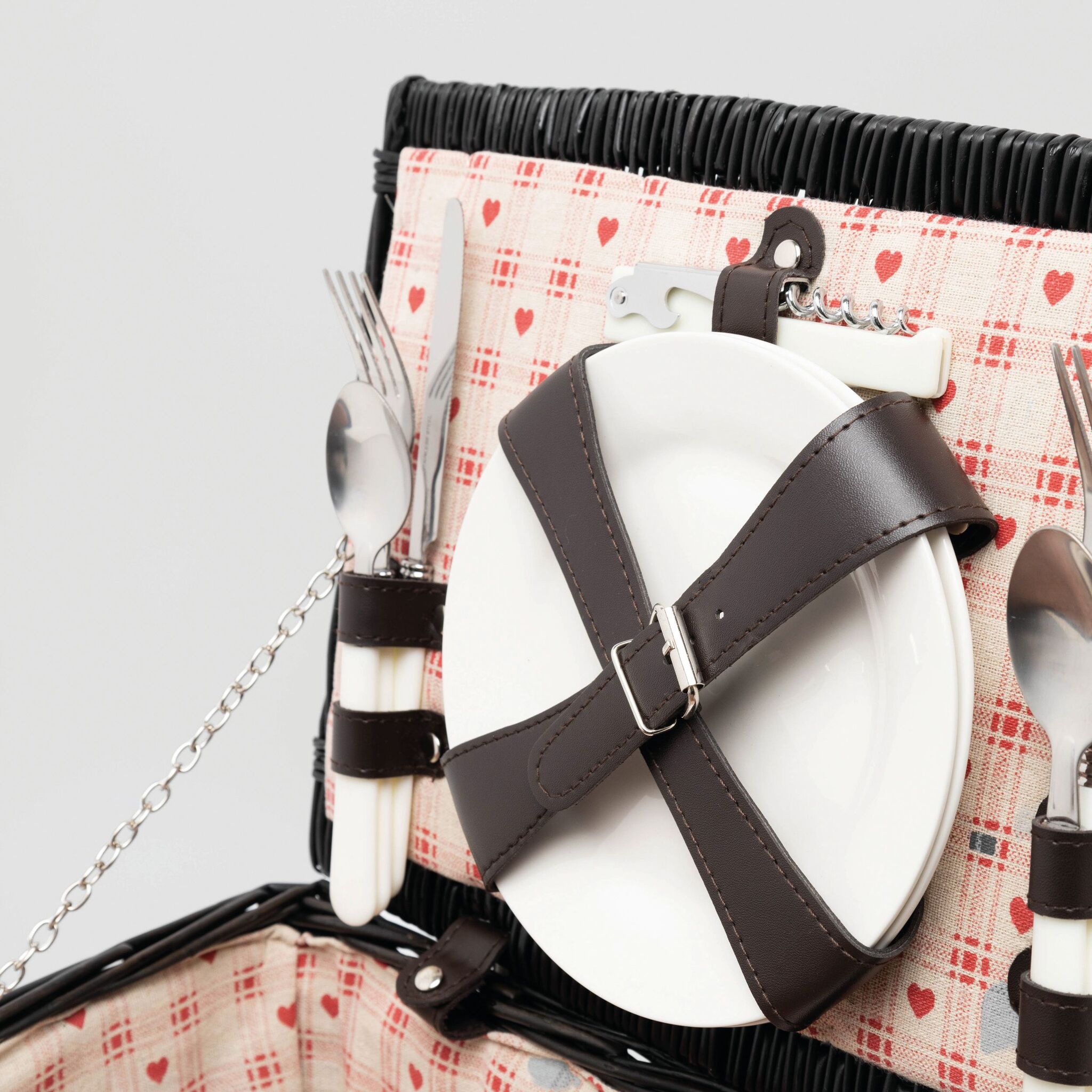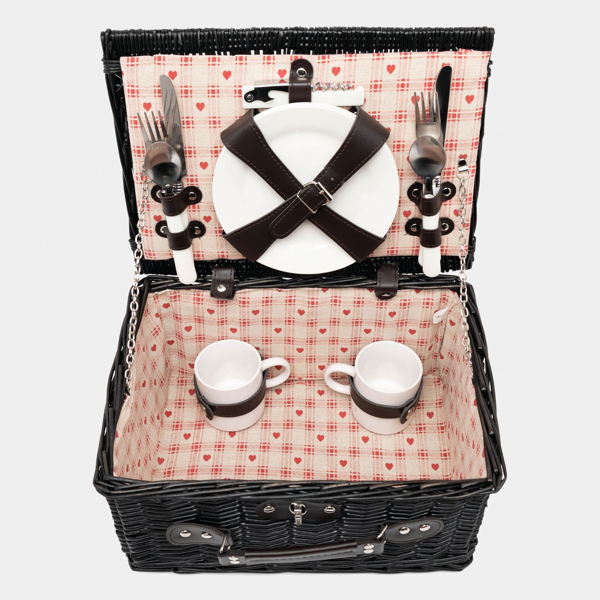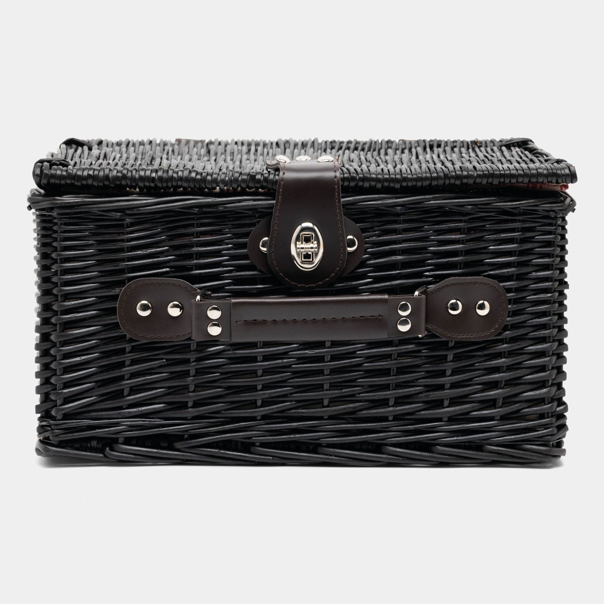 корзина из лозы для пикника SUNSET PARK на 2 персоны, содержит столовые приборы из нержавеющей стали с пластмассовыми руками, керамические тарелки и кружки, 1 нож, внутри крепежные ремни, льняная подкладка, сверху ручка,закрывающая закрутка