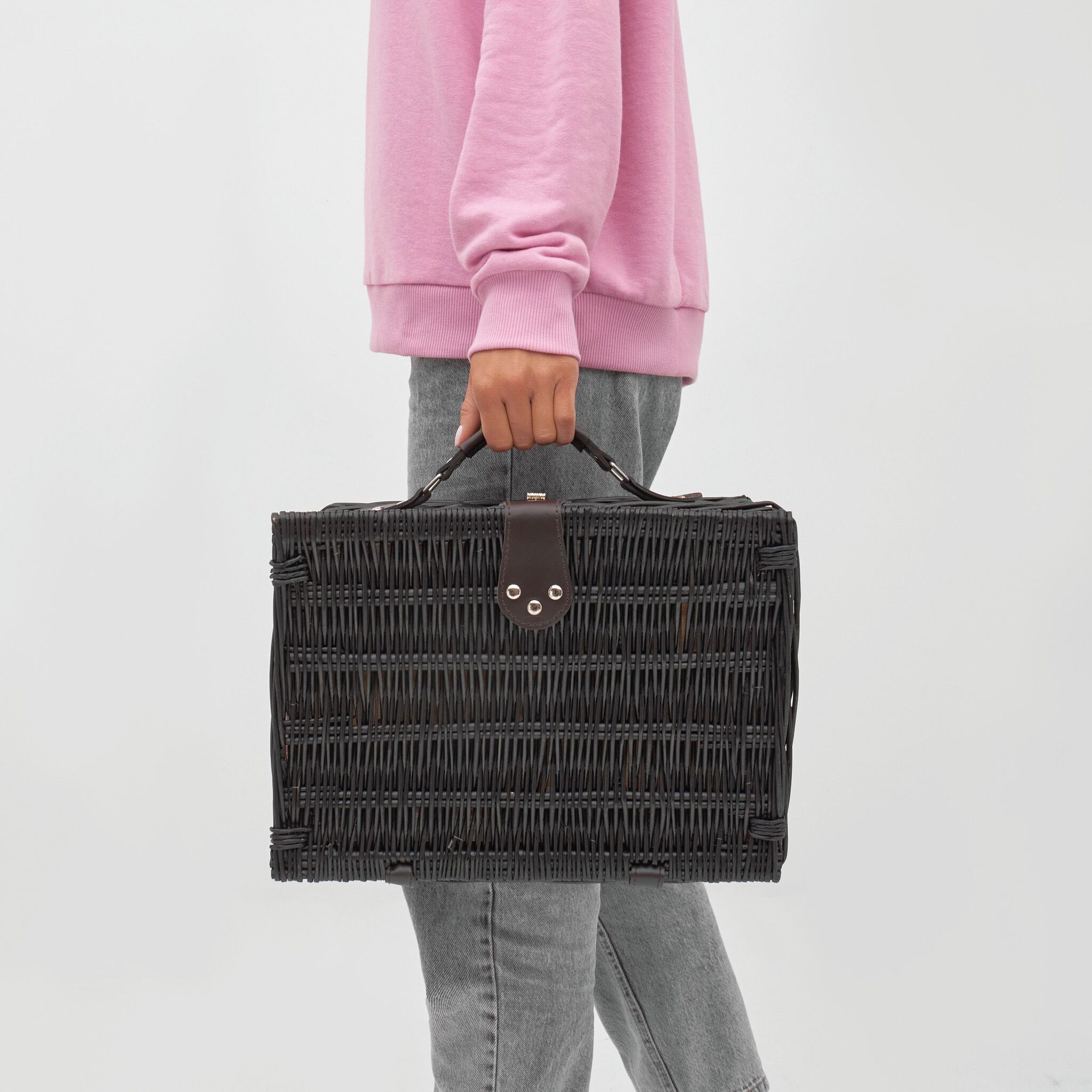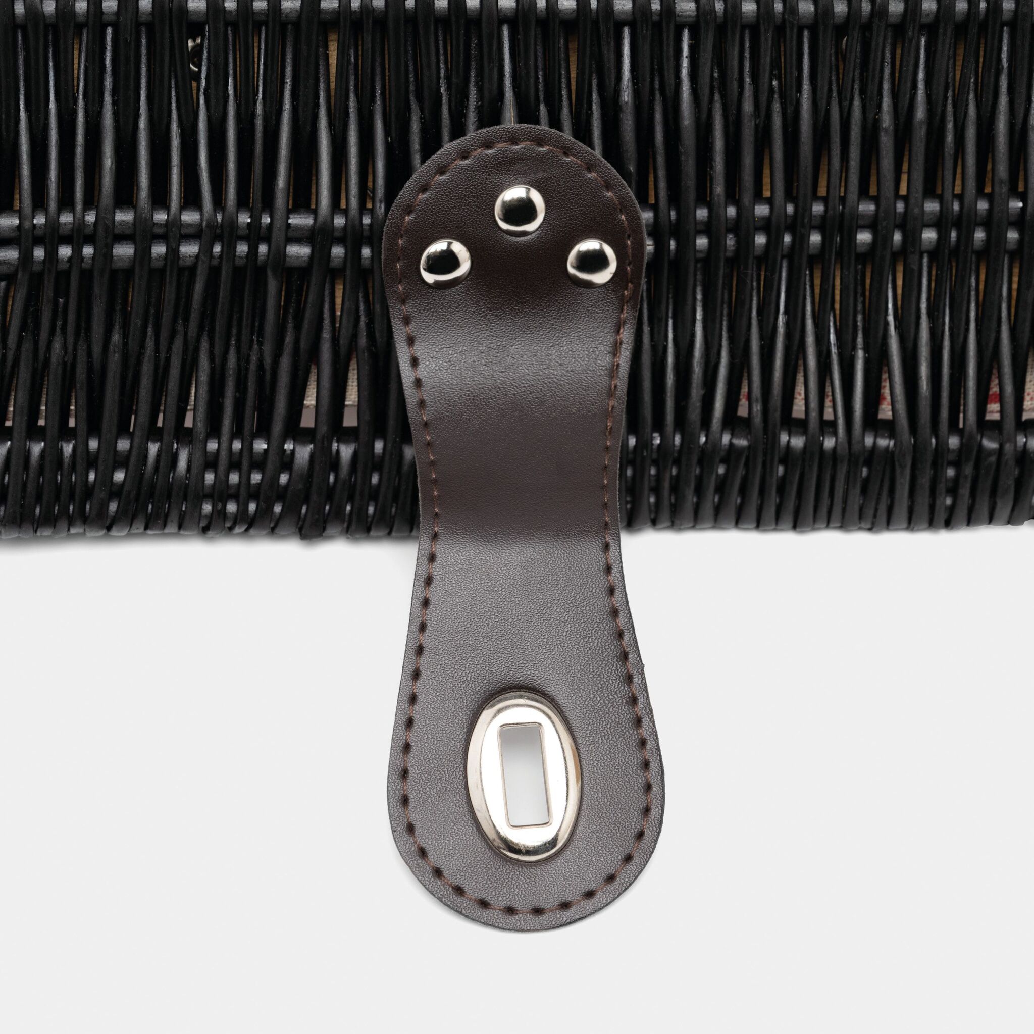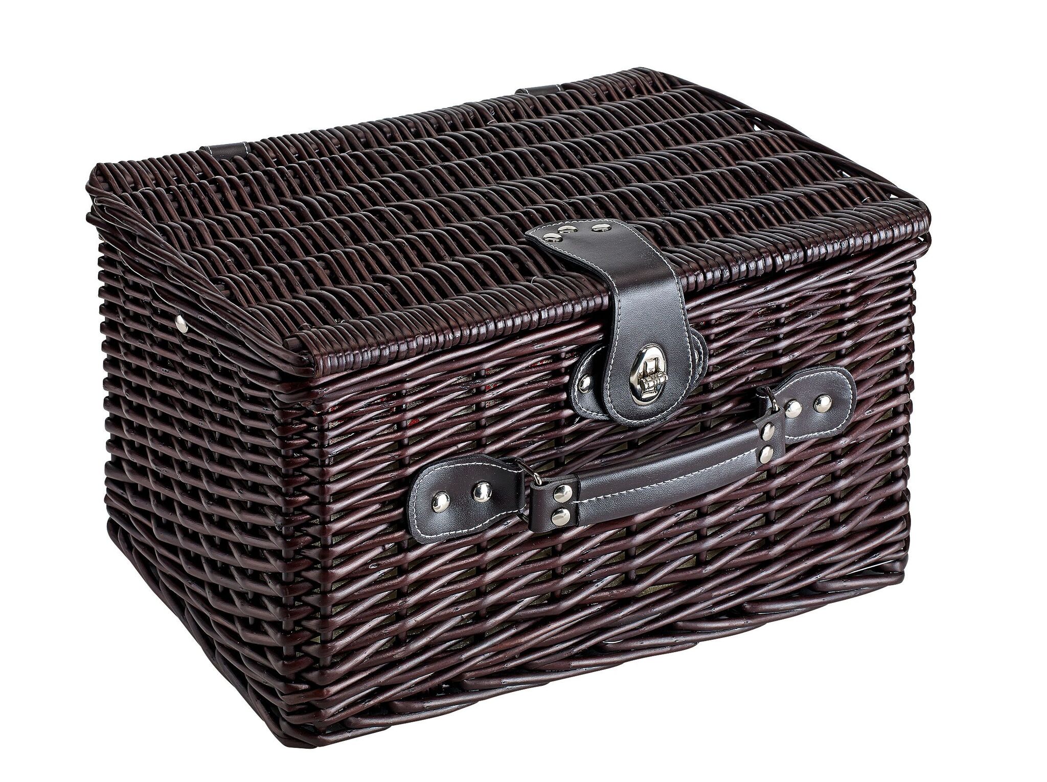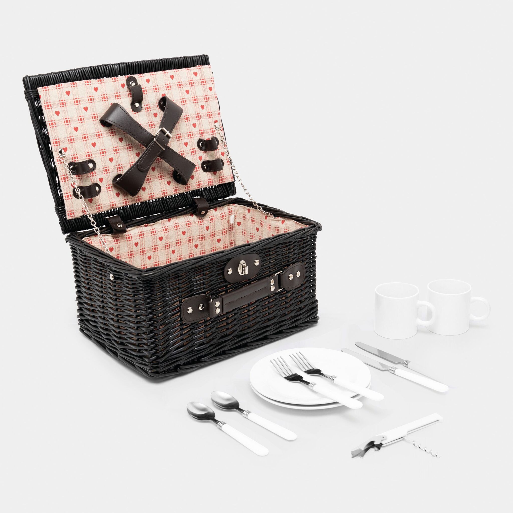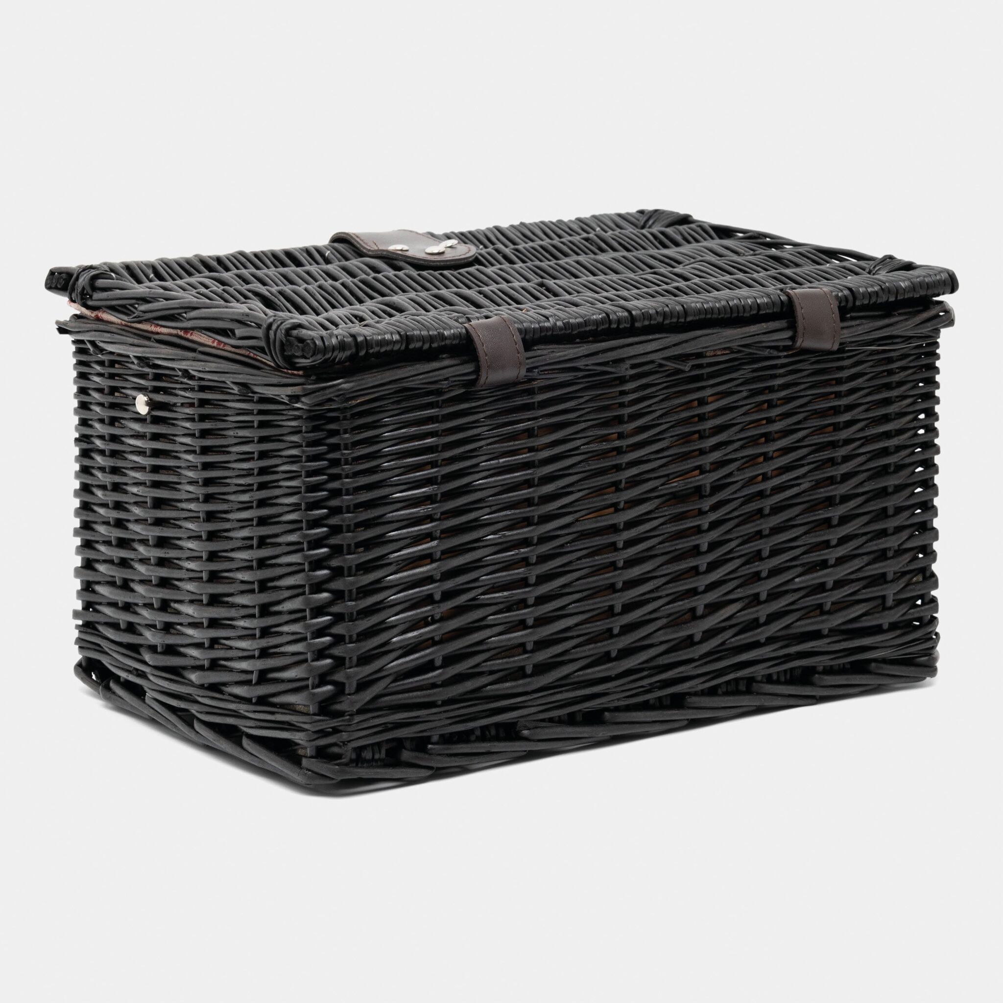 корзина из лозы для пикника SUNSET PARK на 2 персоны, содержит столовые приборы из нержавеющей стали с пластмассовыми руками, керамические тарелки и кружки, 1 нож, внутри крепежные ремни, льняная подкладка, сверху ручка,закрывающая закрутка