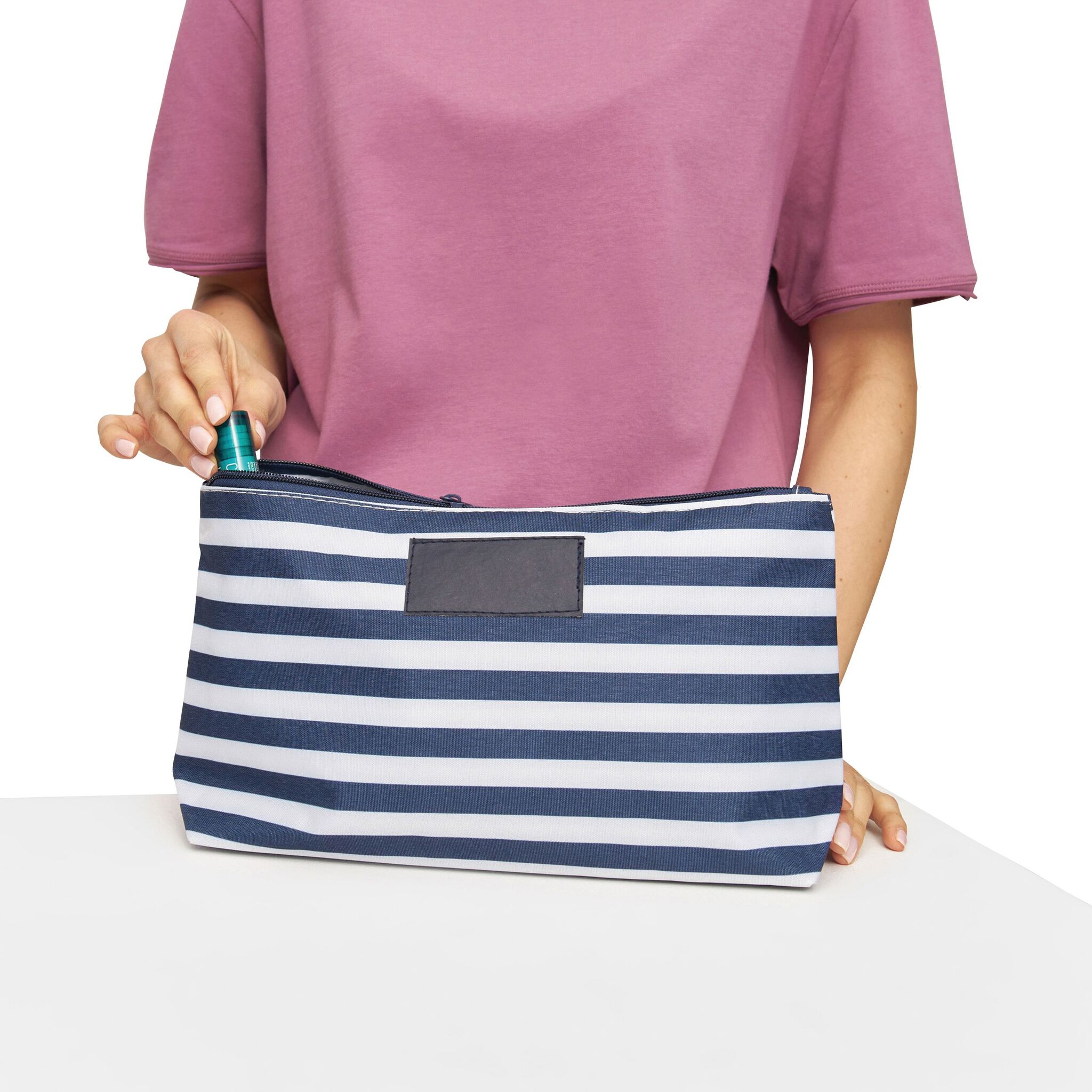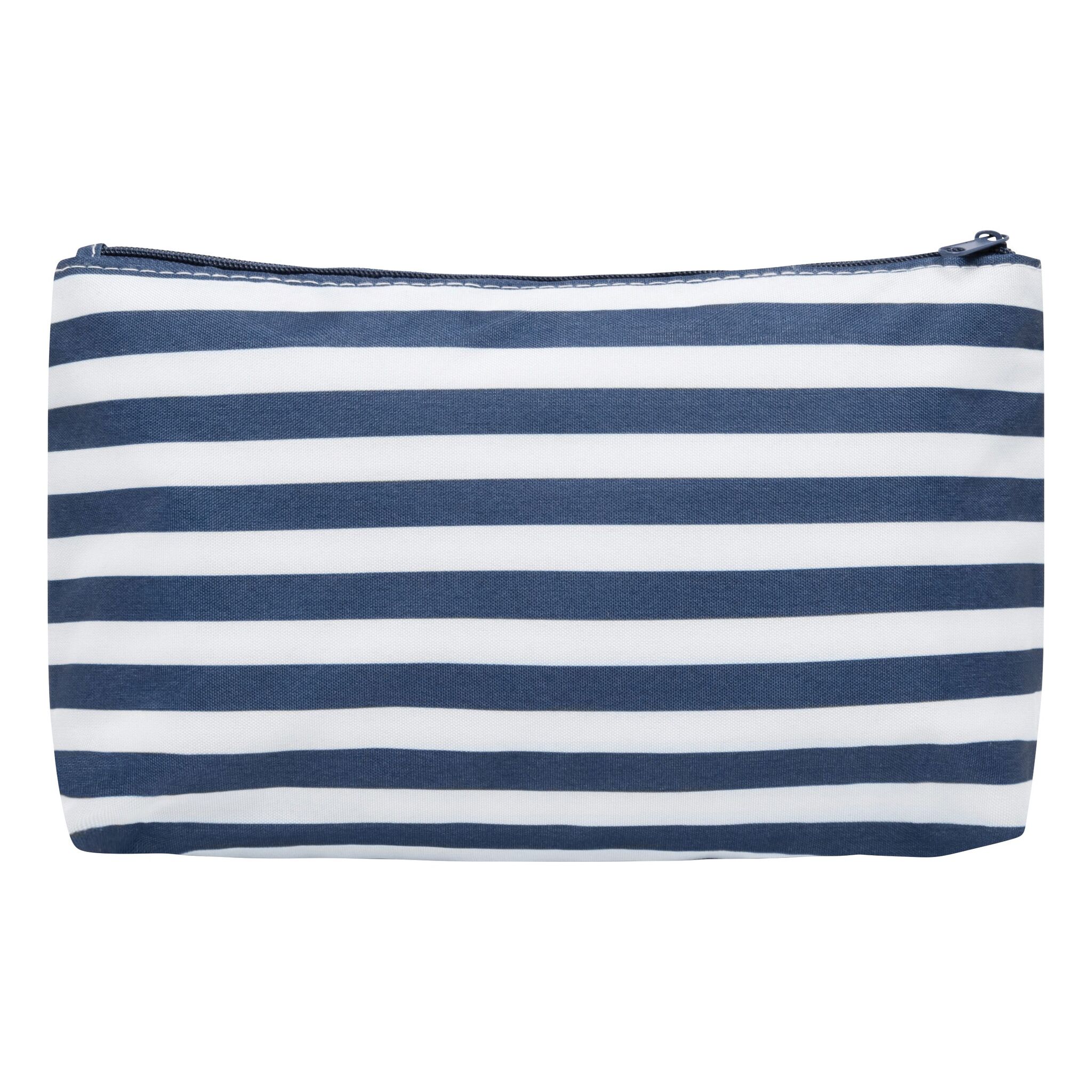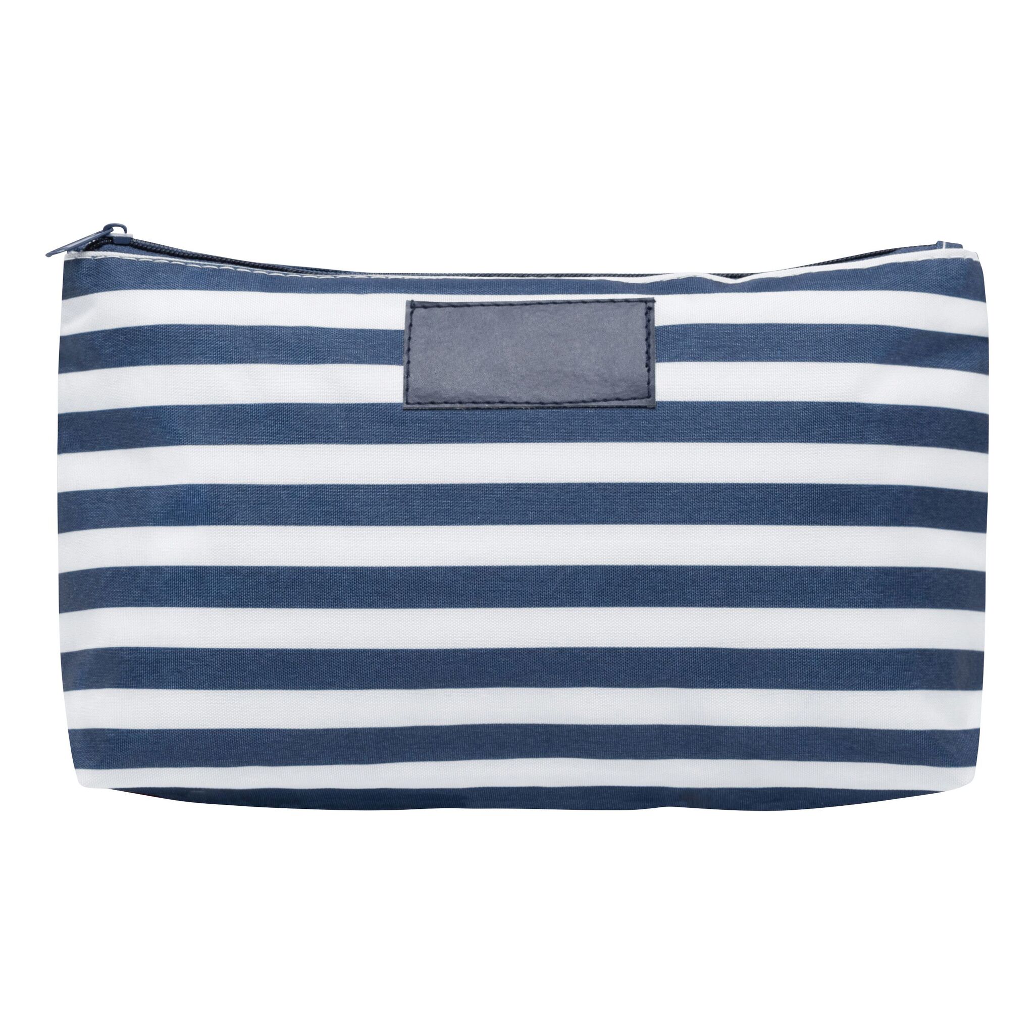 Косметичка STRIPY основной отсек на молнии, внутри маленький карманчик на молнии, снаружи узор в матросскую полоску, с идеальной для маркировки нашивкой спереди из кожзаменителя – идеальна для косметических средств и аксессуаров.