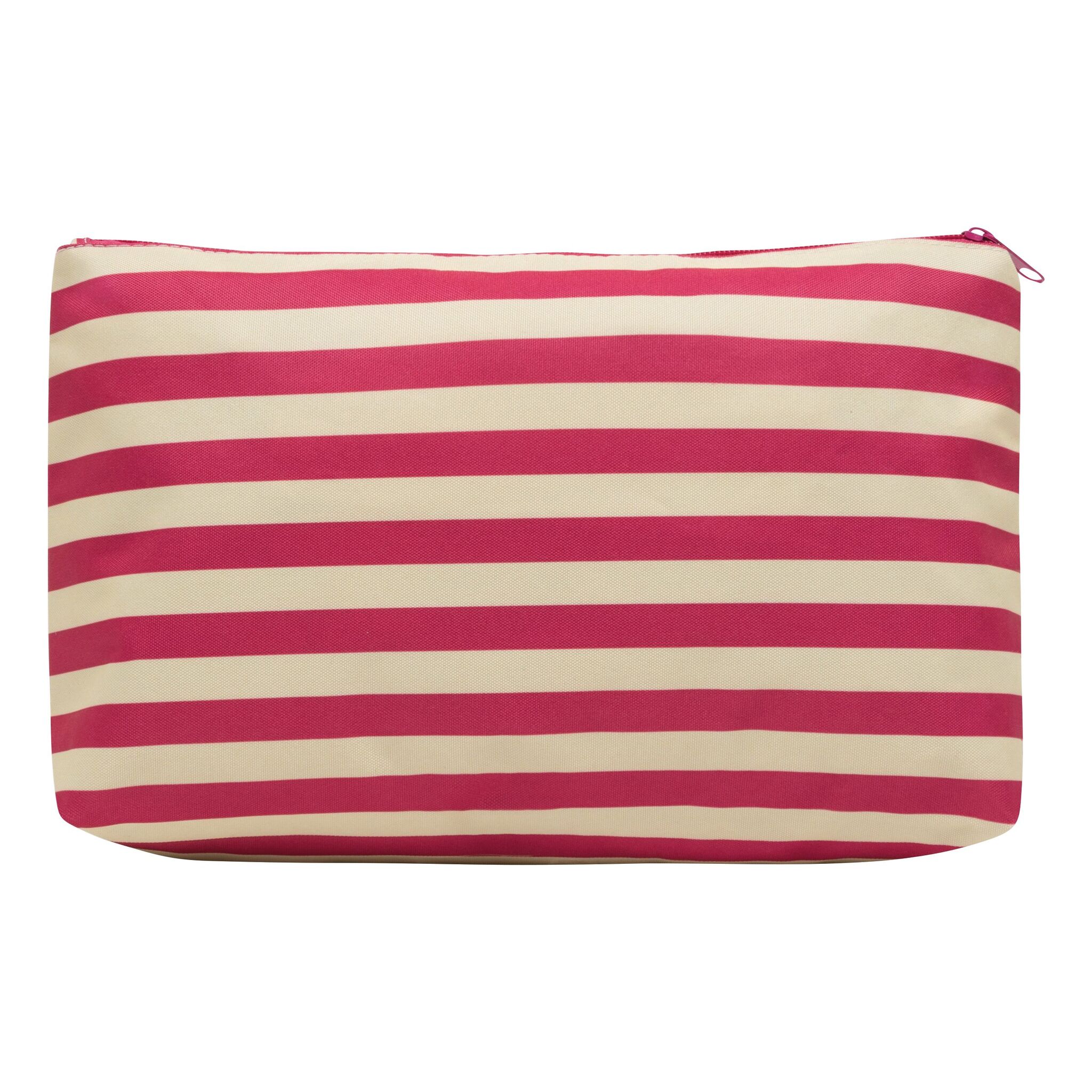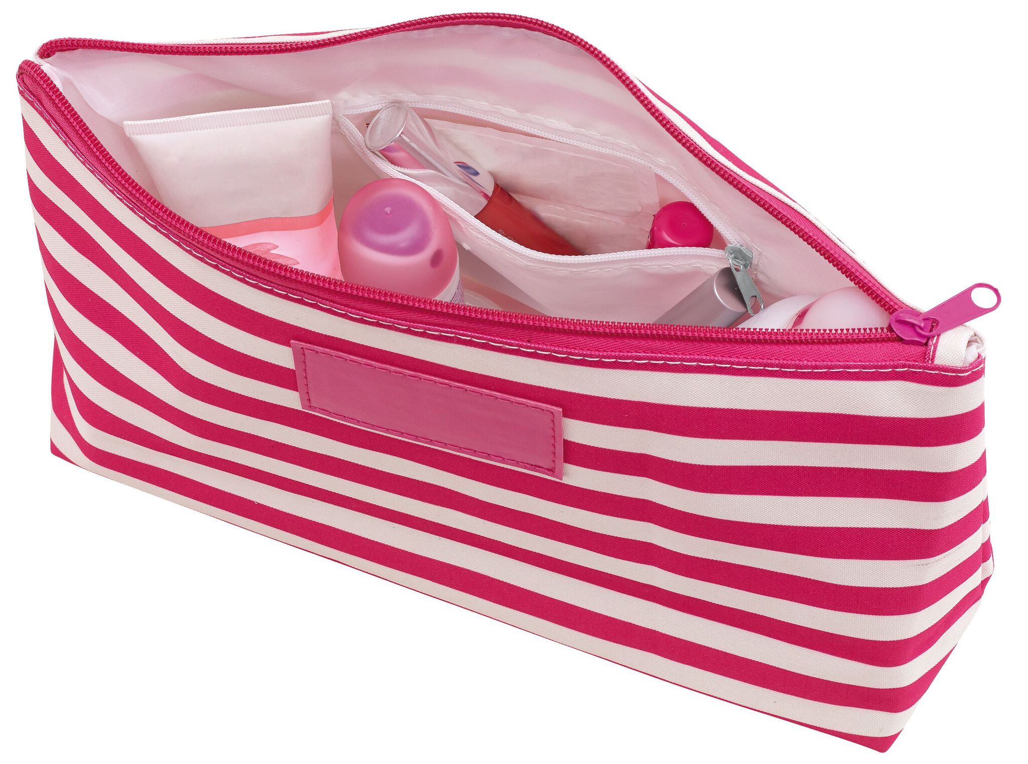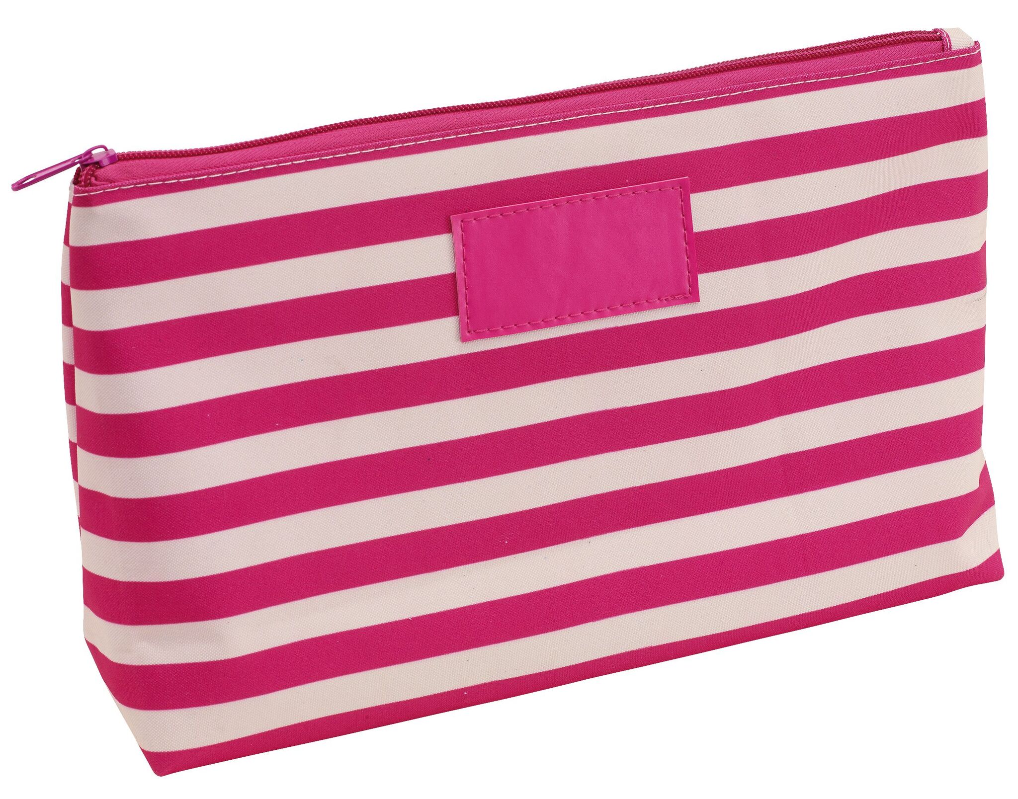 Косметичка STRIPY основной отсек на молнии, внутри маленький карманчик на молнии, снаружи узор в матросскую полоску, с идеальной для маркировки нашивкой спереди из кожзаменителя – идеальна для косметических средств и аксессуаров.