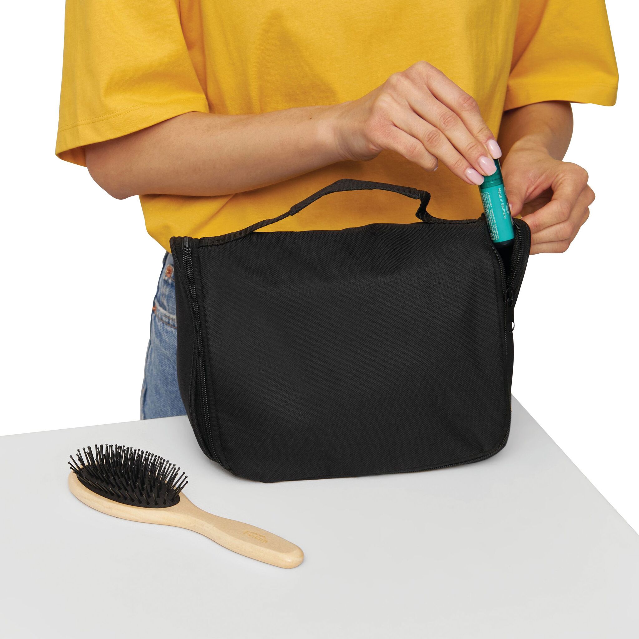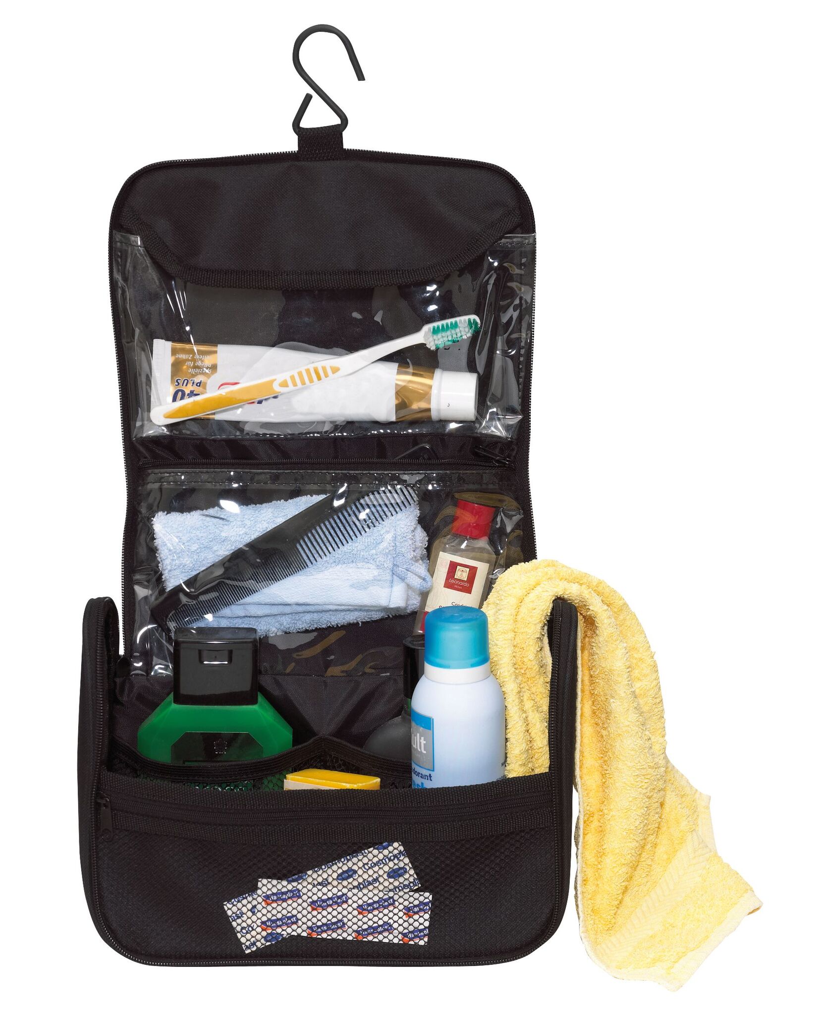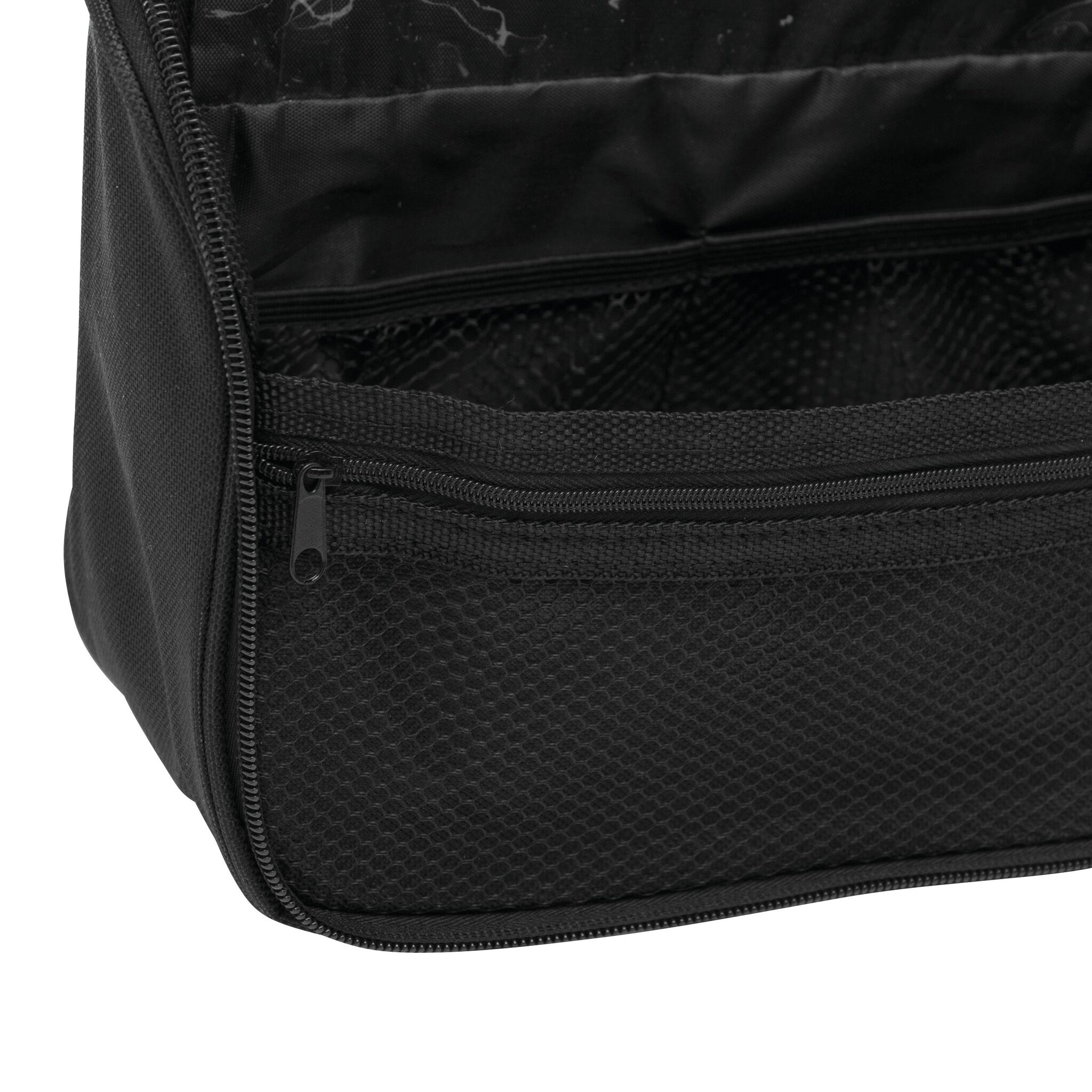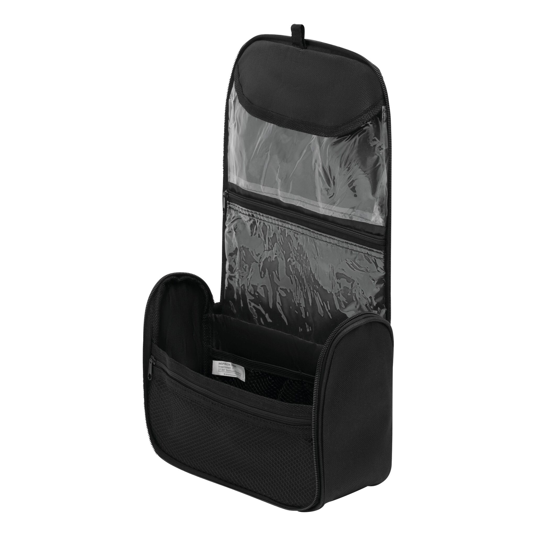 Косметичка WIDE AWAKE с ручкой и основным отделением на молнии, внутри два прозрачных кармашка, три кармашка - сетки и металлический крюк для подвешивания