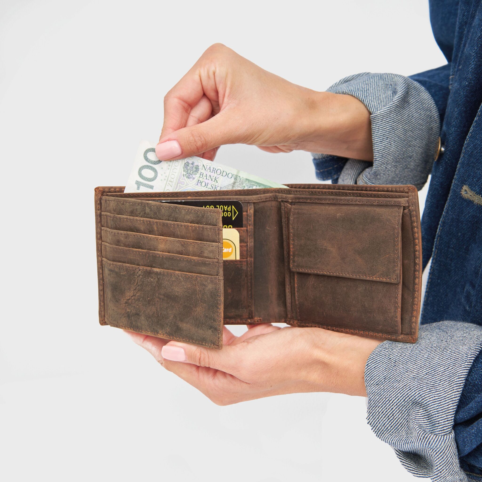 Кожаный кошелек WILDERNESS I : 8 отделений для кредитных карт, 2 отделения для банкнот, 1 отдел для монет с застежкой-кнопкой, 1 сетчатый карман для удостоверения и водительских прав, 2 дополнительных кармашка