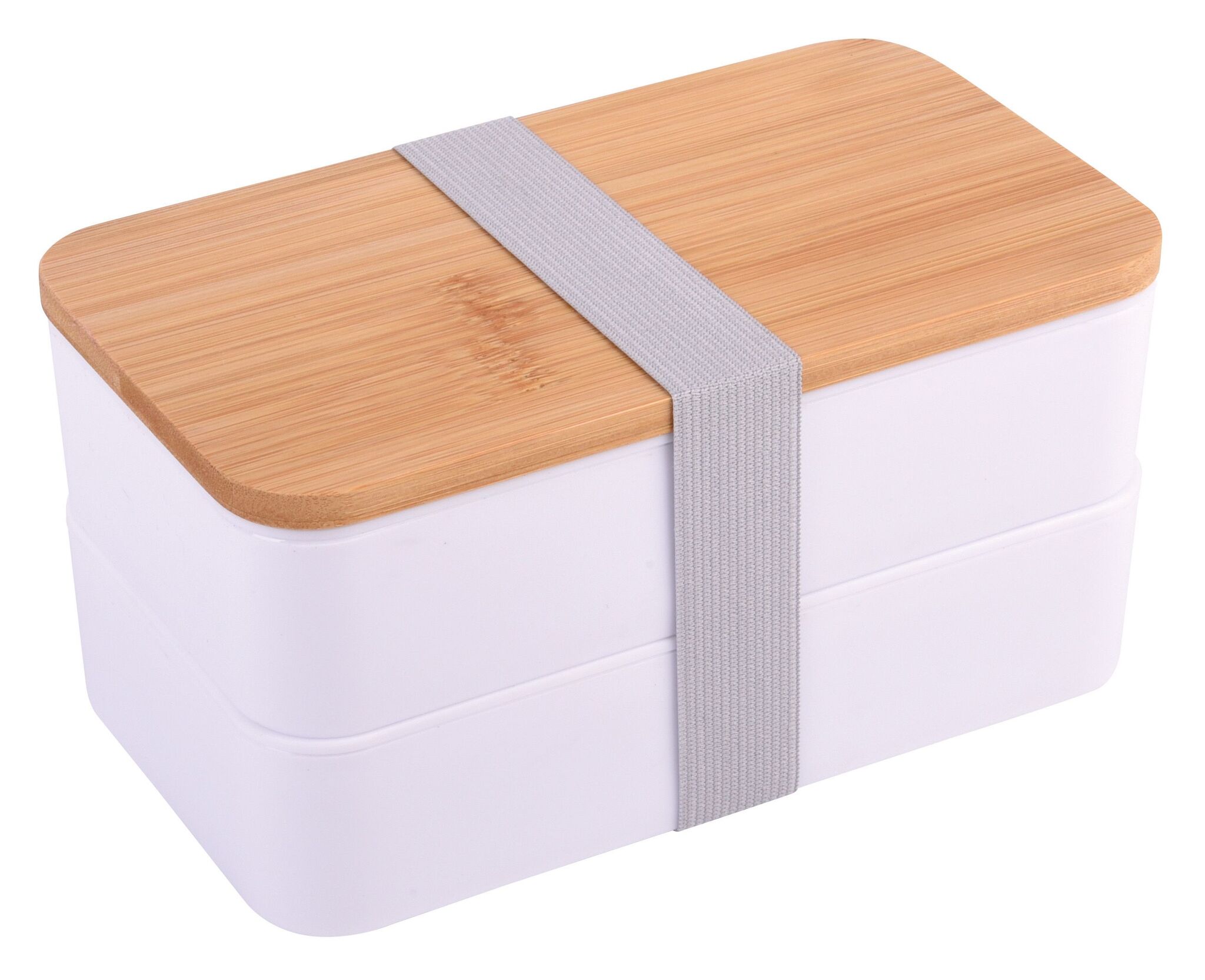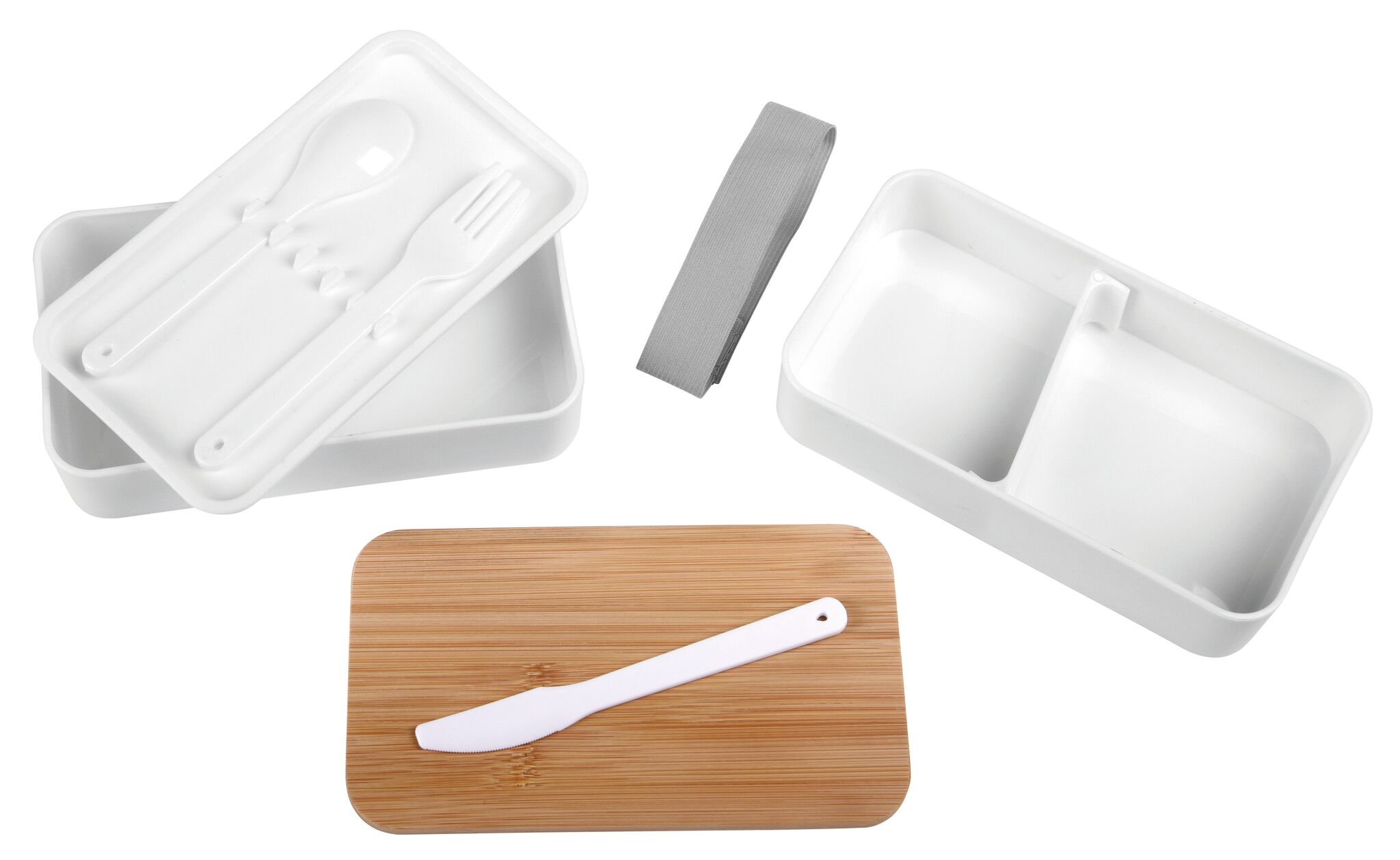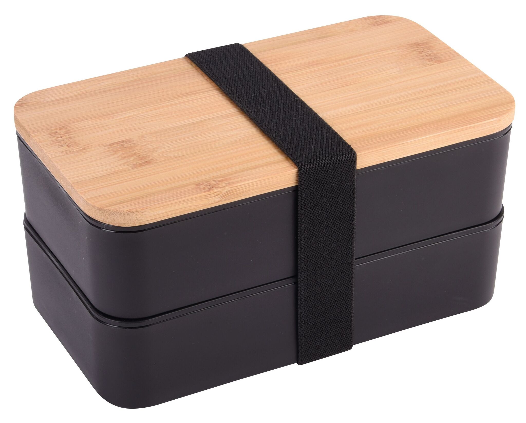 Lunchbox DOUBLE LEVEL : mit Pезинаband zum Verschließen, 2 separate Dosen (Füllmenge jeweils прибл. 550 ml), Zwischendeckel mit Besteck (Messer, Gabel, Löffel), variabler Trenneinsatz, Бамбук-Deckel auch als Schneidebrett verwendbar