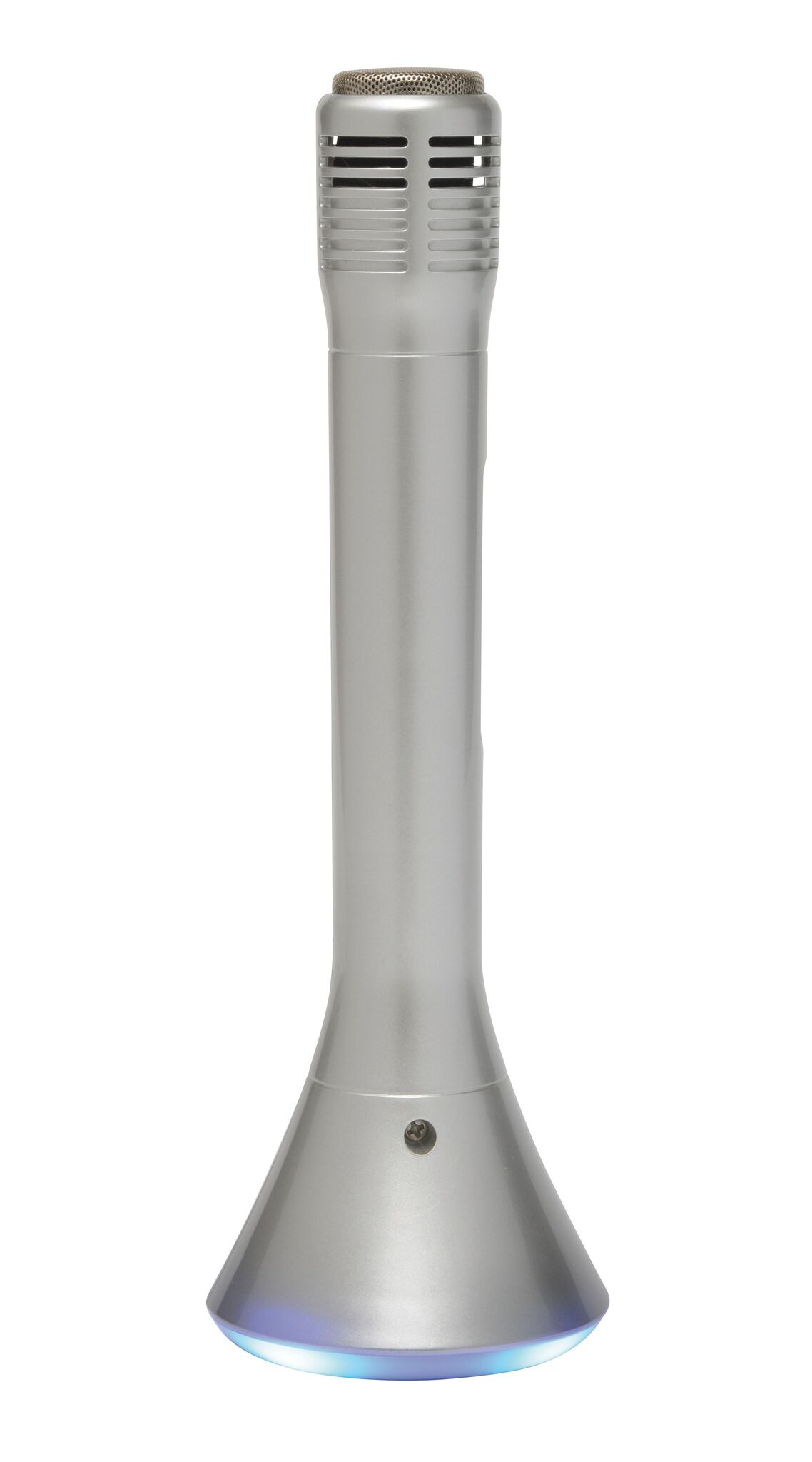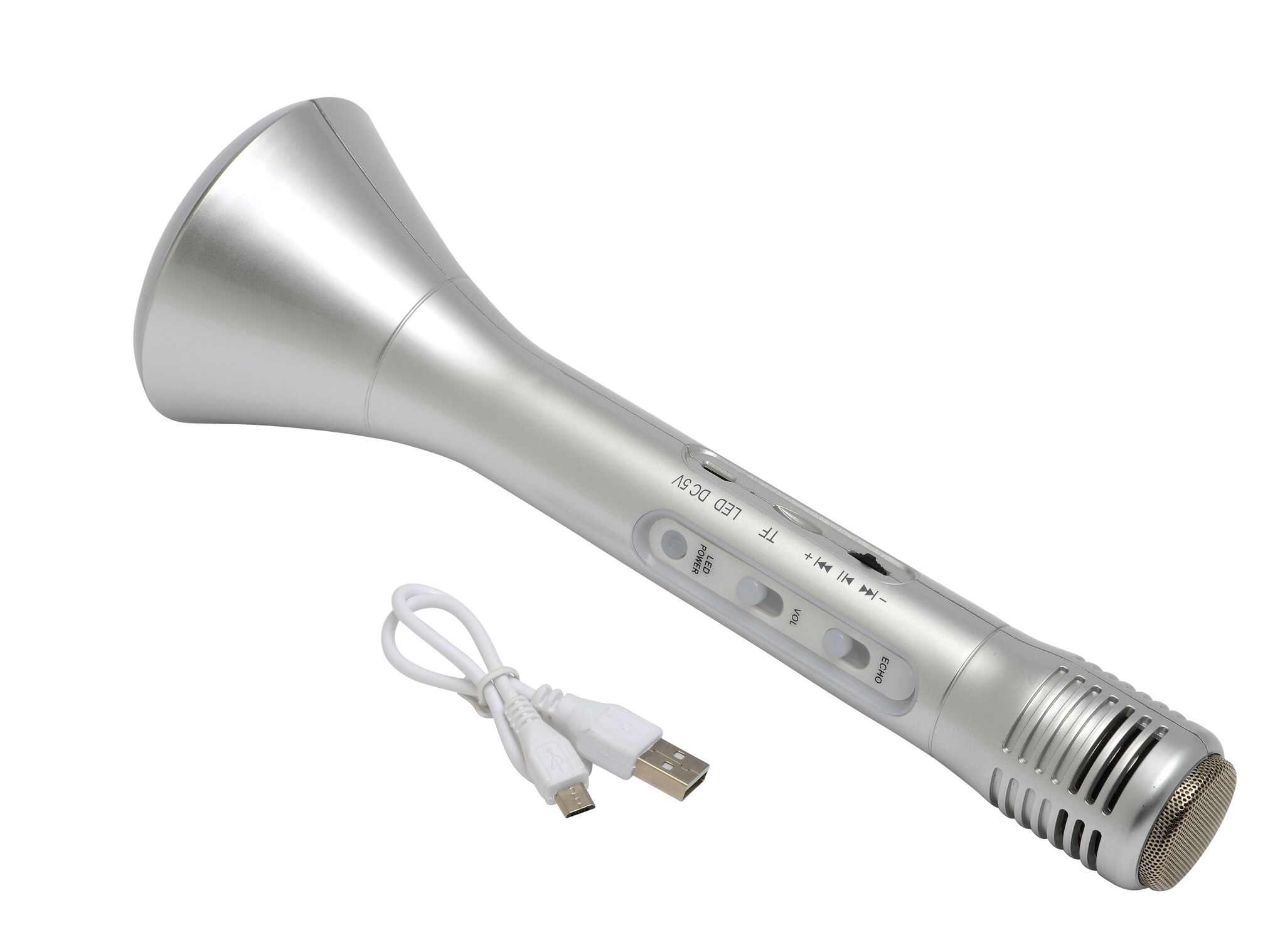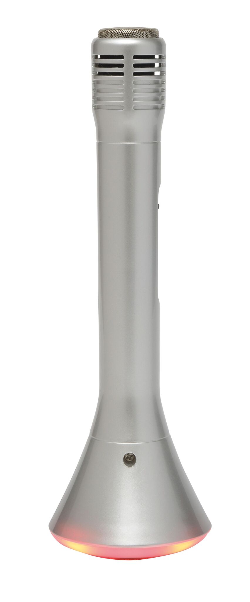 Mикрофон для караоке с беспроводным соединением CHOIR освещением LED, меняющим цвета, мощностью 3W, есть слот для карты microSD, диапазон частоты: 20 Hz-20 KHz, аккумулятор емкостью oк. 2.200 mAh, кабель USB для зарядки длиной oк. 31 cм, время зарядки oк. 4ч, эффект эха, работает с большинством программ караоке.