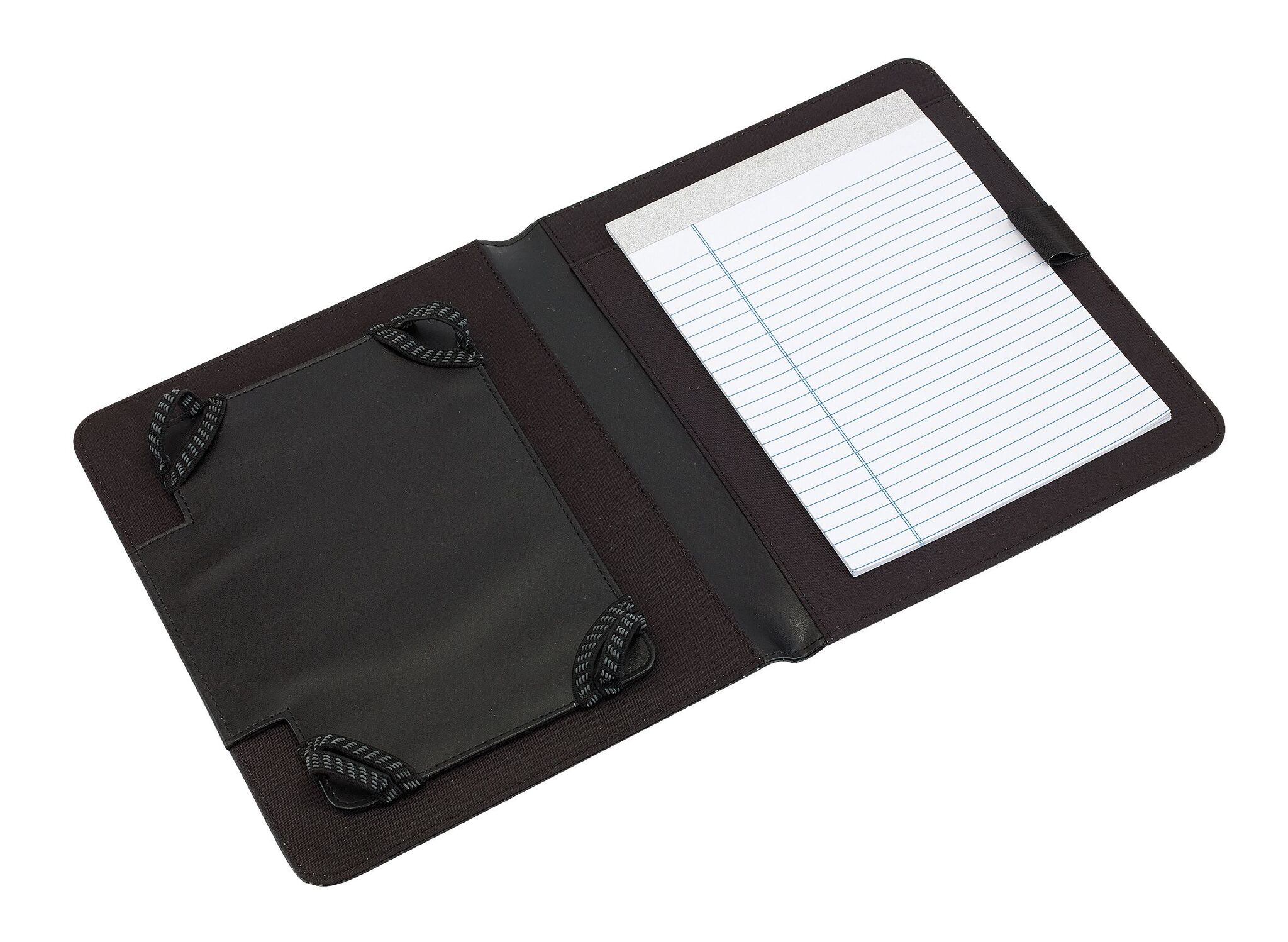 Мини портфолио для планшета HILL DALE TAB в формате А5 с раскладывающейся подставкой и эластичными ремнями для планшета (7дюймов) и iPad mini; включен блокнот в линейку, петля для авторучки, снаружи перфорированный рисунок, металлическая пластинка для Твоего логотипа