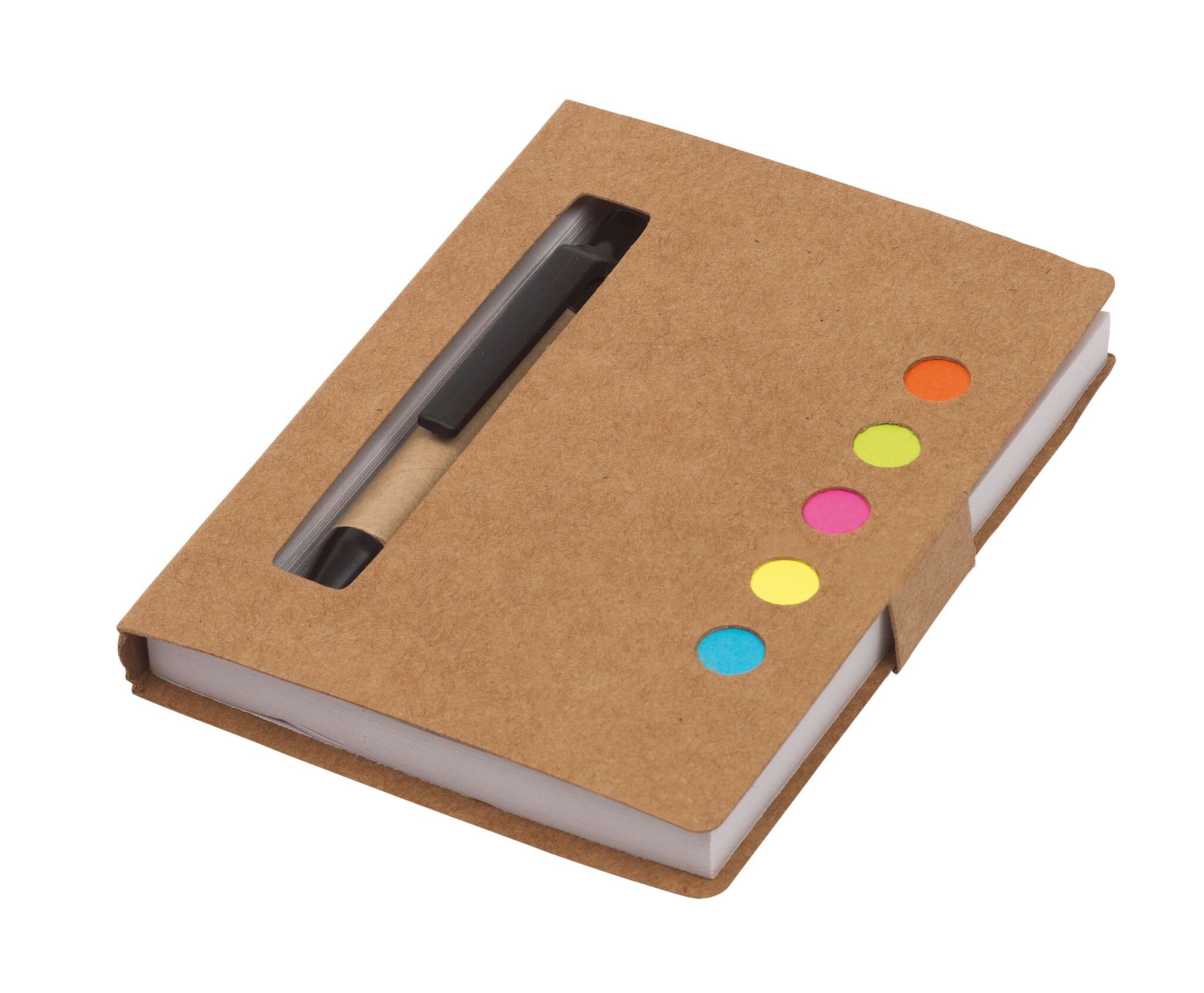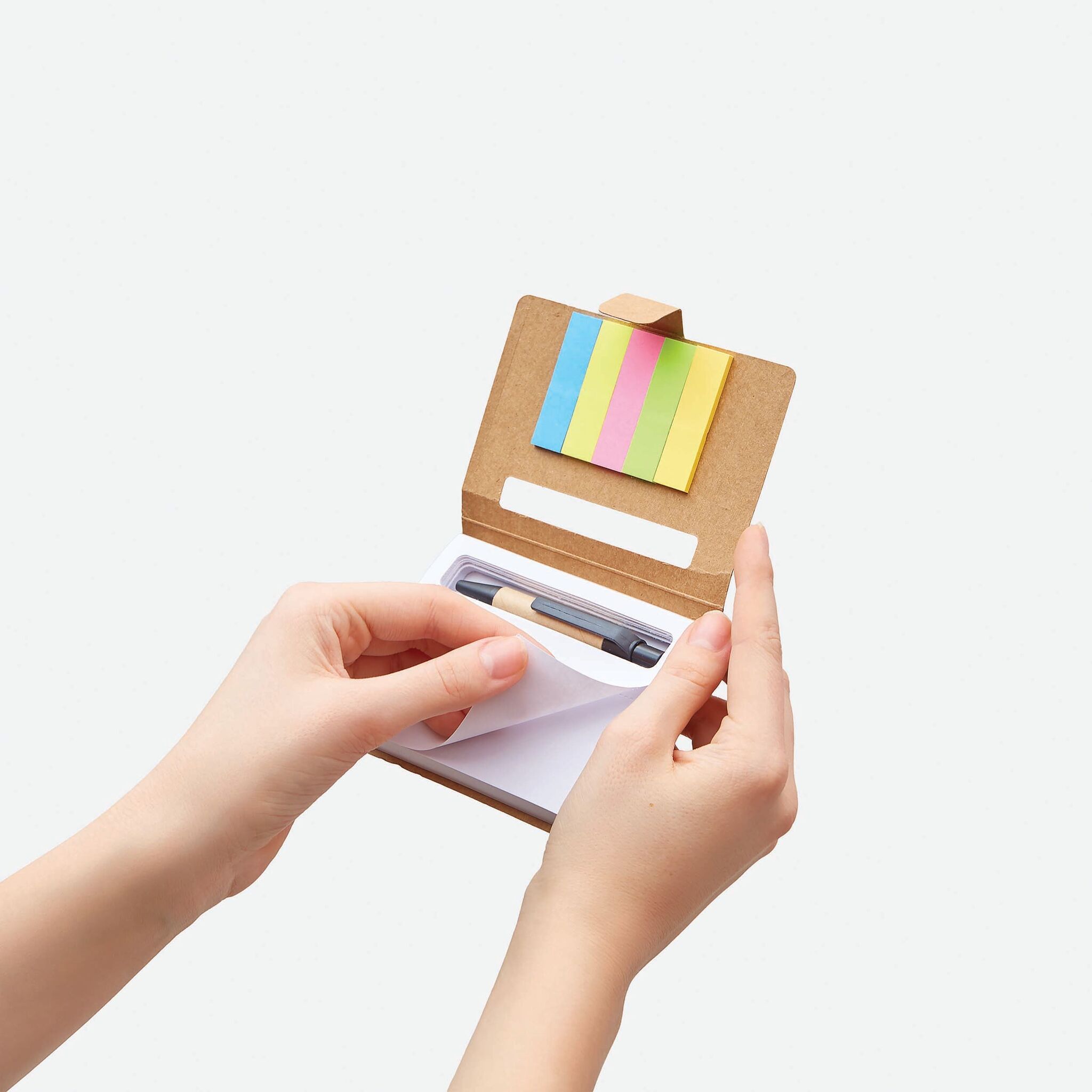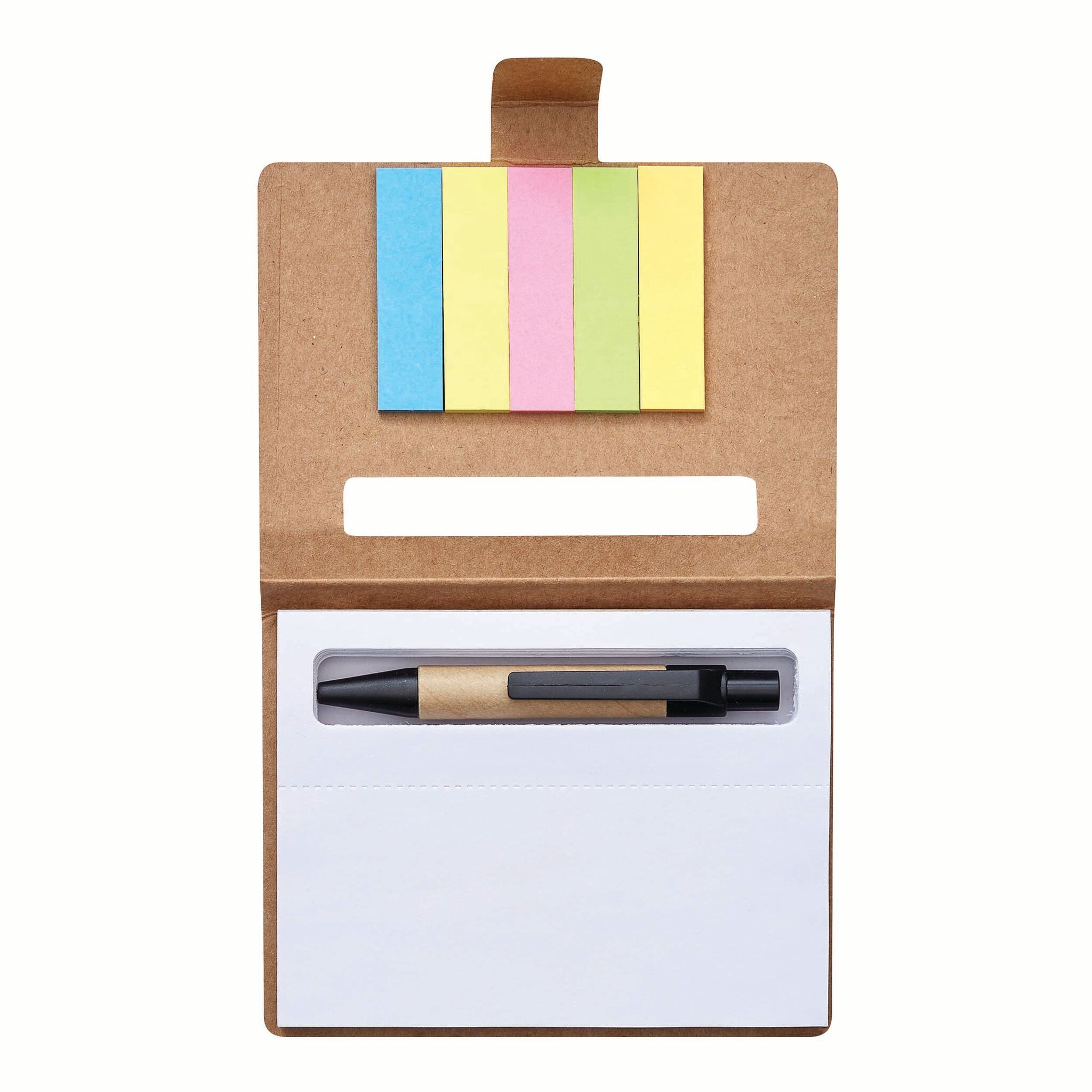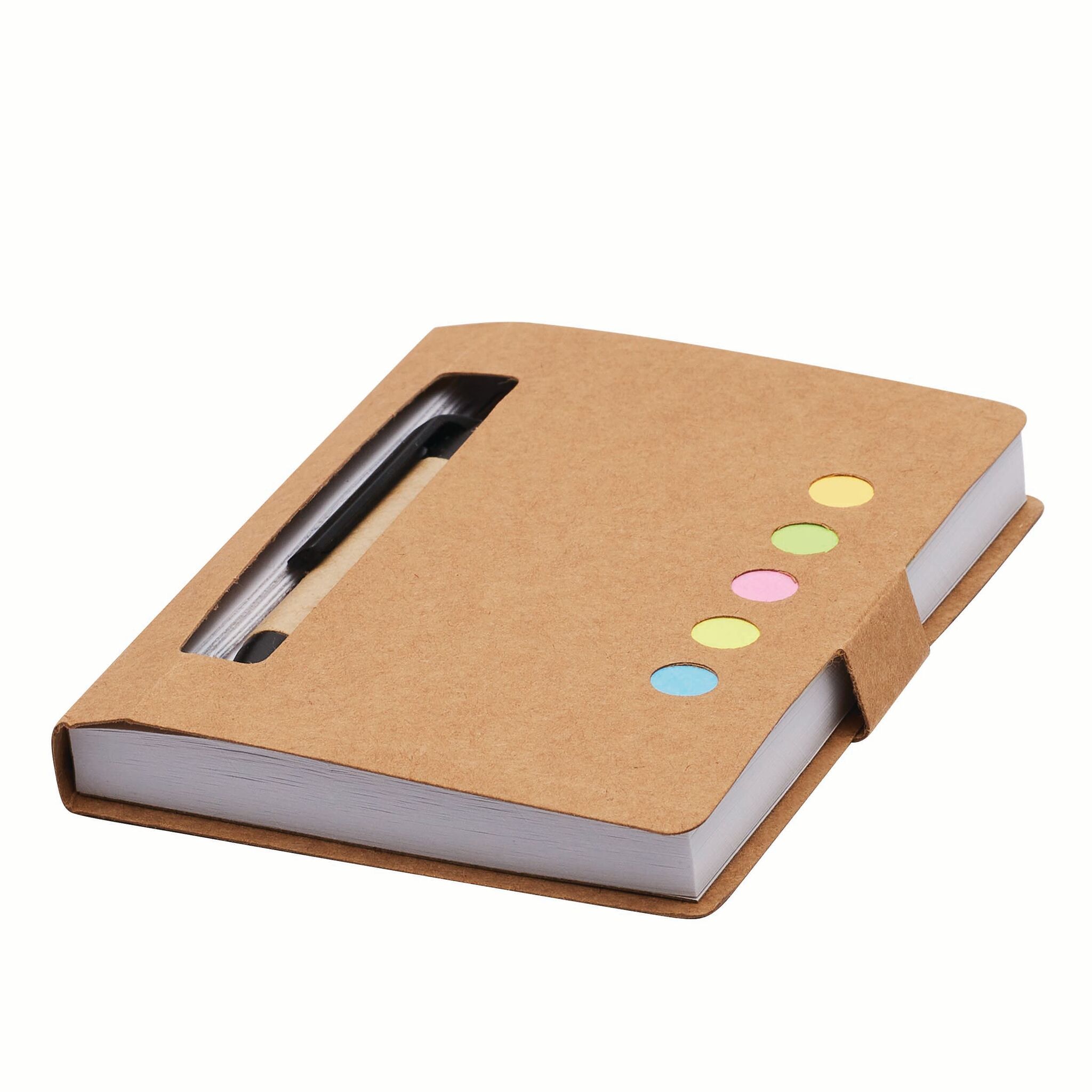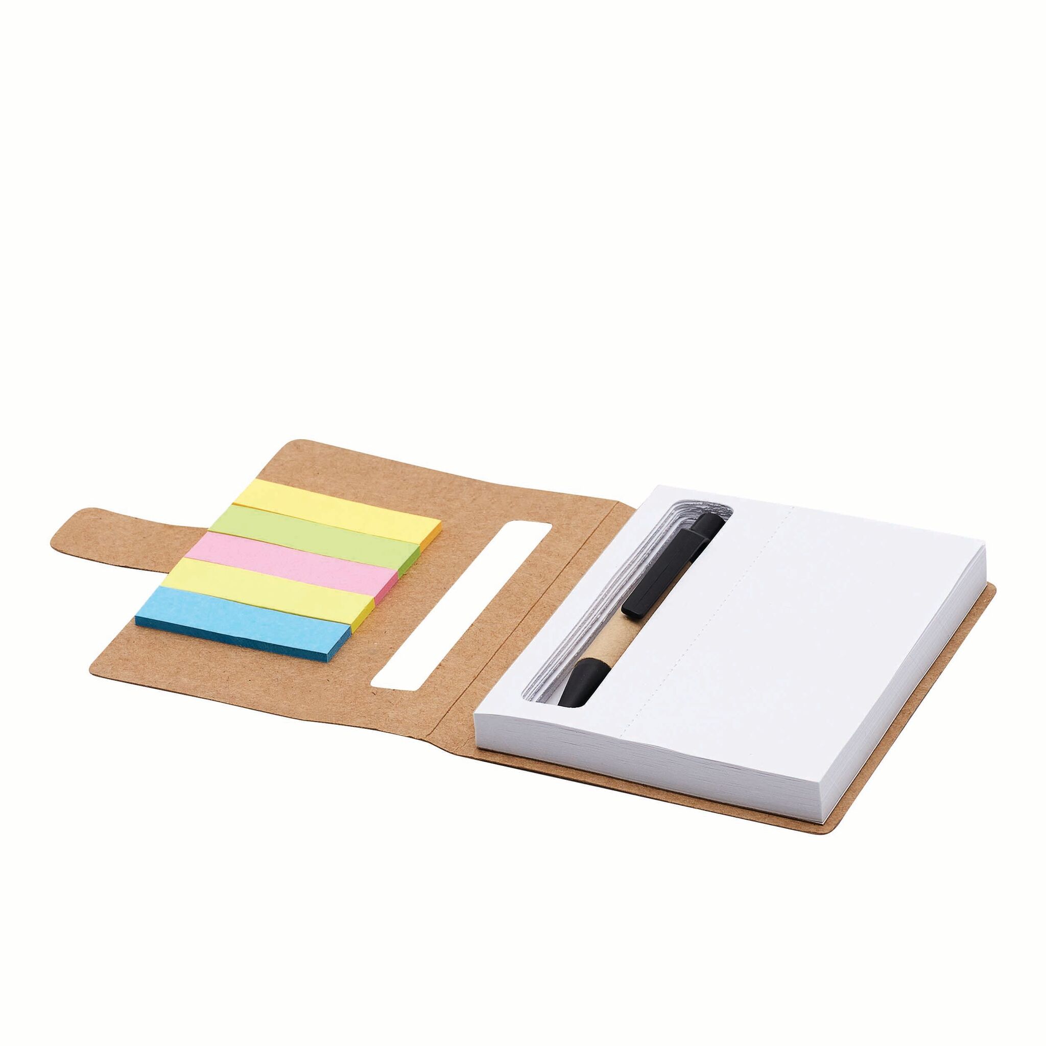 Мини-записная книжка MEMO в состав входит шариковая ручка (цвет чернил - черный), 1 тетрадь с отрывными листами и 5 разноцветных клеящихся закладок - из перерабатываемых материалов