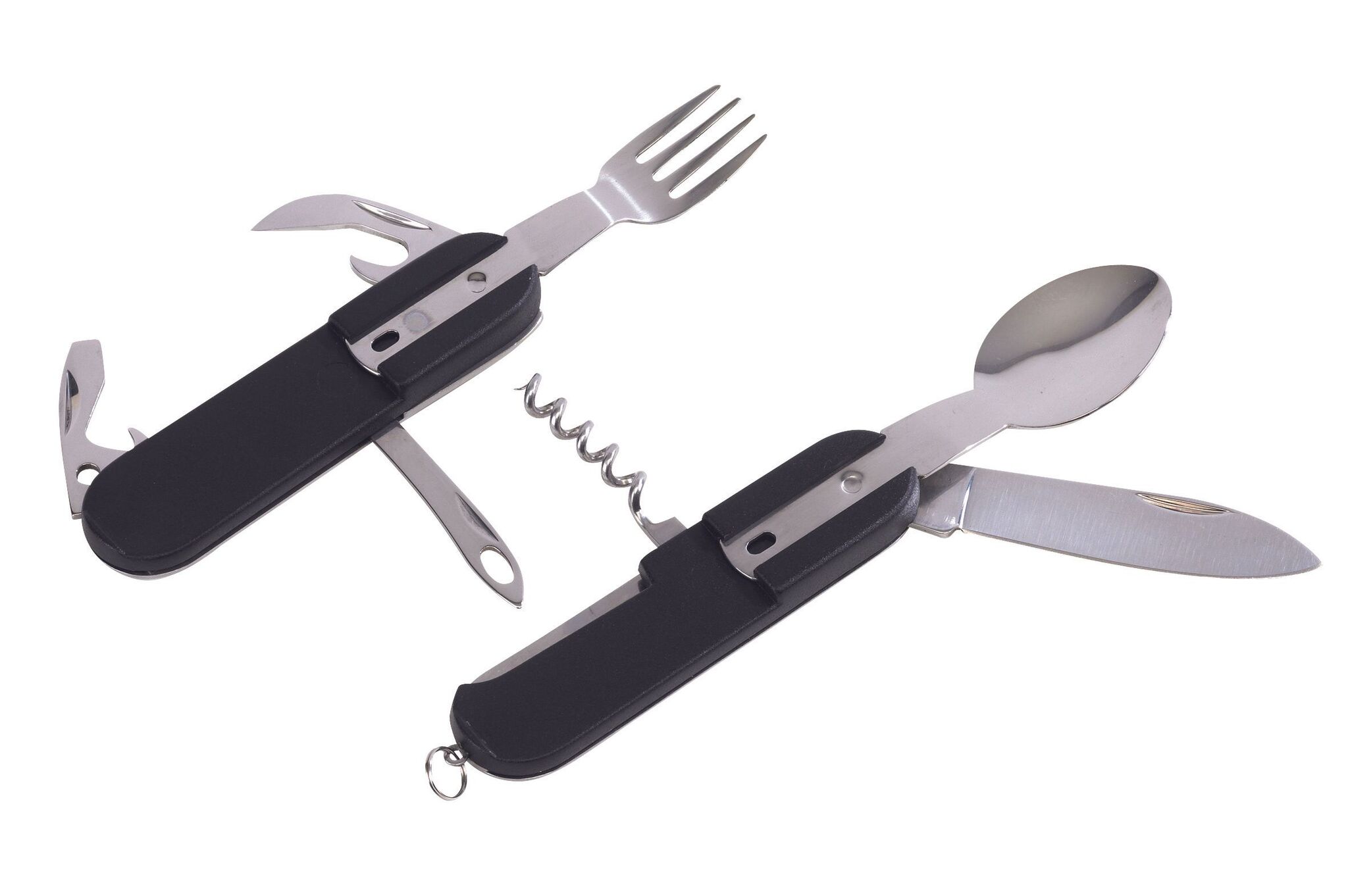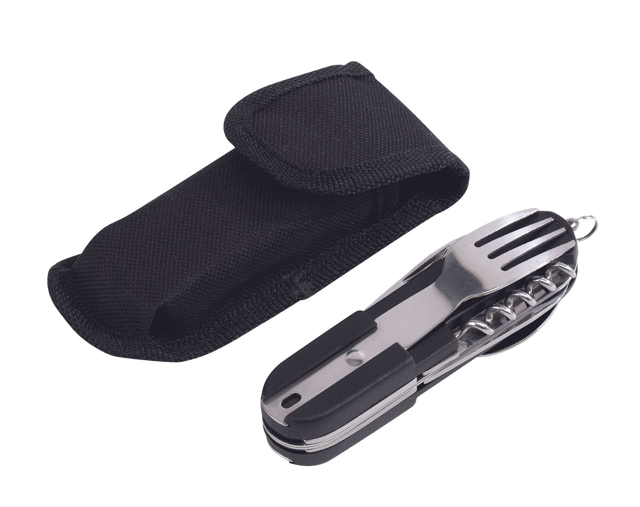 Mултифункциональный набор приборов WILDLIFE , из нержавеющей стали, cостоящий из 7-ми предметов: складной нож, открывалка для бутылок и банок, инструмент для снятия изоляции и штопор, складные вилка и ложка, с кольцом для ключей, упакованный в чехол с петлёй для закрепления на ремне и застёжкой-липучкой