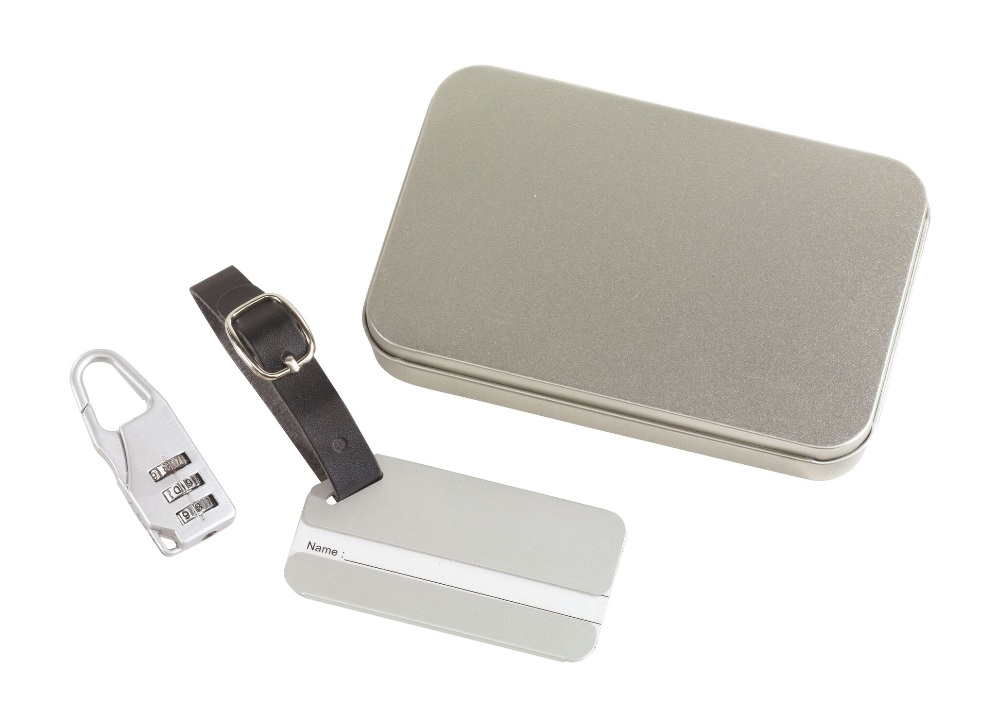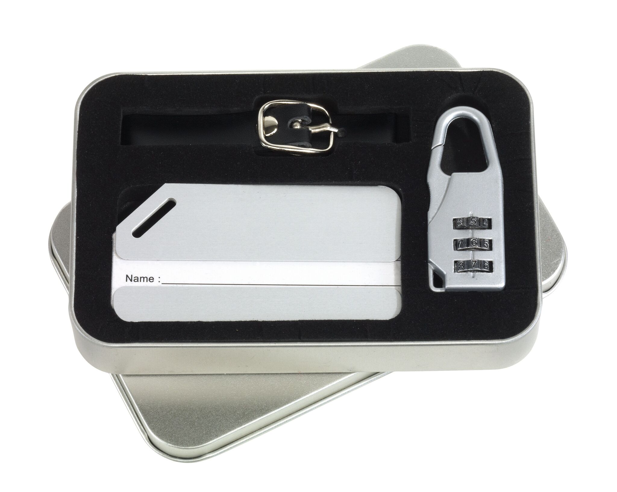 Набор для багажа FAR AWAY в комплект входит металлический брелок с полем для адреса, ремешок с пряжкой для крепления багажа, кодовый замок на карабине, запакован в металлическую коробку.