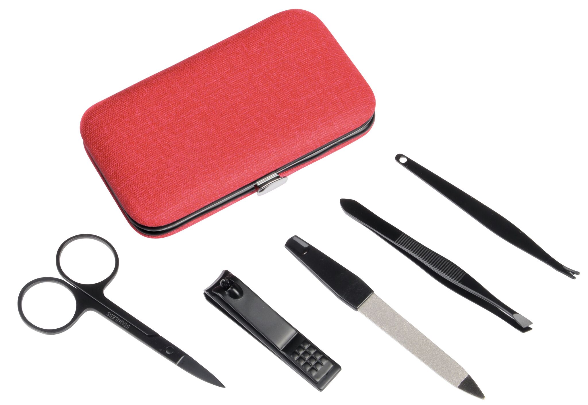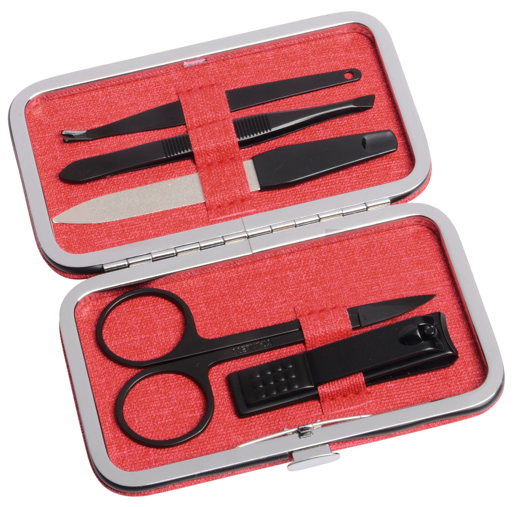 Набор для маникюра PRETTY IN BLACK , из 5 составляющих: пилочка для ногтей, пинцет, триммер для удаления кутикулы, маникюрные ножницы, щипчики, в прямоугольном чехле, сбоку кнопка