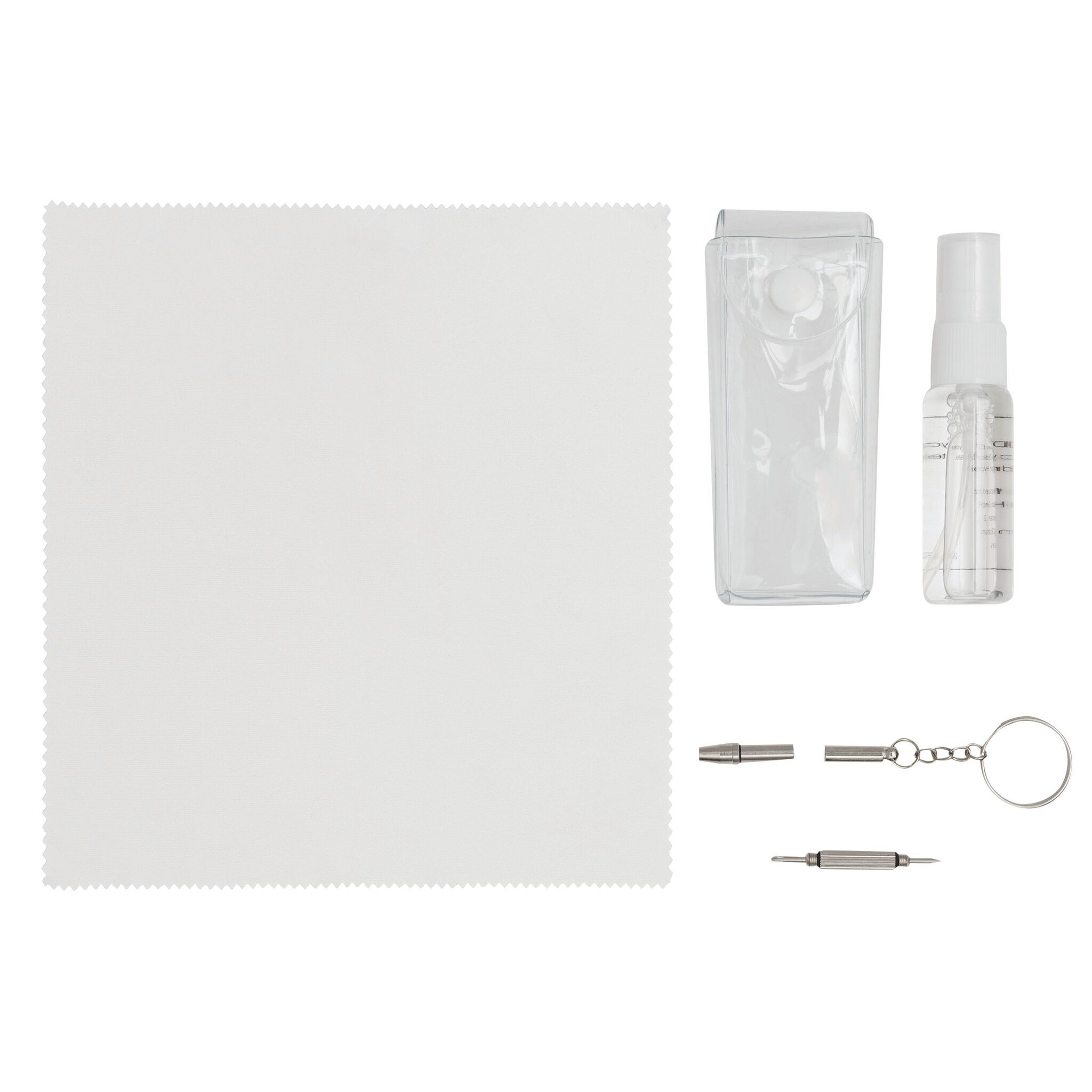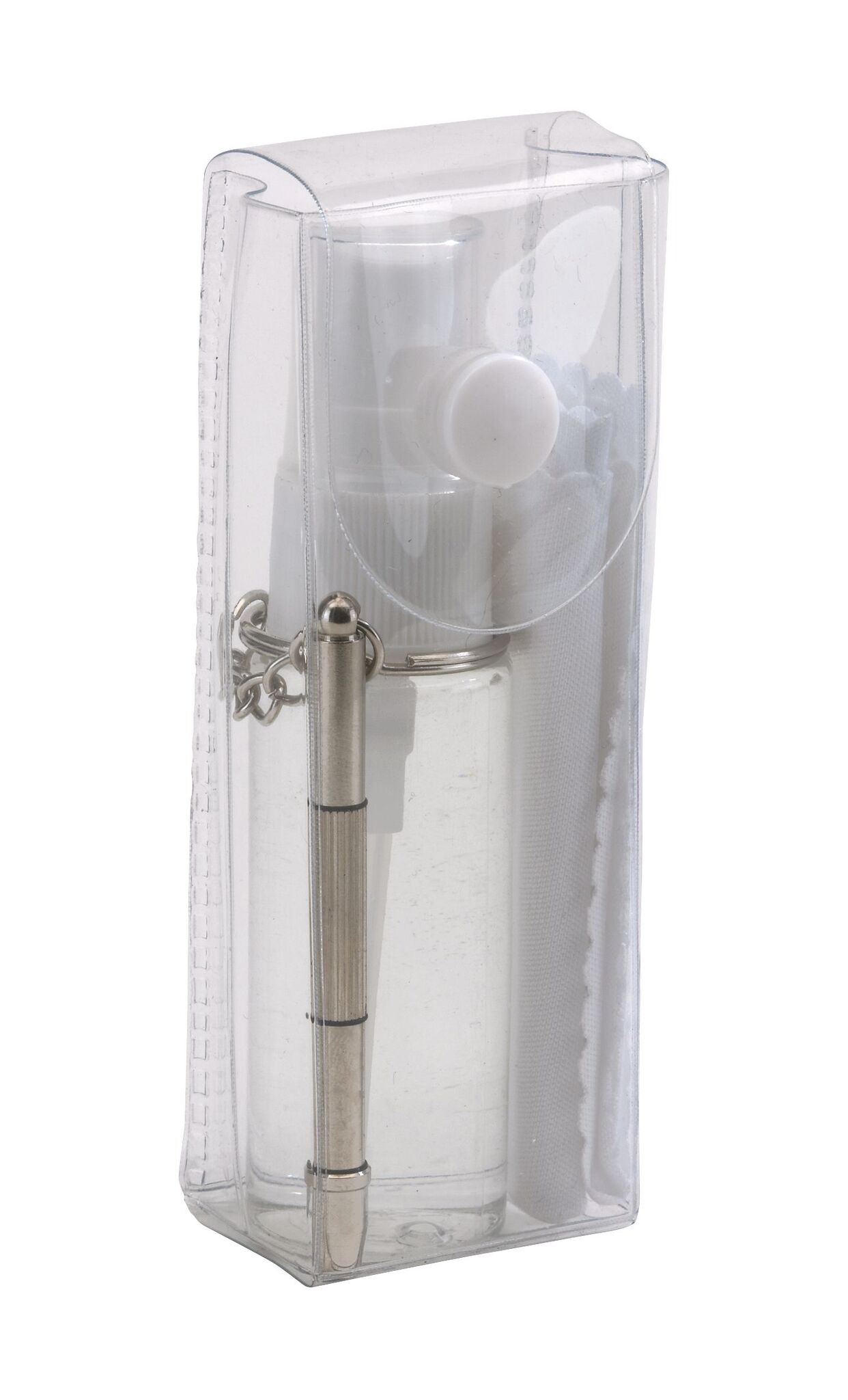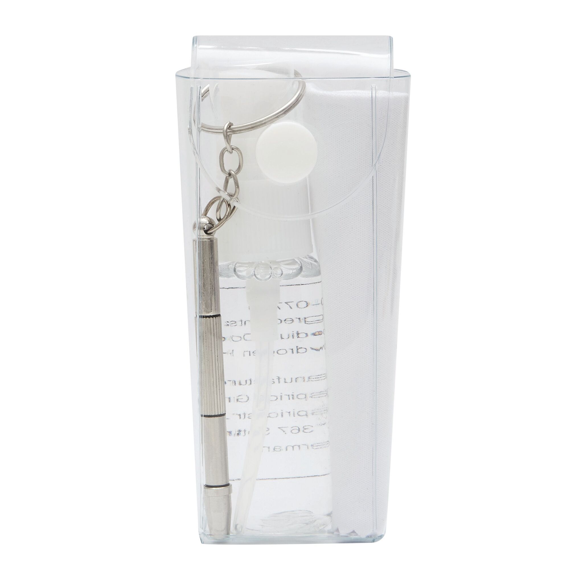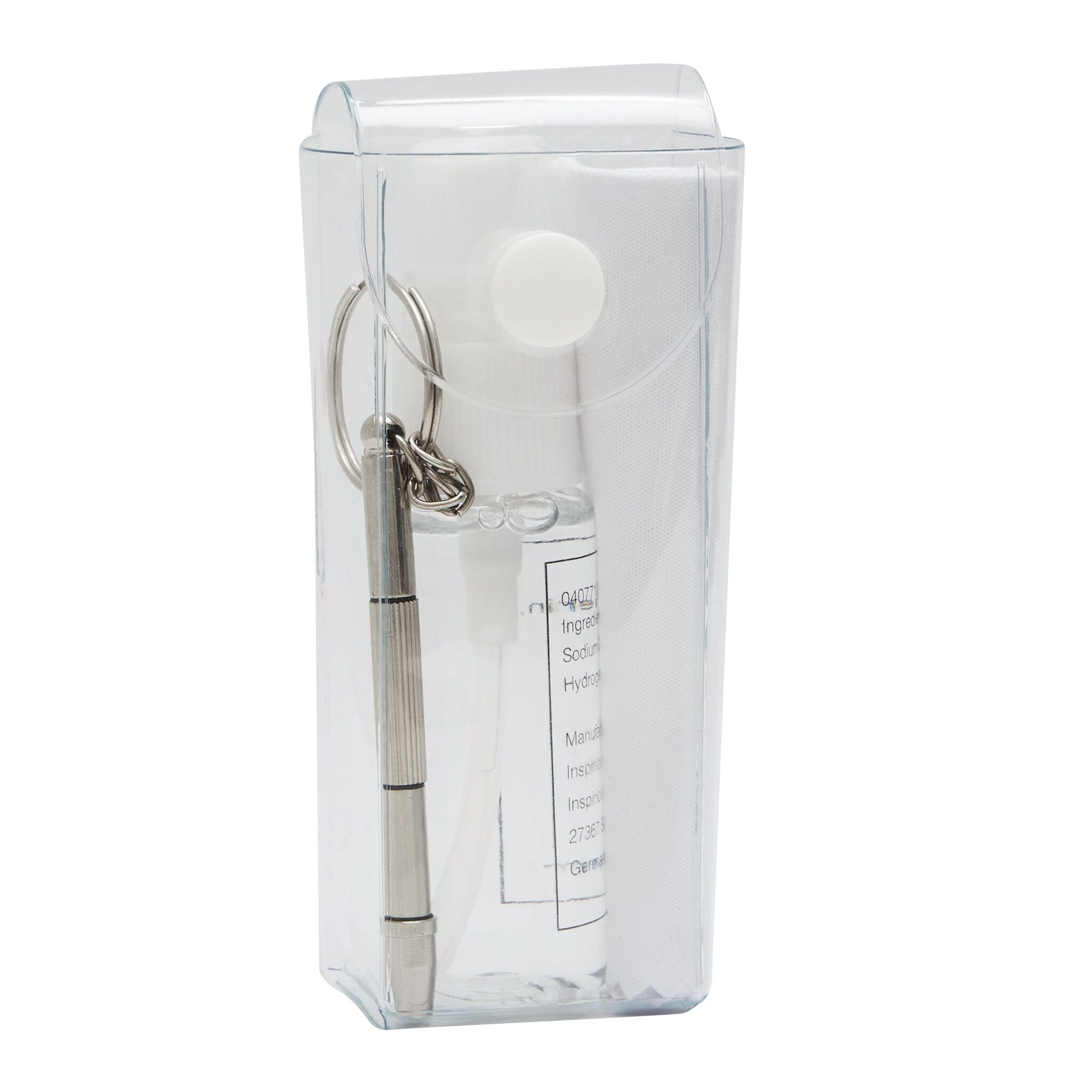 Набор для протирания очков VIEW бутылочка с распылителем, наполненная жидкостью для чистки (примерно 20 мл.), салфетка для протирания очков, миниатюрная отвёртка с кольцом для подвески ключей, в PVC-чехле, закрывающимся на кнопке