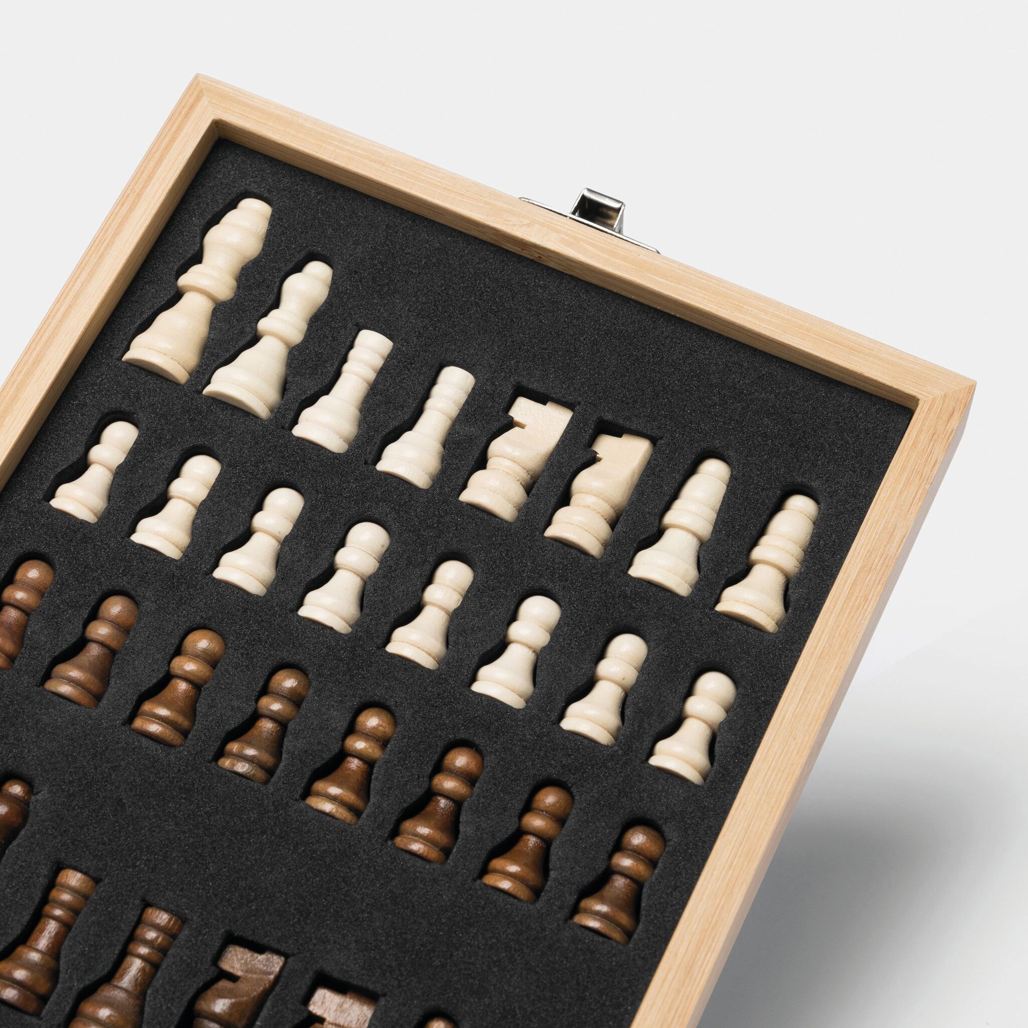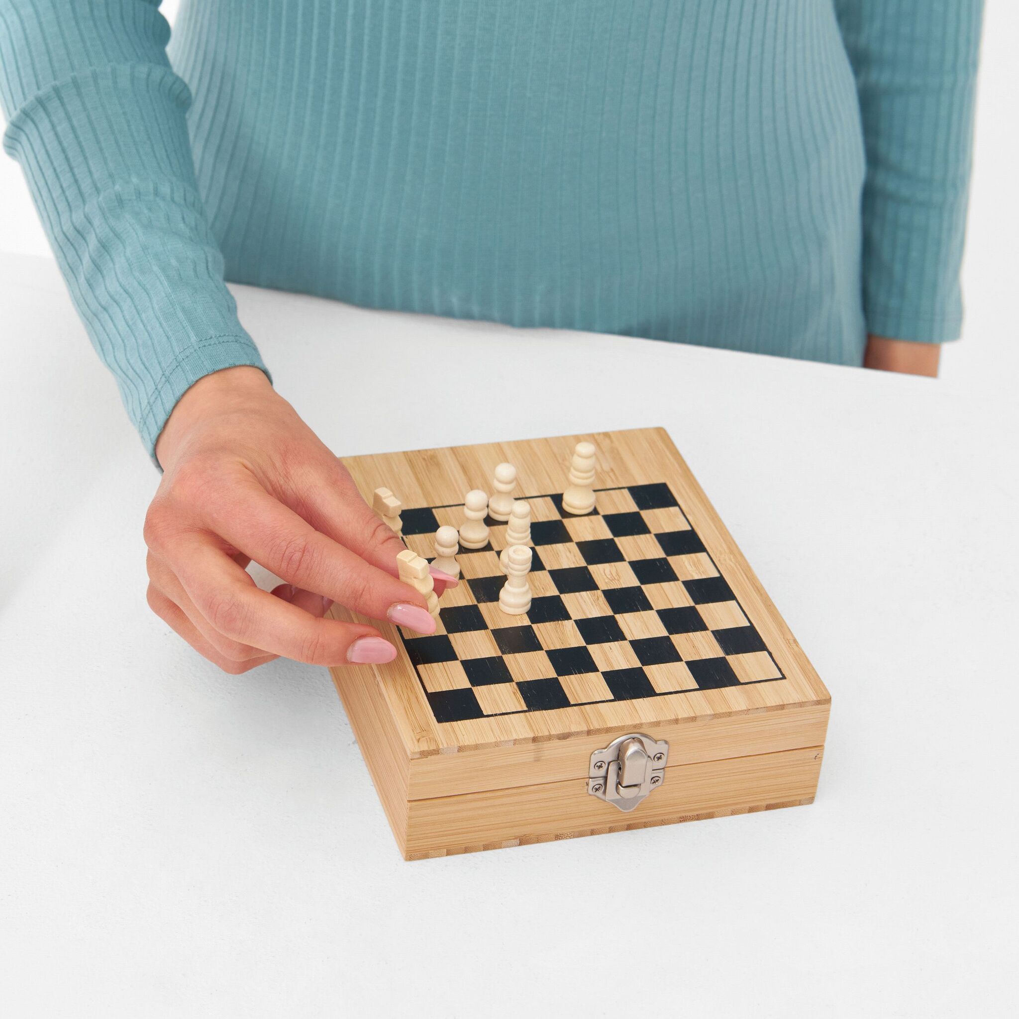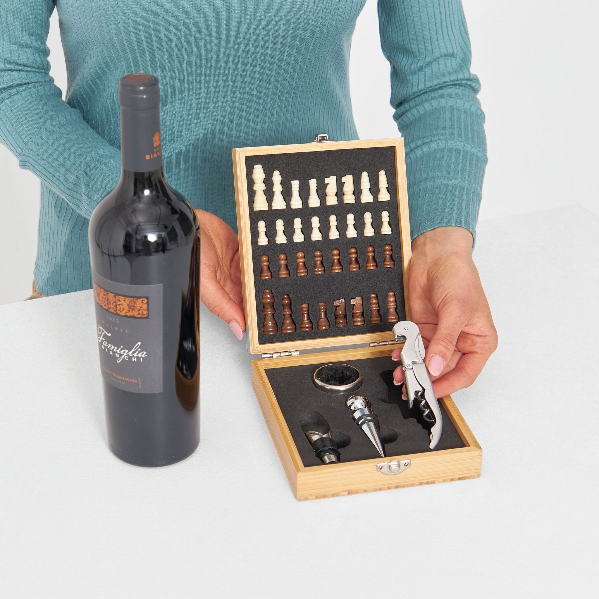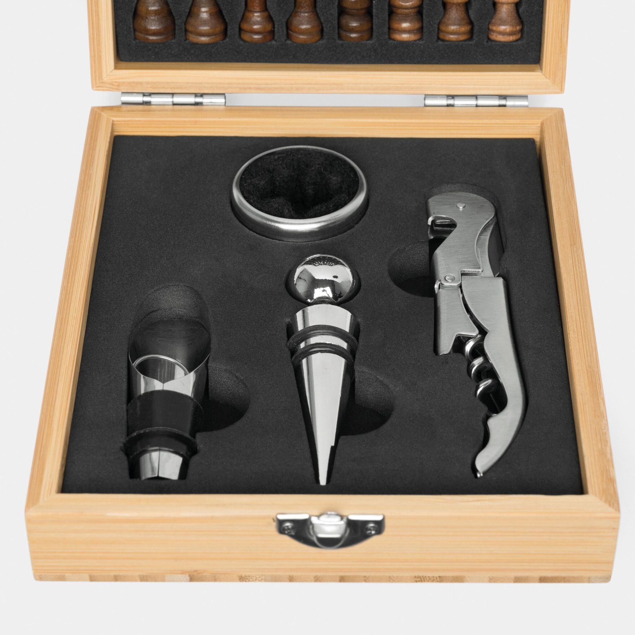 Набор для вина BAMBOO CHESS с игрой в шахматы : состоит из ножа официанта со штопором из нержавеющей стали, капельного кольца из нержавеющей стали, металлической пробки для бутылок, металлического носика и деревянных шахматных фигур, в бамбуковой коробке с игровым полем на крышке.