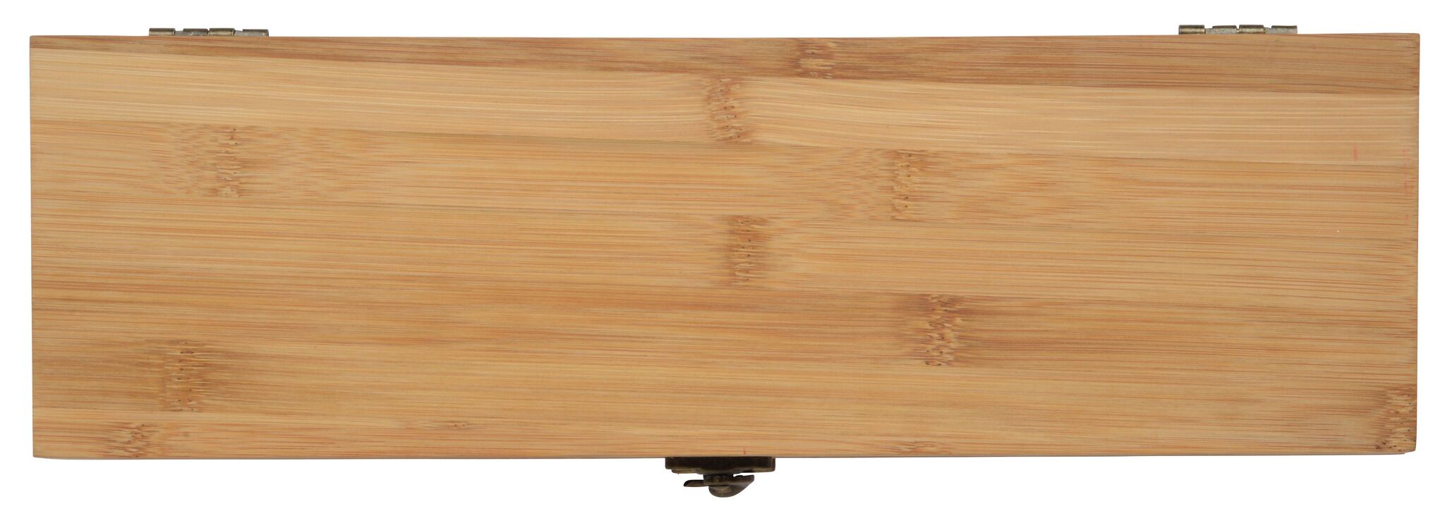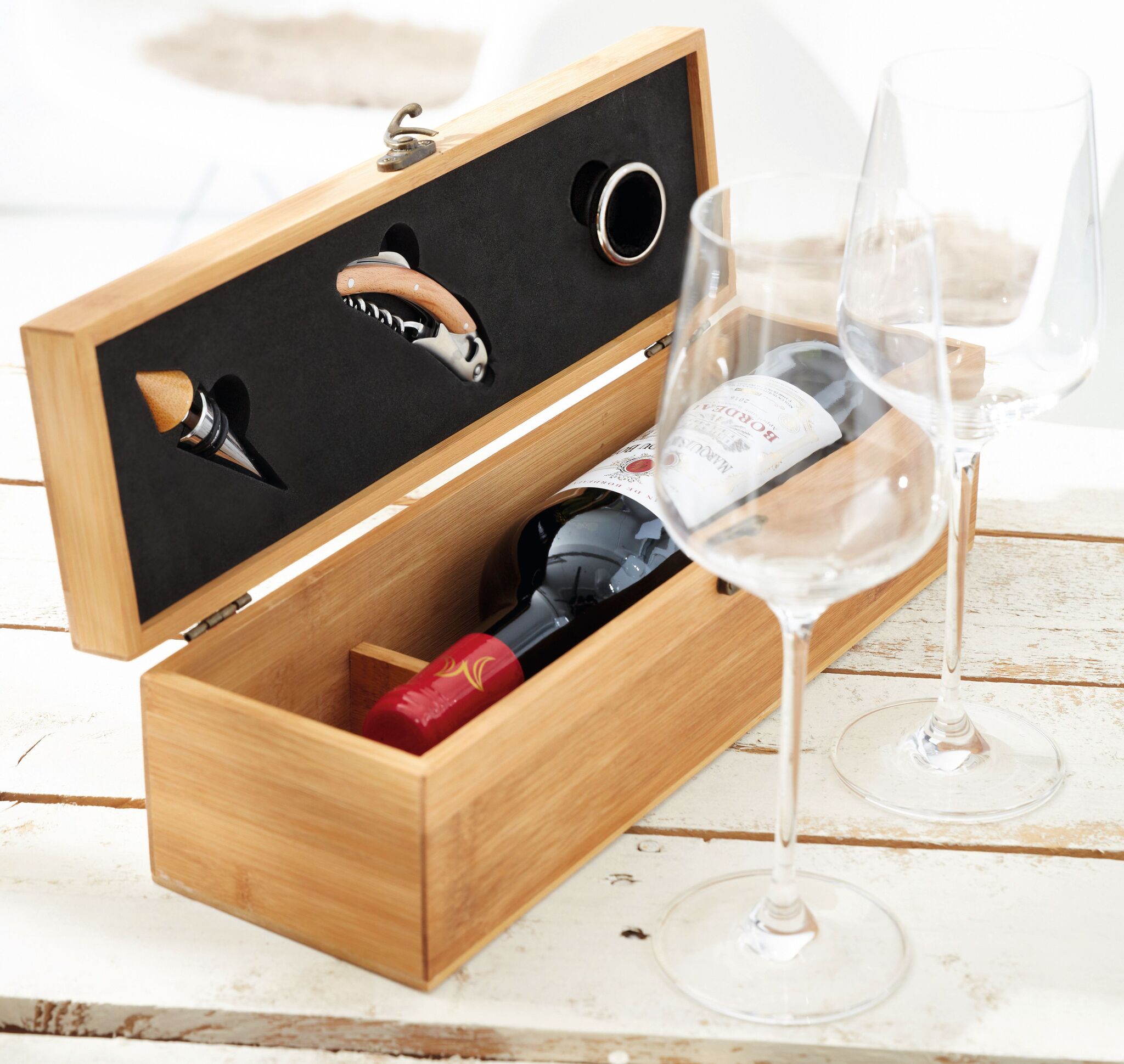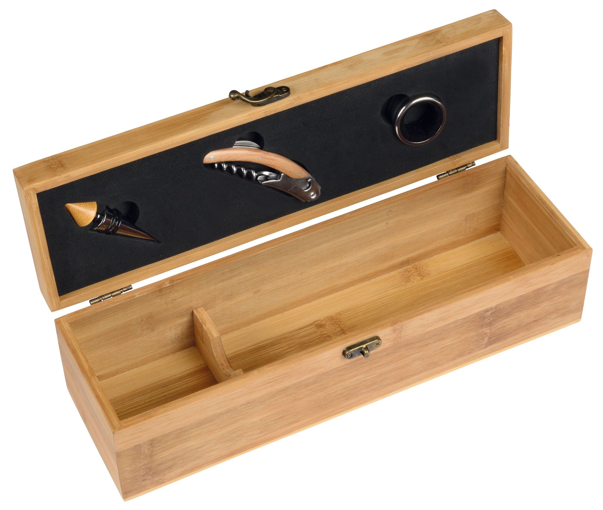Набор для вина BAMBOO PRECIOUS предназначен для 1 бутылки, в набор входит: каплеуловитель из нержавеющей стали, металлическая пробка и нож сомелье со штопором из нержавеющей стали с деревянной ручкой, в бамбуковой упаковке