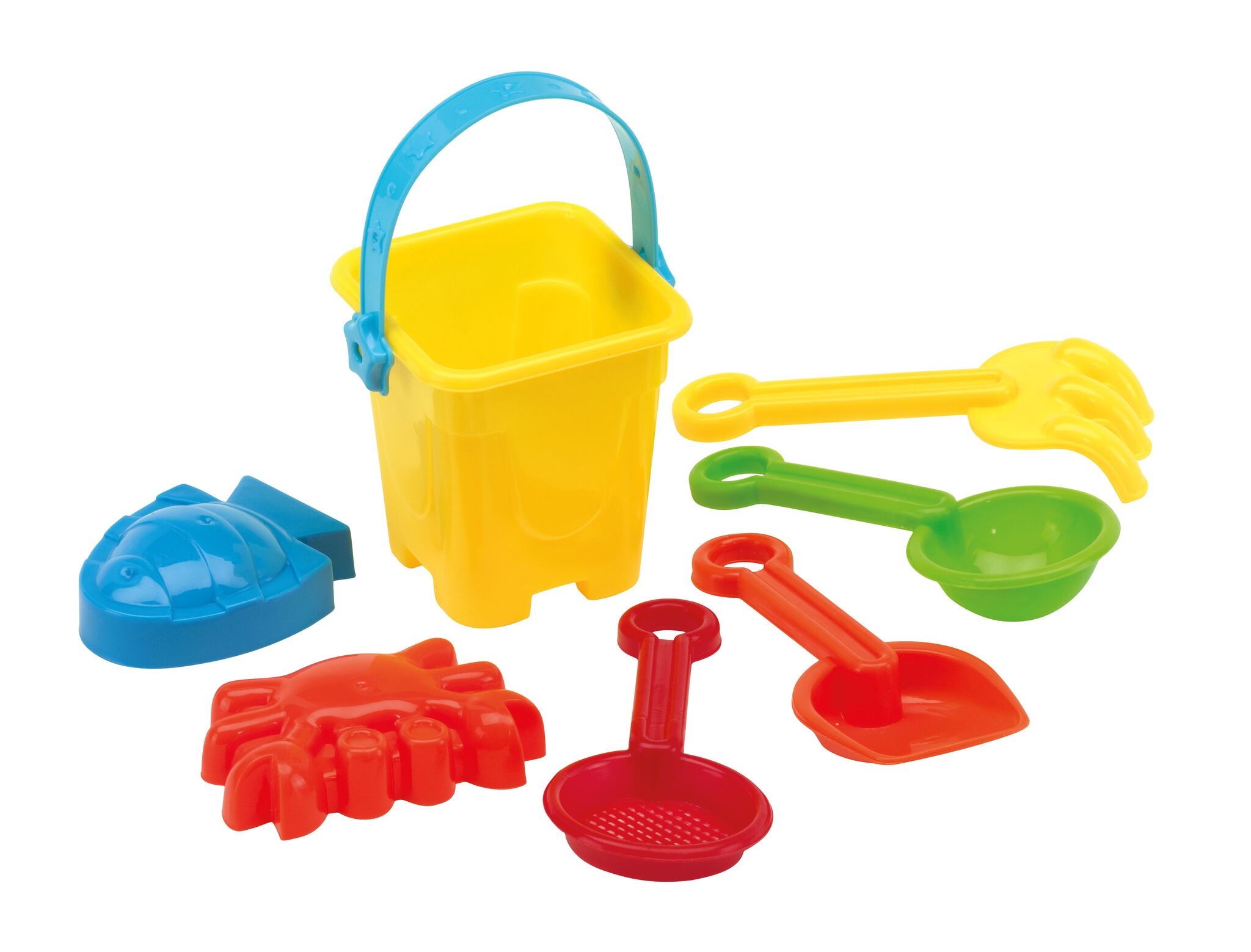 Набор для забавы на пляже BEACHLIFE 7 элементов: состоит из небольшого пластмассового ведёрка с ручкой, лопатки, граблей и пресс-форм. Ведёрка и пресс-формы отличаются по цвету и форме, запакован в сетчатый мешок с этикеткой в форме рыбки, mix цветов