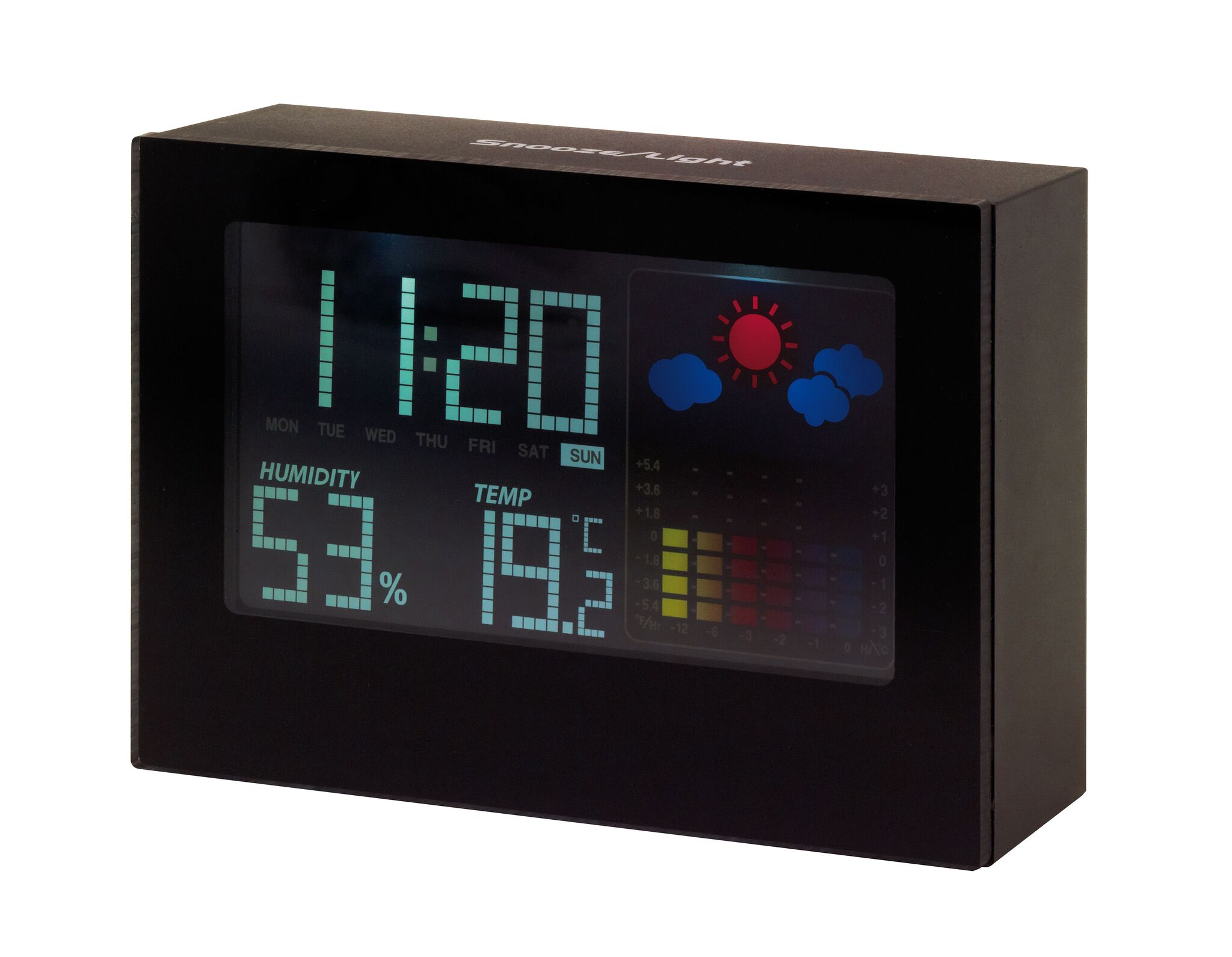 Настольные часы COLOUR с прогнозом погоды, будильником, календарём, гигрометром и термометром (°C, °F), дисплей с подсветкой - чёрный экран с разноцветными элементами, с разъёмом для адаптера (без адаптера)
