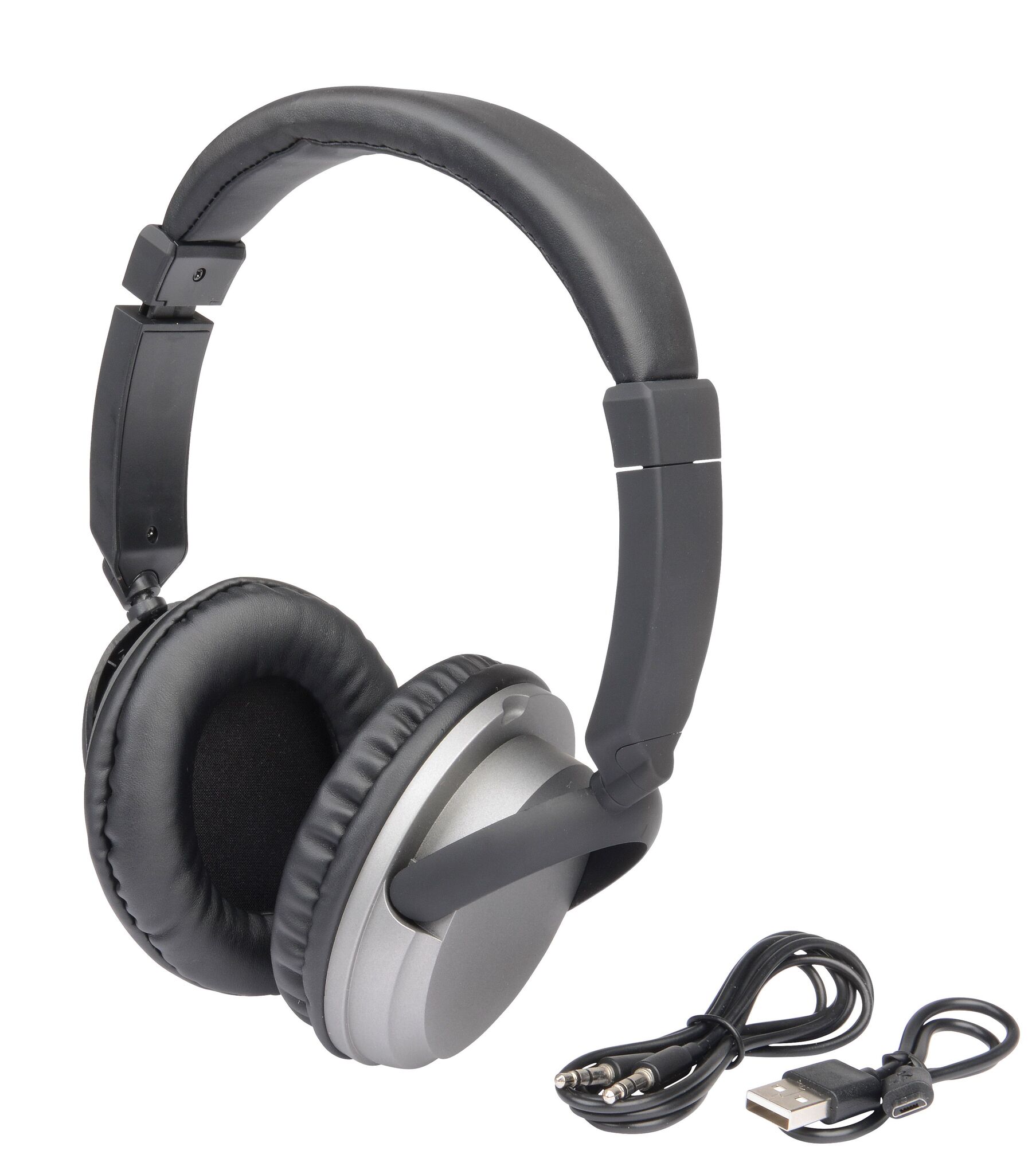 Наушники с беспроводным соединением COMFY : амбушюры и мягкий оголовник, правый наушник с интегрированной функцией управления, регулируемый наголовник, встроенная литиевая аккумуляторная батарея ёмкостью 180 mAh, время работы ок. 1,5-2 h, в наборе USB-кабель для зарядки со штекером Micro-USB (длина ок.30 см) и аудио-кабель (длина ок. 120 см), работает при разряженной батареи через аудио-кабель