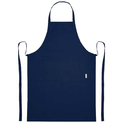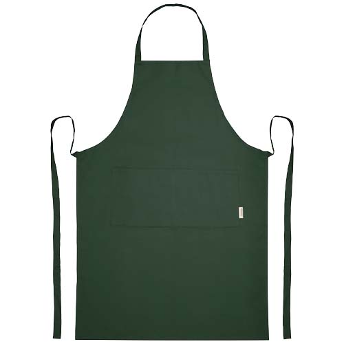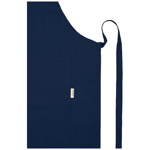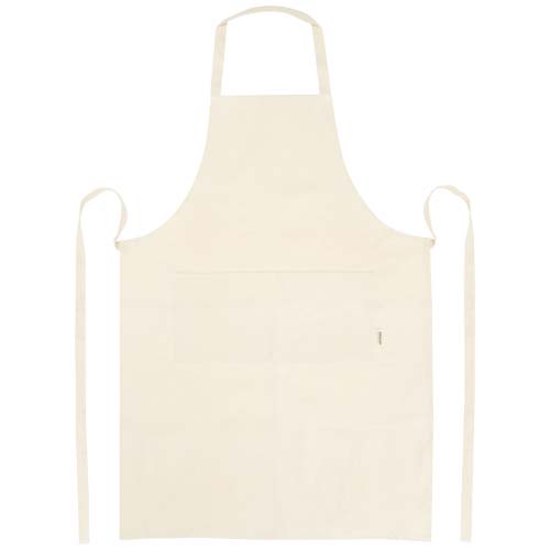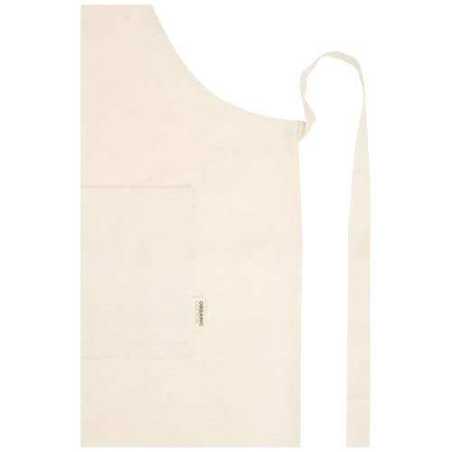 Фартук изготовлен из 100% сертифицированного OCS органического хлопка плотностью 200 г/м² из Индии, имеет 2 смежных кармана общим размером 45 х 20 см и завязывается сзади на завязке длиной 1 метр. Длина шейного ремешка: 55 см.