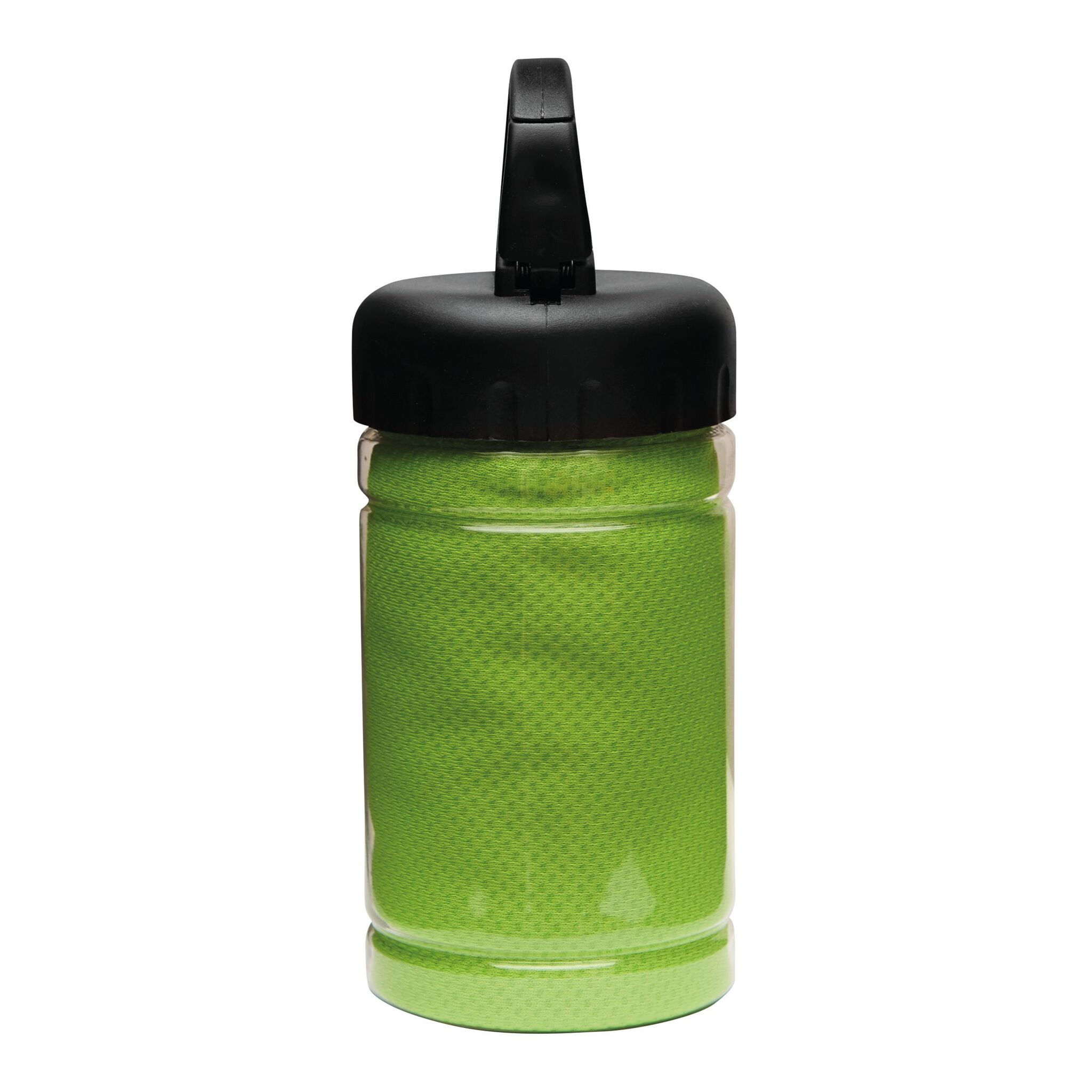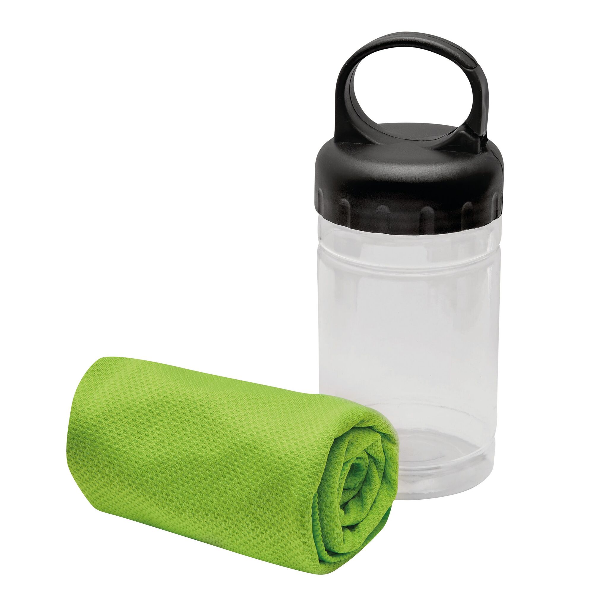 Охлаждающее полотенце CHILLING в прозрачной бутылке, с солнцезащитным фактором. Для продолжительного эффекта охлаждения необходимо намочить полотенце водой либо наполнить бутылку с полотенцем водой и потрясти, крышка с цветным карабином- идеально для занятий спортом.