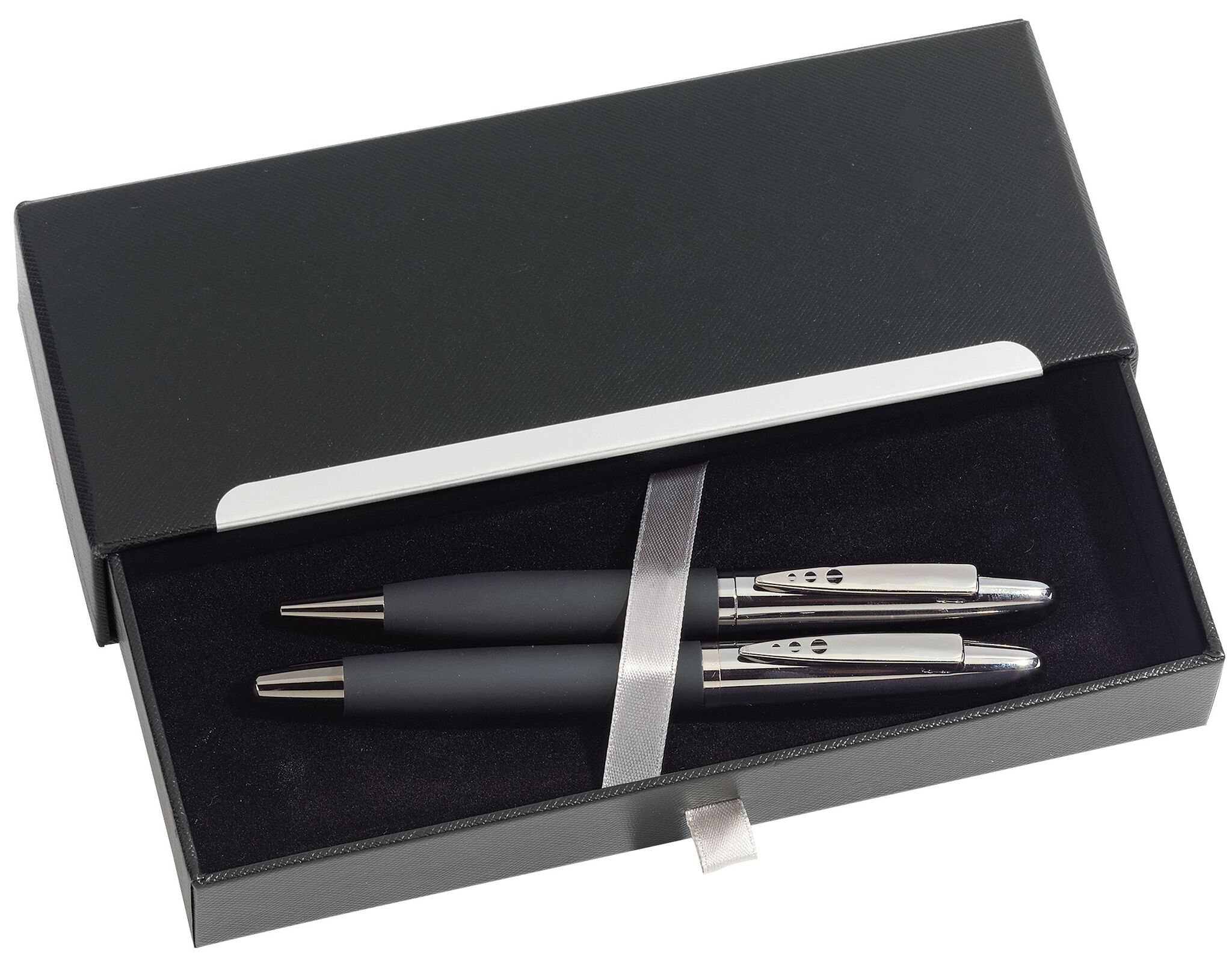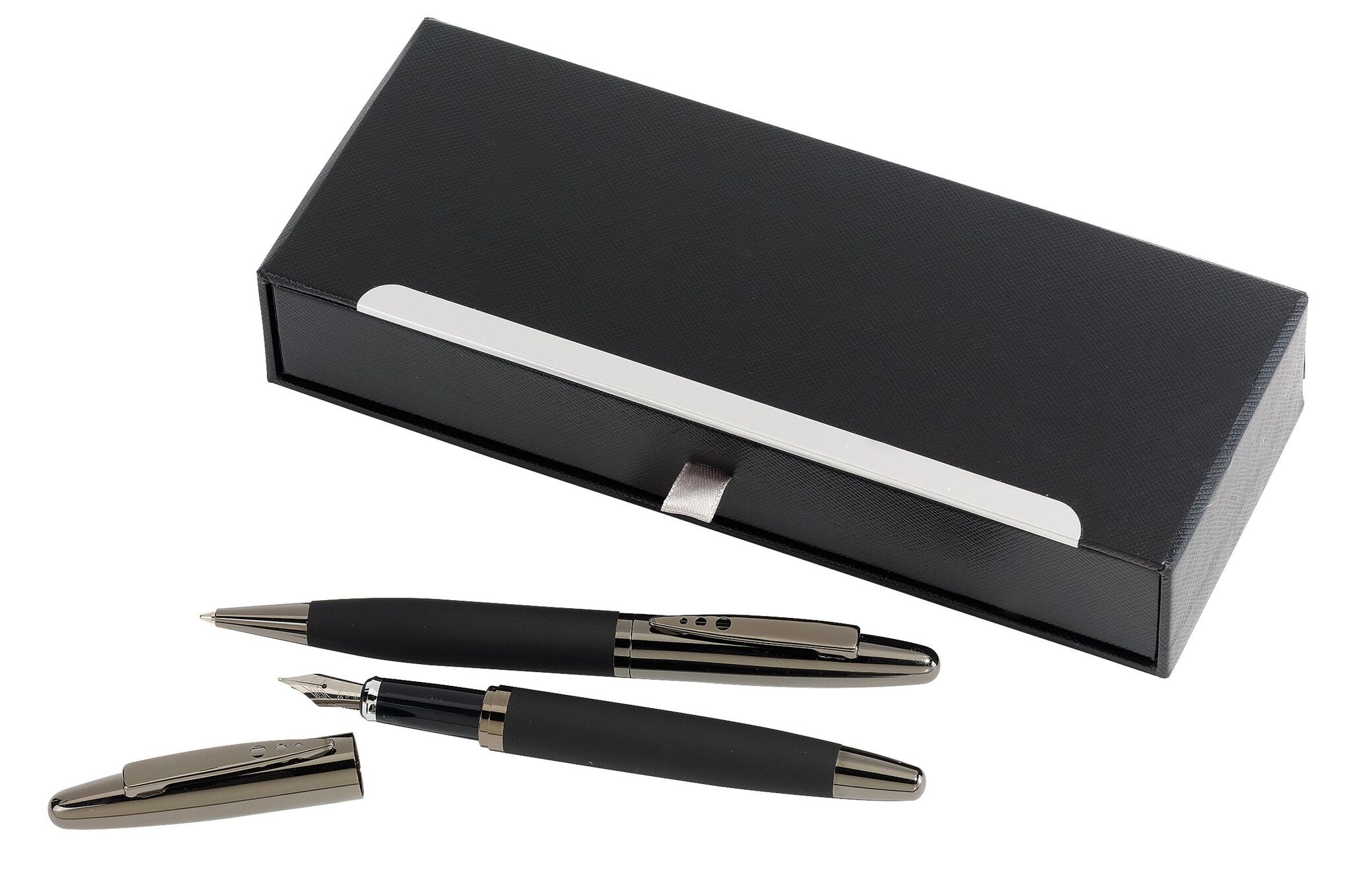 Письменный набор BLACK ELEGANCE состоит из шариковой ручки с поворотным механизмом и металлическим стержнем (чёрные чернила), авторучки (синие чернила) из матового металла с прорезиненной поверхностью, декоративная коробка