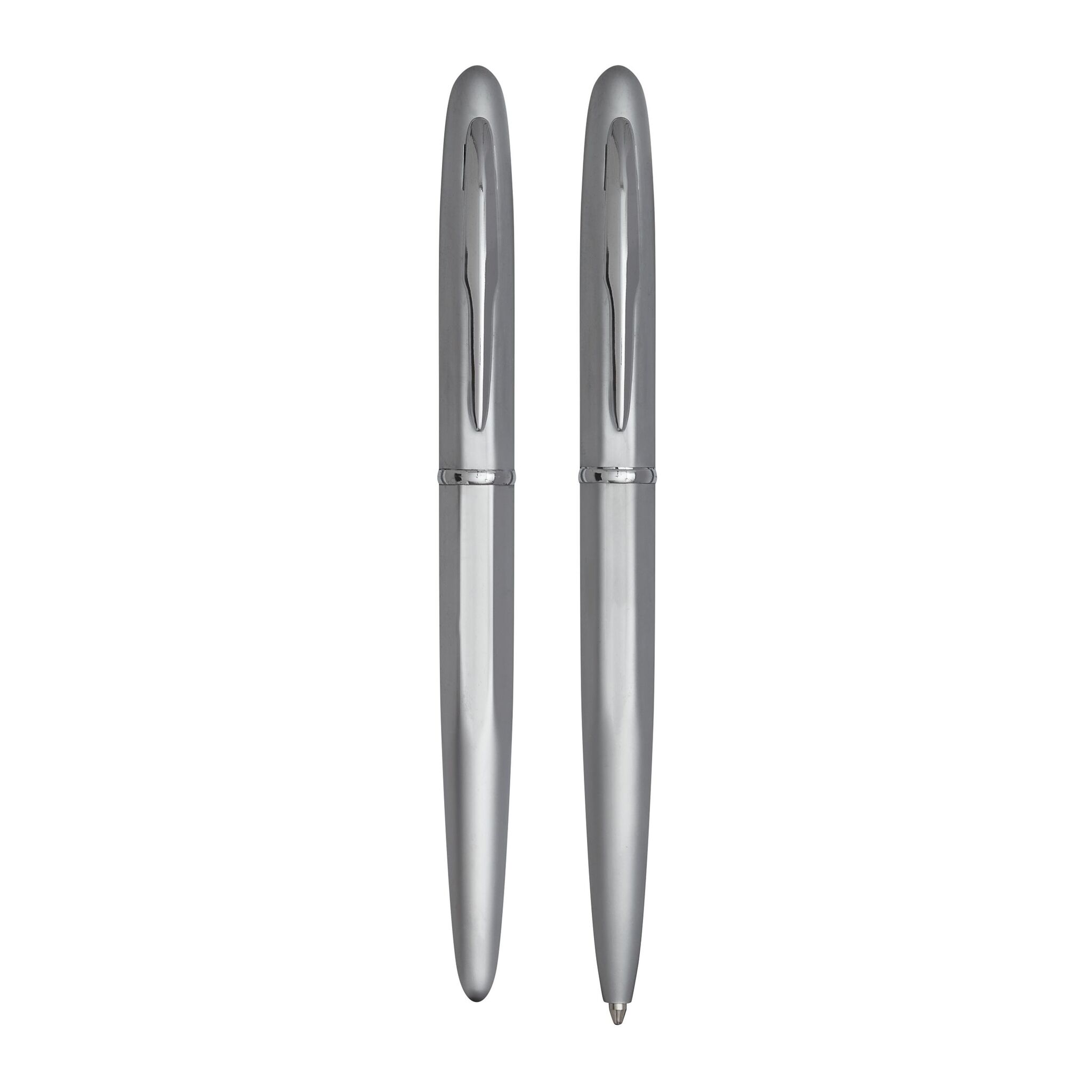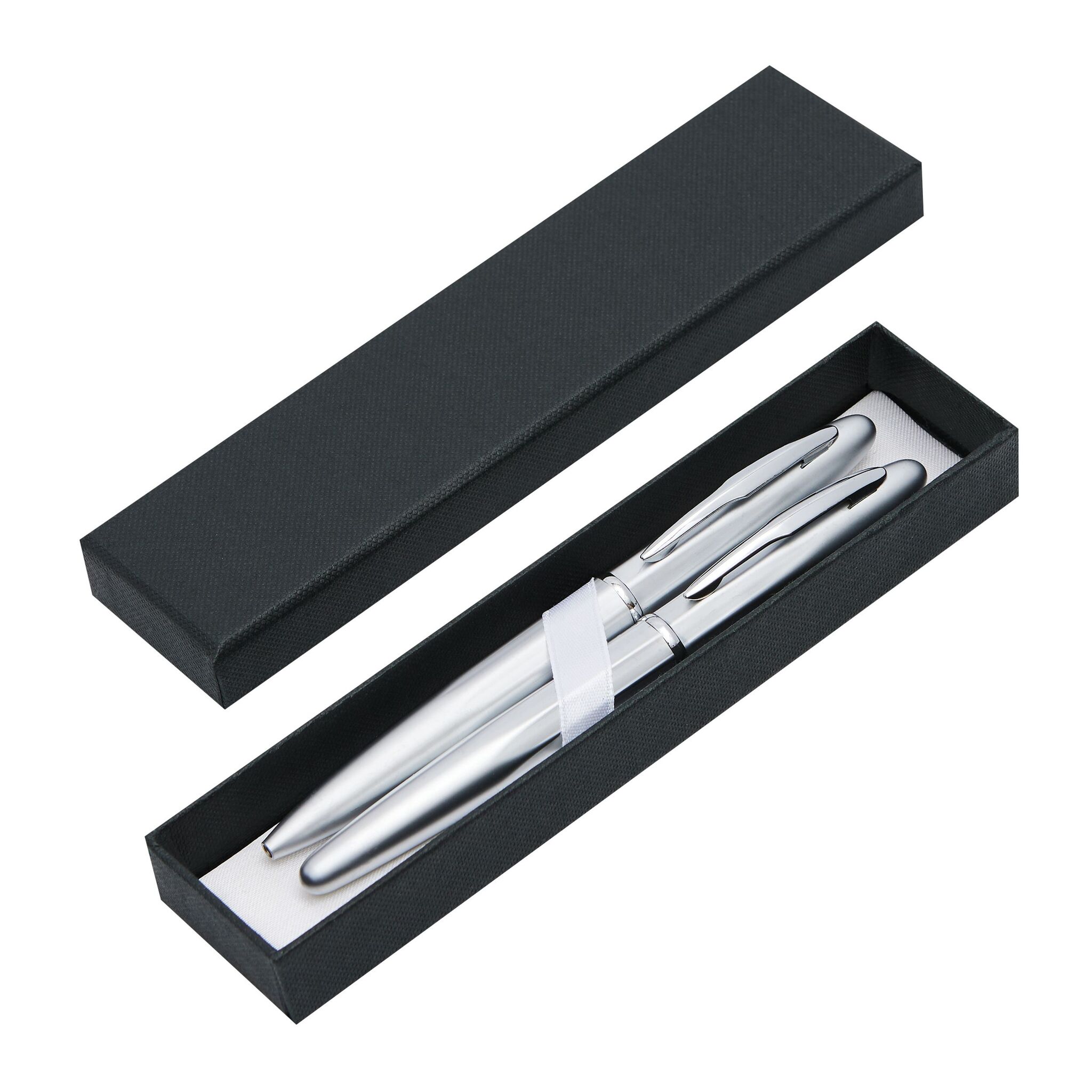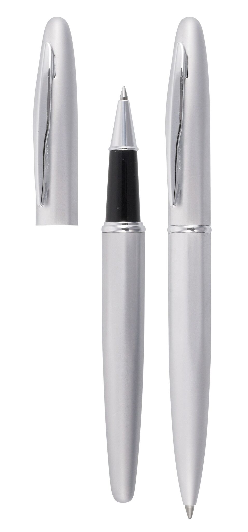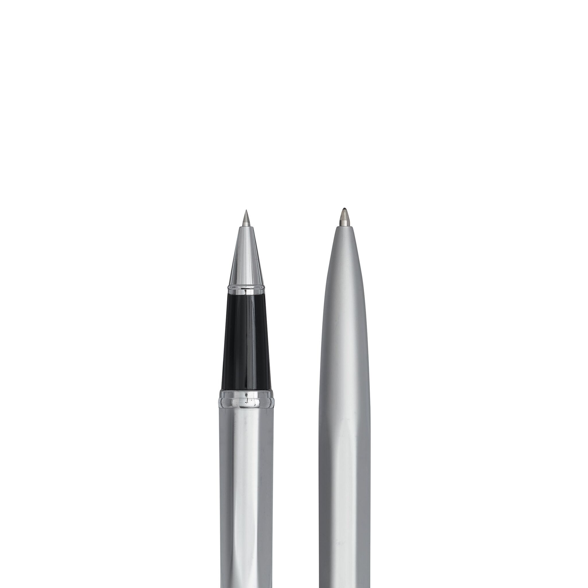 Письменный набор COMTESSE : состоит из металлической ручки-роллера с колпачком (черные чернила) и металлической шариковой ручки с поворотным механизмом (синие чернила), с хромированными элементами; поставляется в подарочной коробке