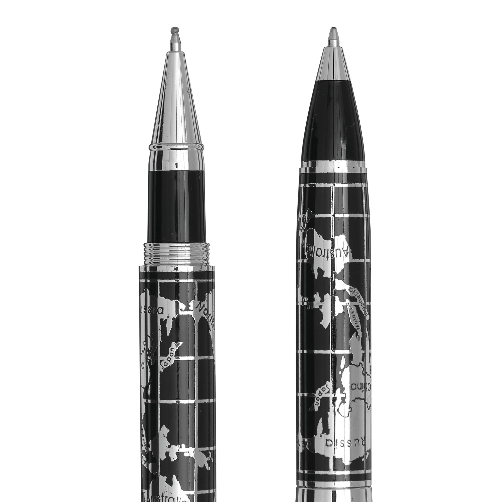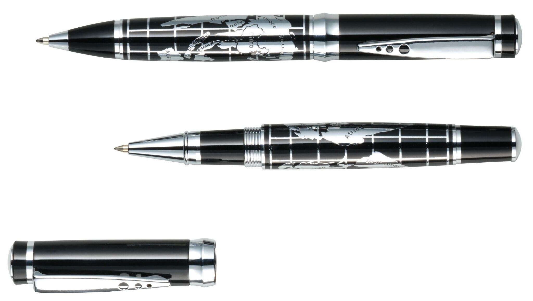 Письменный набор INTERCONTINENTAL : состоит из металлической ручки-роллера с колпачком (чёрные чернила) и металлической шариковой ручки с поворотным механизмом (синие чернила), с блестящей хромированной картой мира на корпусе; поставляется в стильной коробке с алюминиевой пластиной