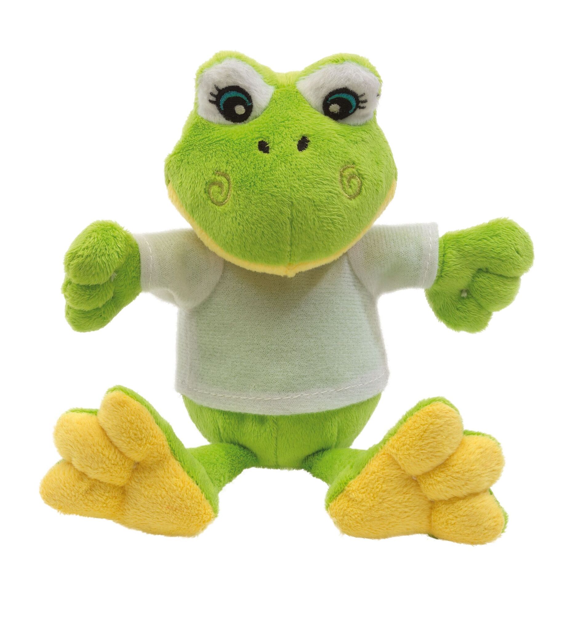 Плюшевая лягушка FRIEDA с мягкой шкурой и белой, отдельно упакованной, майкой для нанесения логотипа