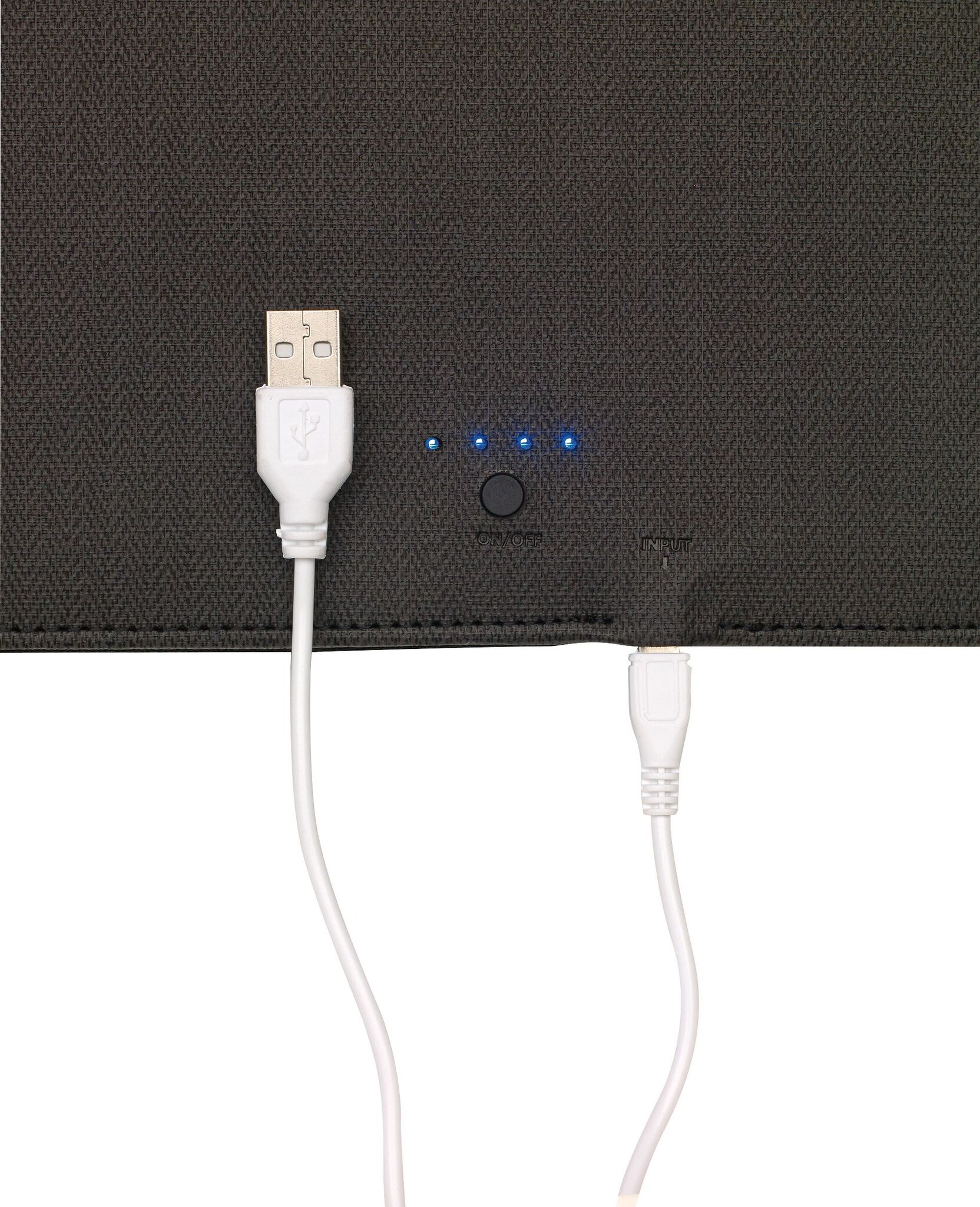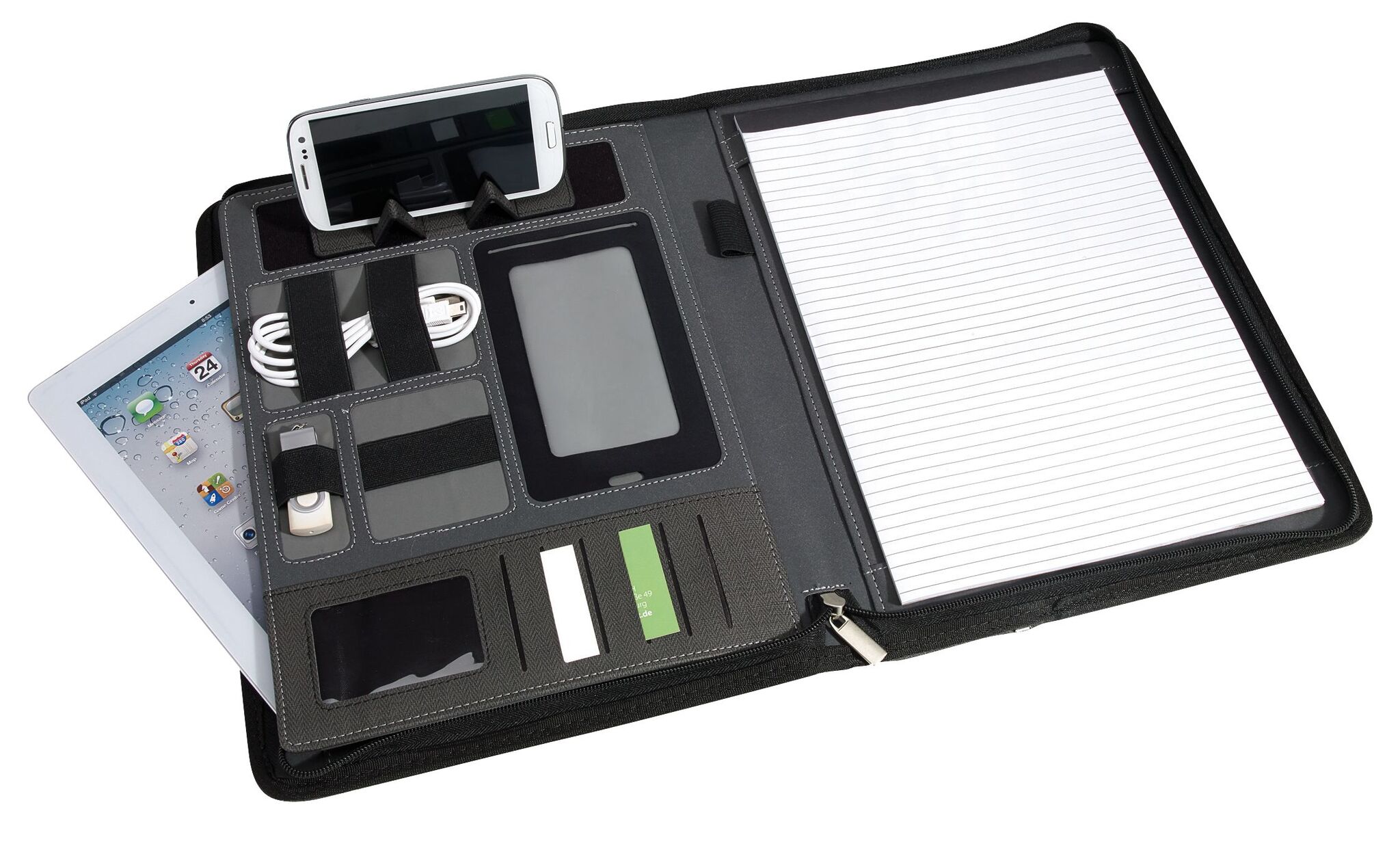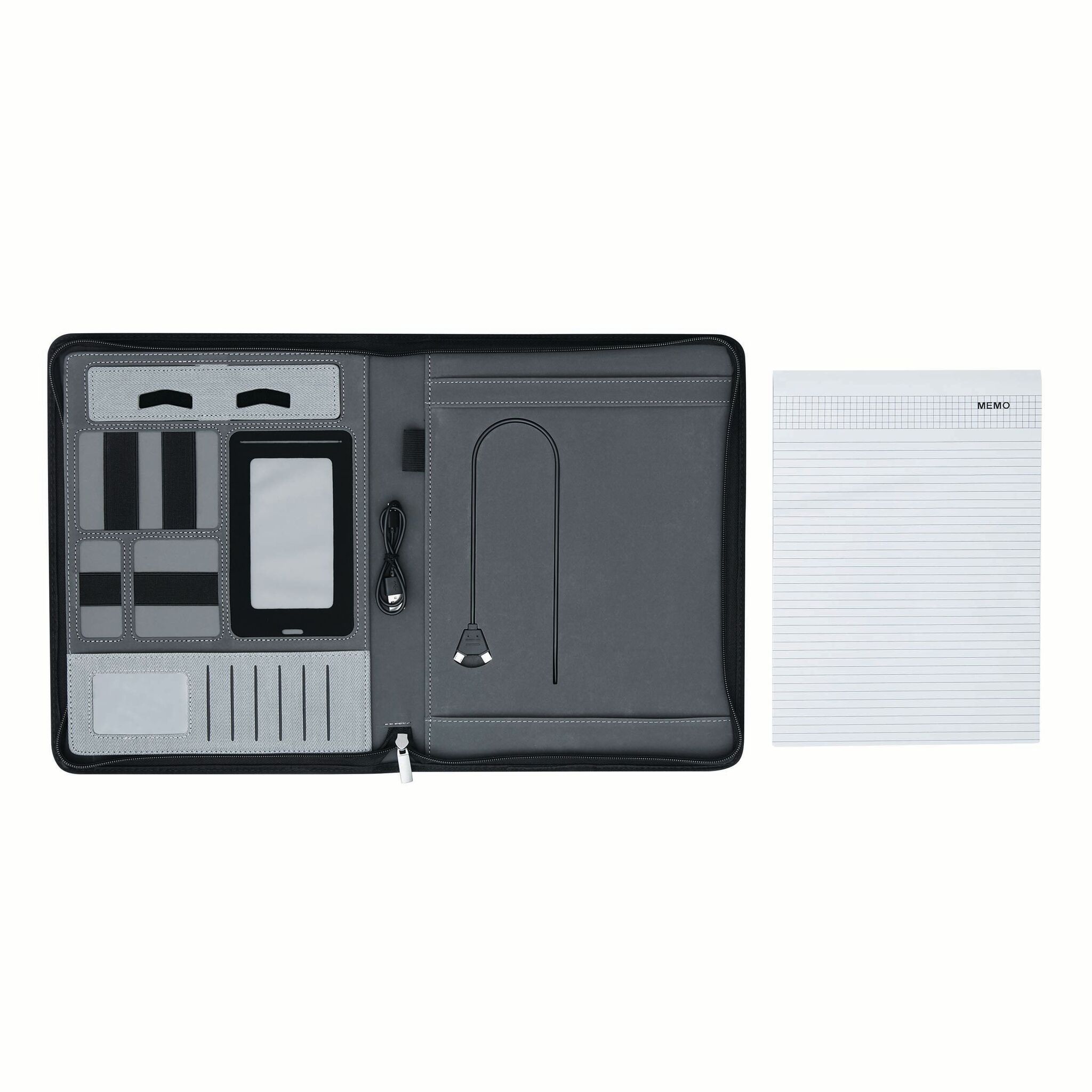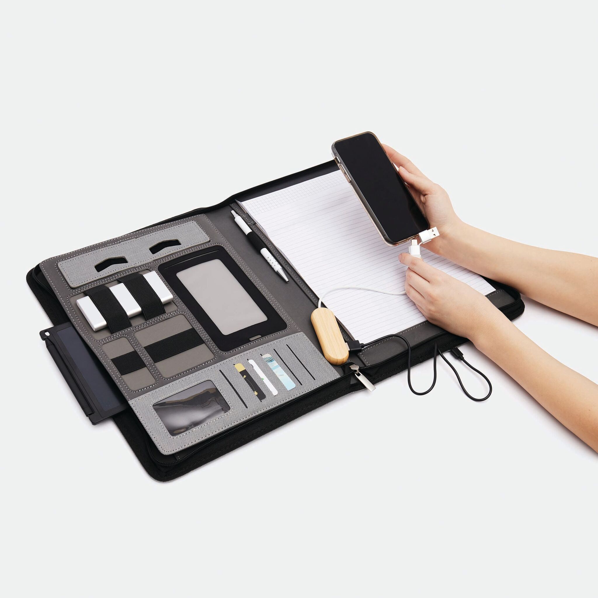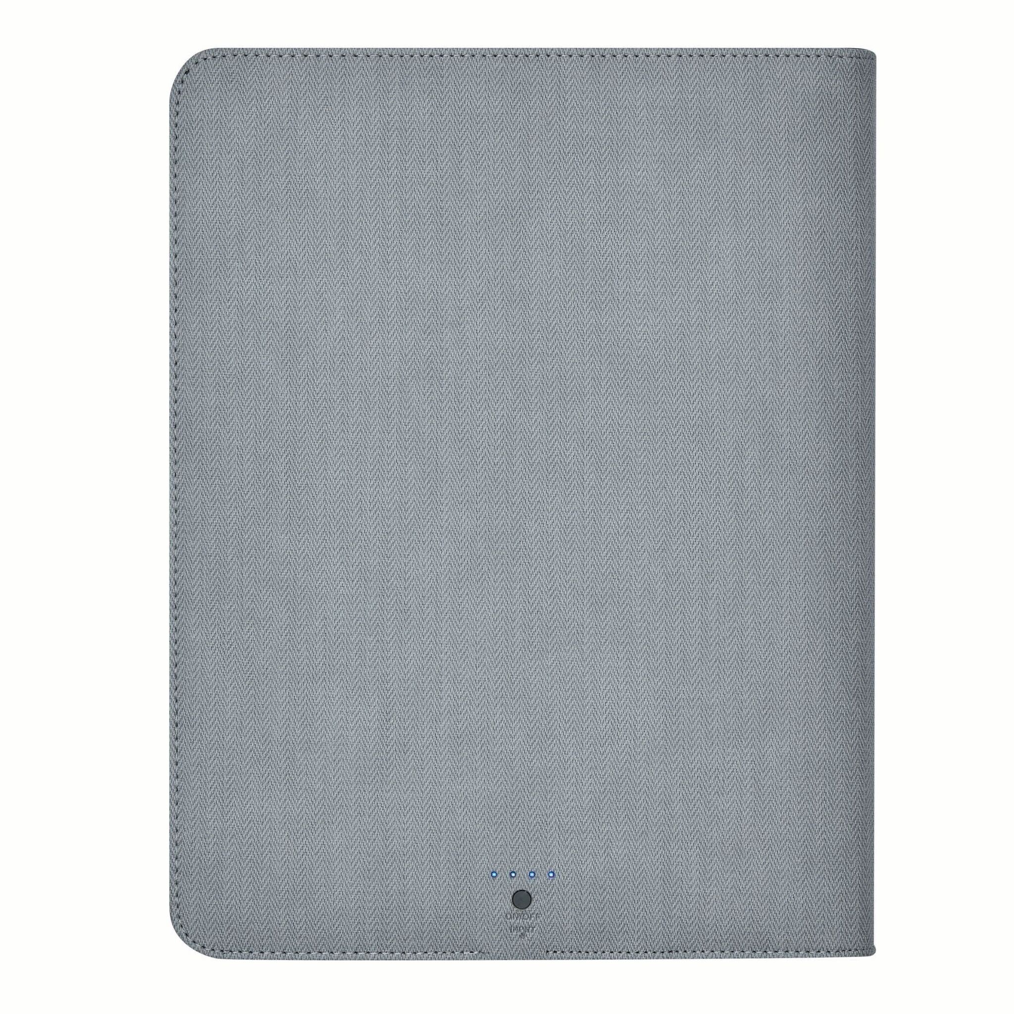 Portfolio HIGHNESS в формате А4, со встроенным Повербанк -ом (емкость: 5000 mAh,входная мощность: 5V/1A, выходная мощность: 5V/1A), большой карман для документов, маленький для смартфона, подставка для телефона или планшета регулируется липучками, резинки разной длины для аксессуаров, кармашки для визиток, петля для авторучки,блокнот в формате А4; закрывается на молнию, снаружи большой карман и резиновая пластинка из хрома