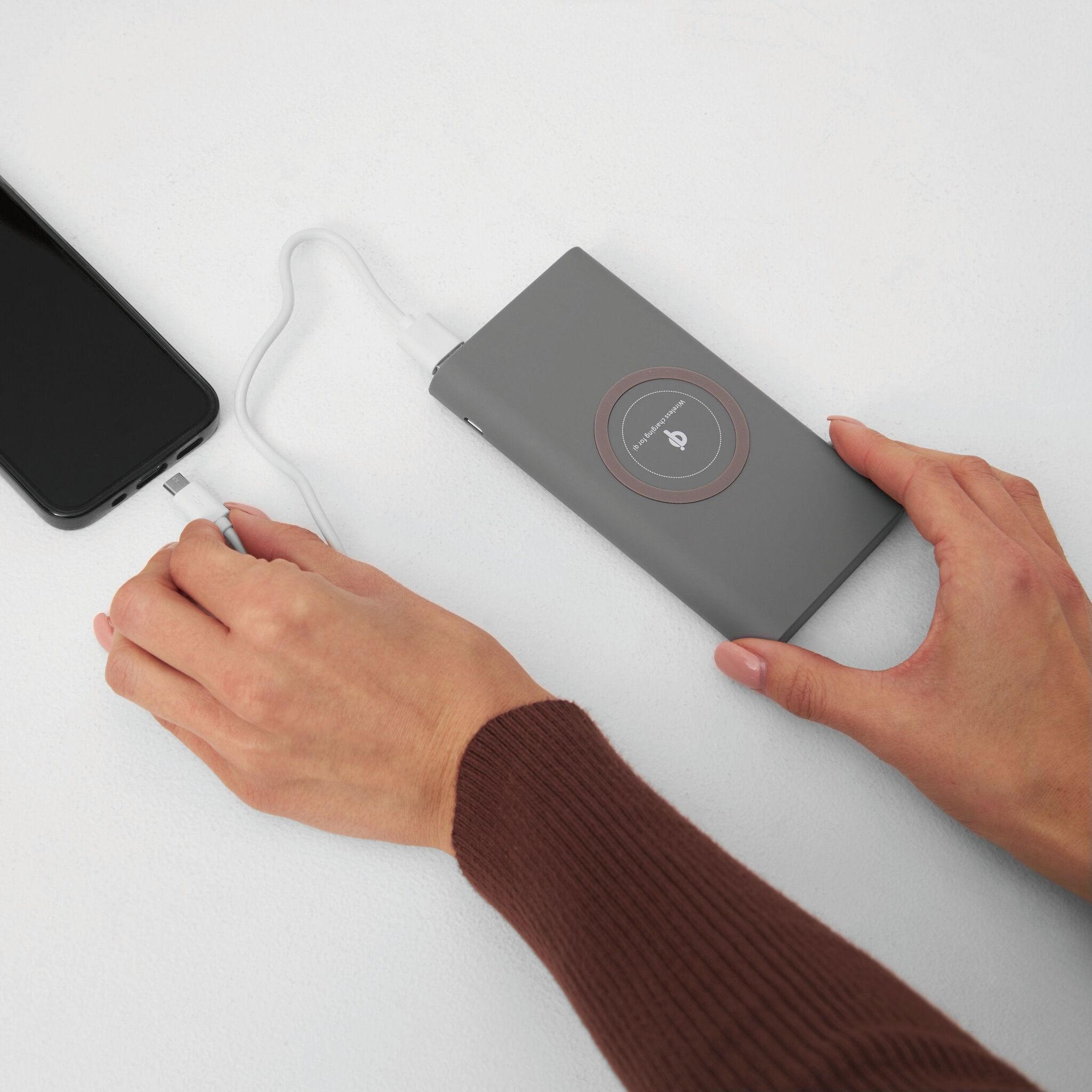 Повербанк CONTAC T идеальный источник запасной энергии за пределами дома, подходит для смартфонов и других устройств USB. Имеет функцию беспроводной зарядки (для устройств с возможностью индукционнойной зарядки), повербанк также можно заряжать беспроводным путем, разместив его на подходящей базовой станции (не прилагается, см.артикул 56-1107243). Имеет USB кабель с разъемом Micro-USB (длина ок. 50 см), USB разъем тип С, встроенный индикатор зарядки и работы, выключатель. Входная мощность:5V/2A (USB), 5V/750 mA (беспроводное), выходная мощность: 5V/2,1A (USB), 5V/1A (беспроводное). Емкость аккумулятора- ок.10 000 mAh.
