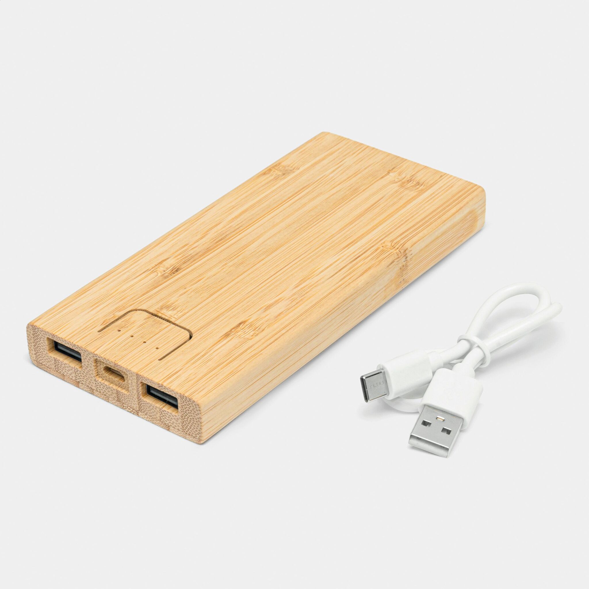 Powerbank BAMBOO ENERGY Внешний аккумулятор в бамбуковом корпусе. Подходит для смартфонов и популярных электронных устройств с USB-зарядкой, емкость: 10 000 мАч, 2 выходных порта USB A, индикатор уровня заряда, выключатель, мощный аккумулятор, входная мощность: 5 В/2 А, выходная мощность: 5 В/2 А, индикатор работы устройства. В комплект входит USB-кабель со штекером USB C (длина около 30 см)