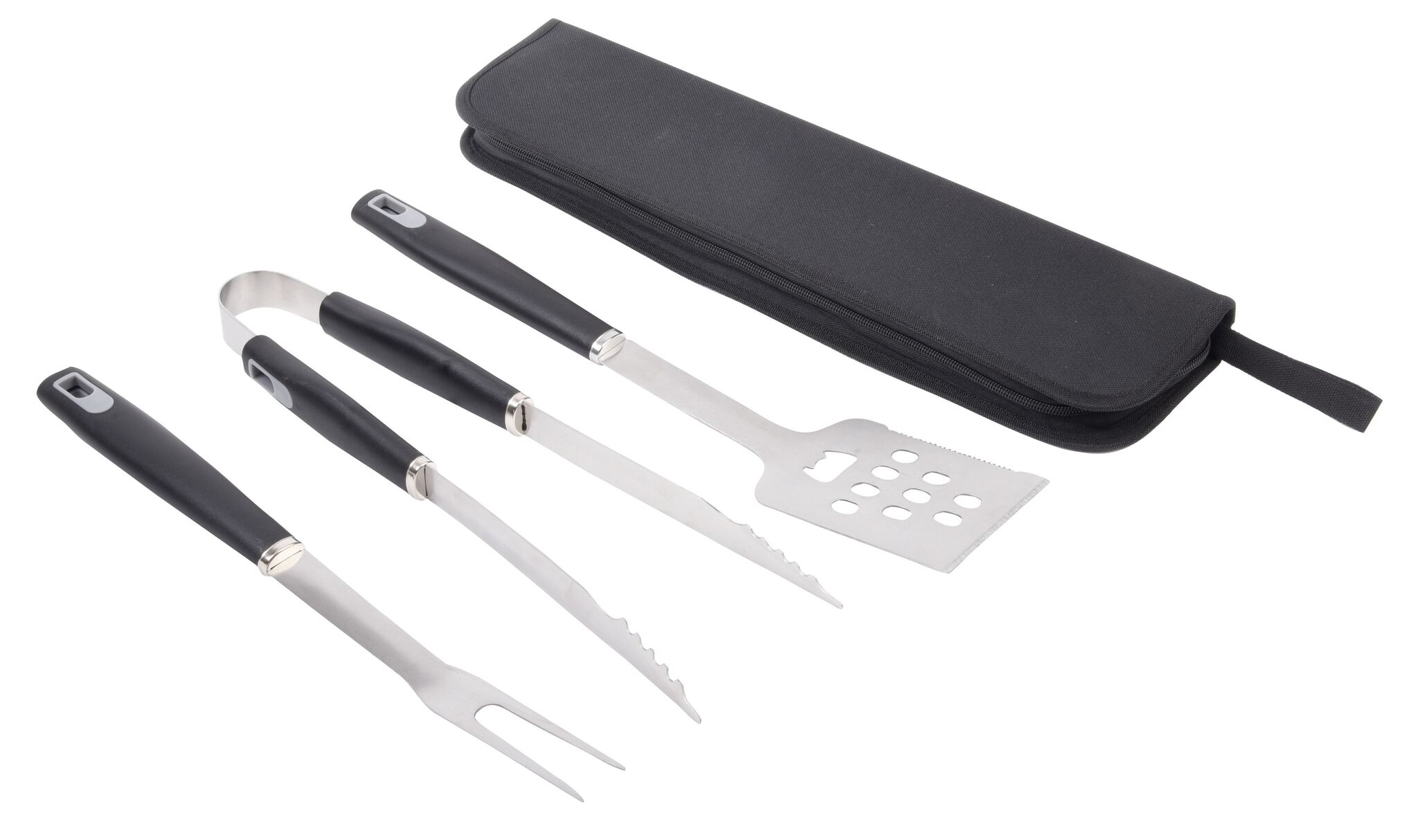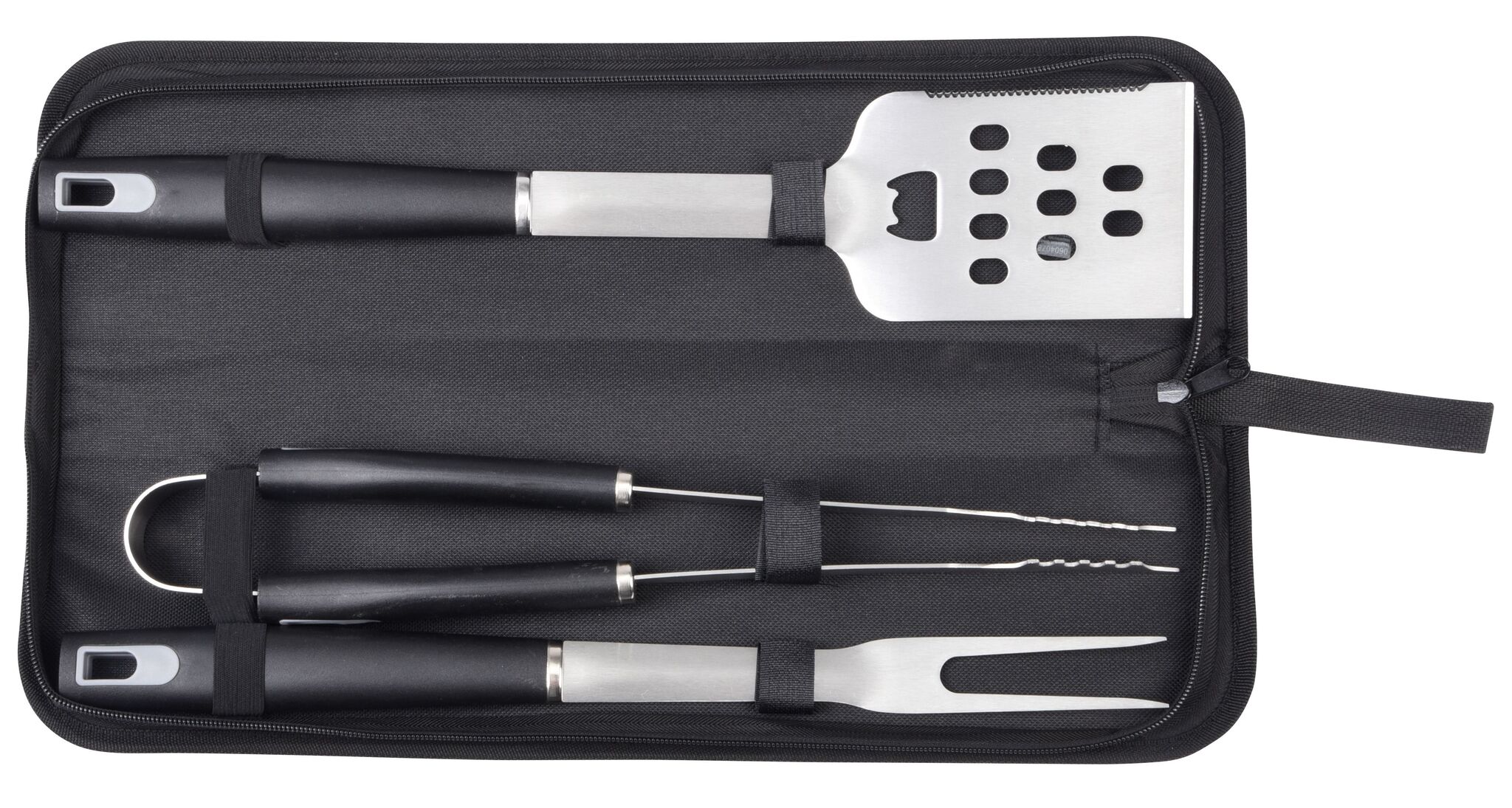 Приборы для барбекю из нержавеющей стали PRETTY BBQ : состоят из лопатки, вилки для мяса и щипцов для гриля, упакованны в футляр с застежкой-молнией и петлей для переноски.