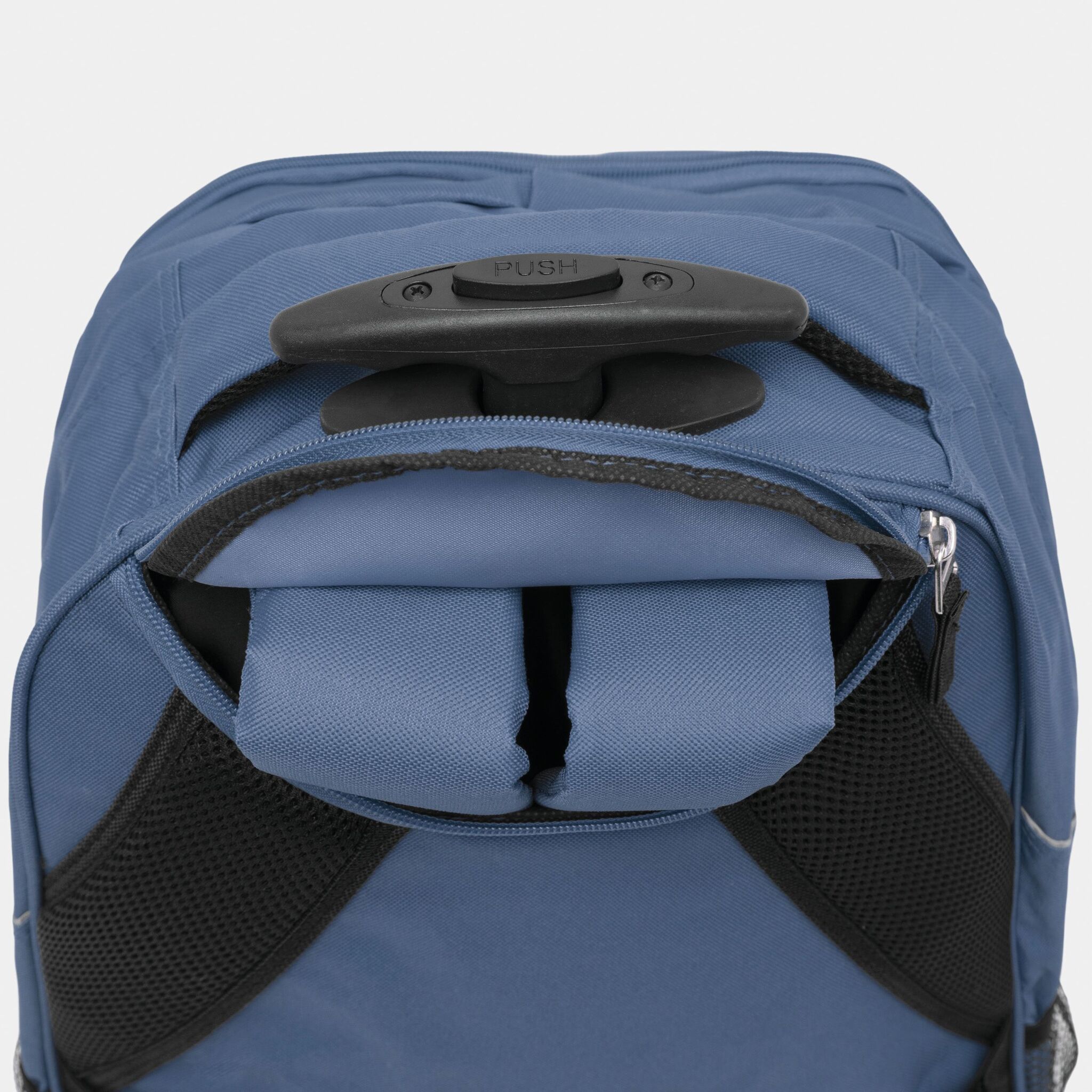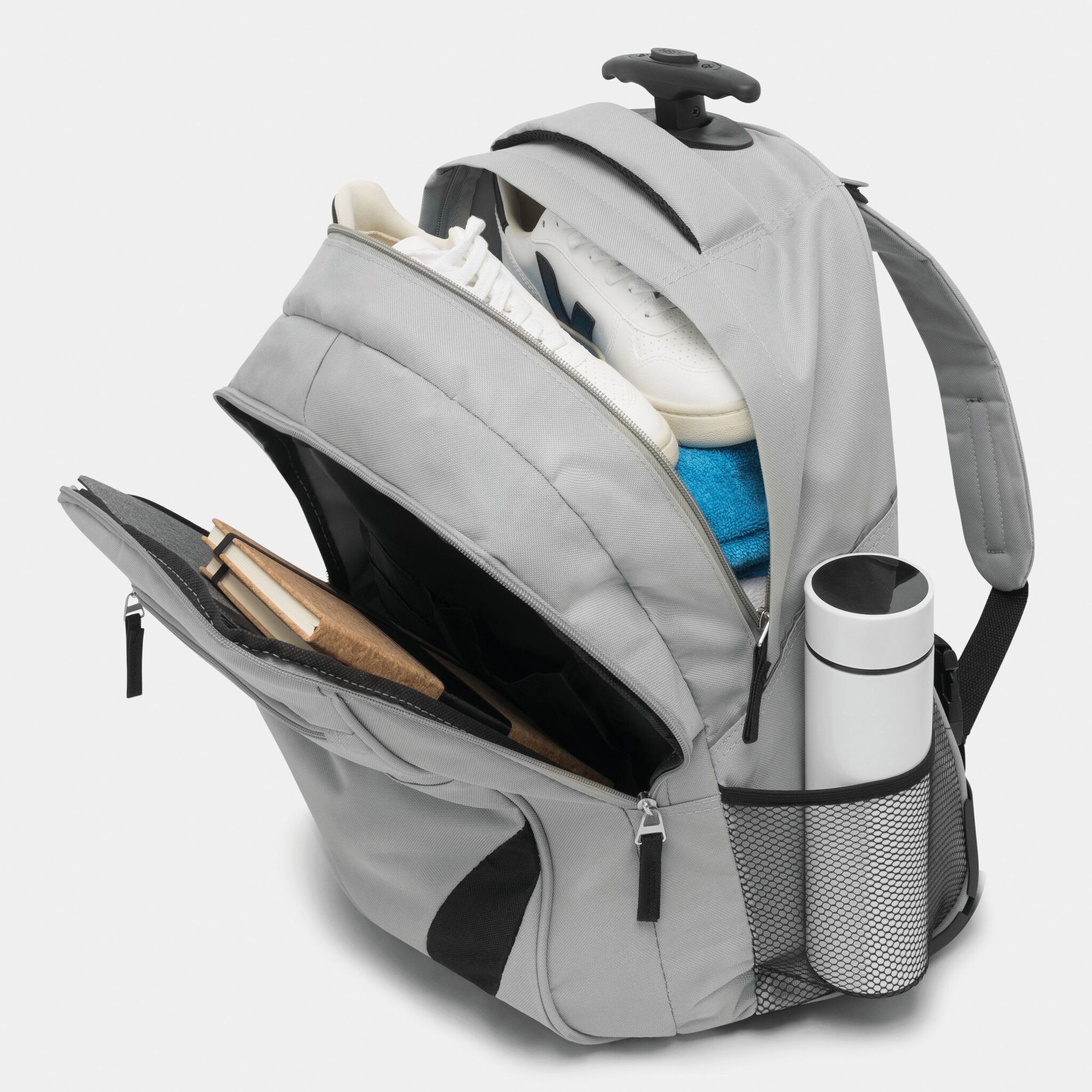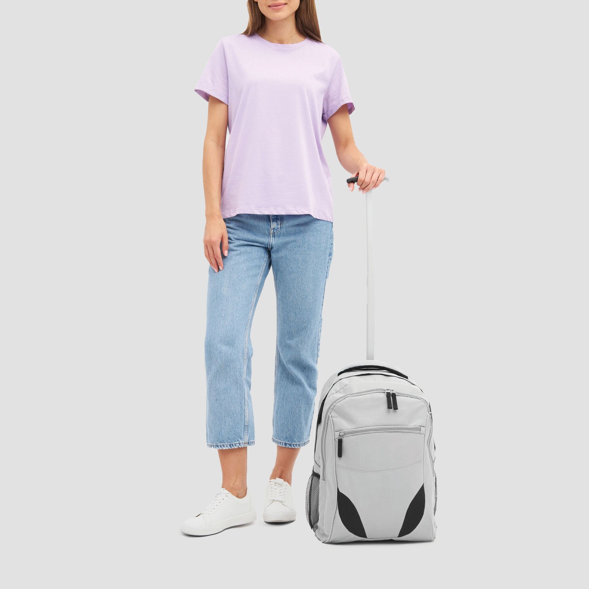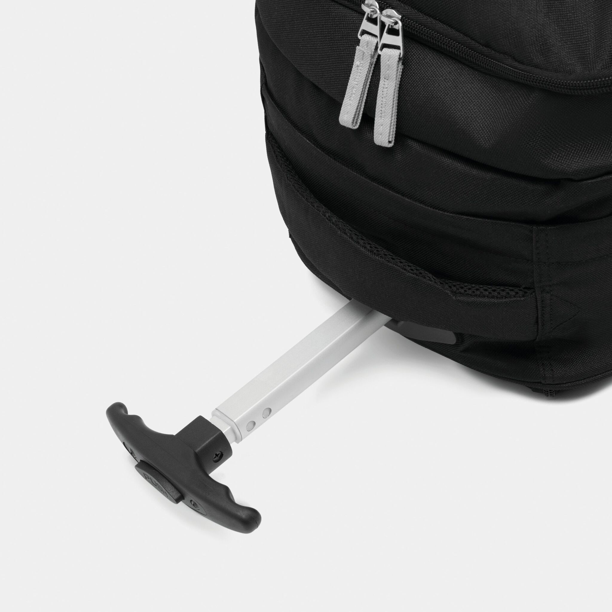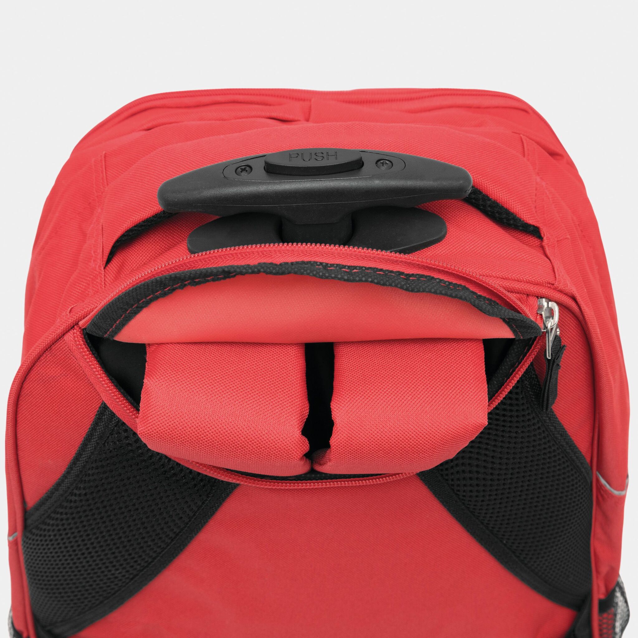 Pюкзак на колесах TRAILER небольшой передний карман на замке, большой передний карман с органайзером для замка, главное отделение с профилированным карманом для ноутбука, 2 боковых кармана из сетки, профилированные плечи и лямки, карман на молнии для лямок; телескопическая ручка, ручка для переноса,2 легко скользящих колеса
