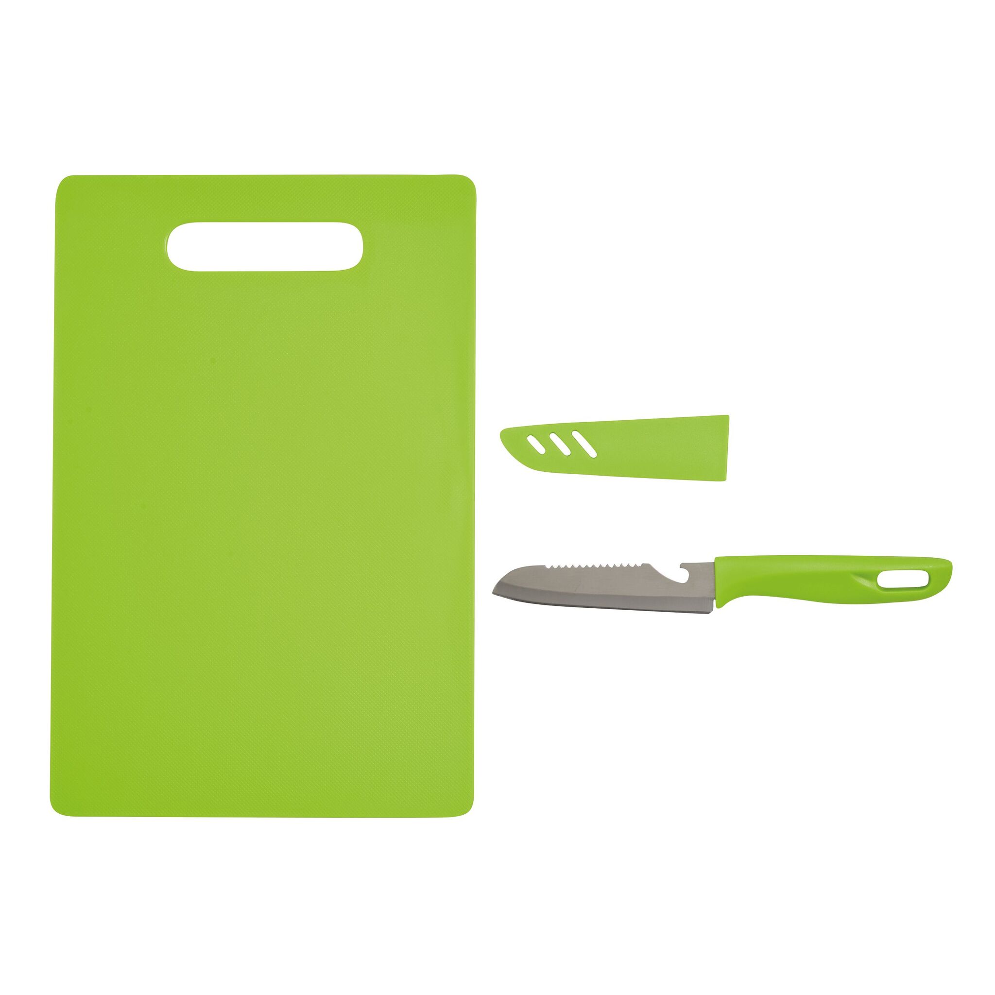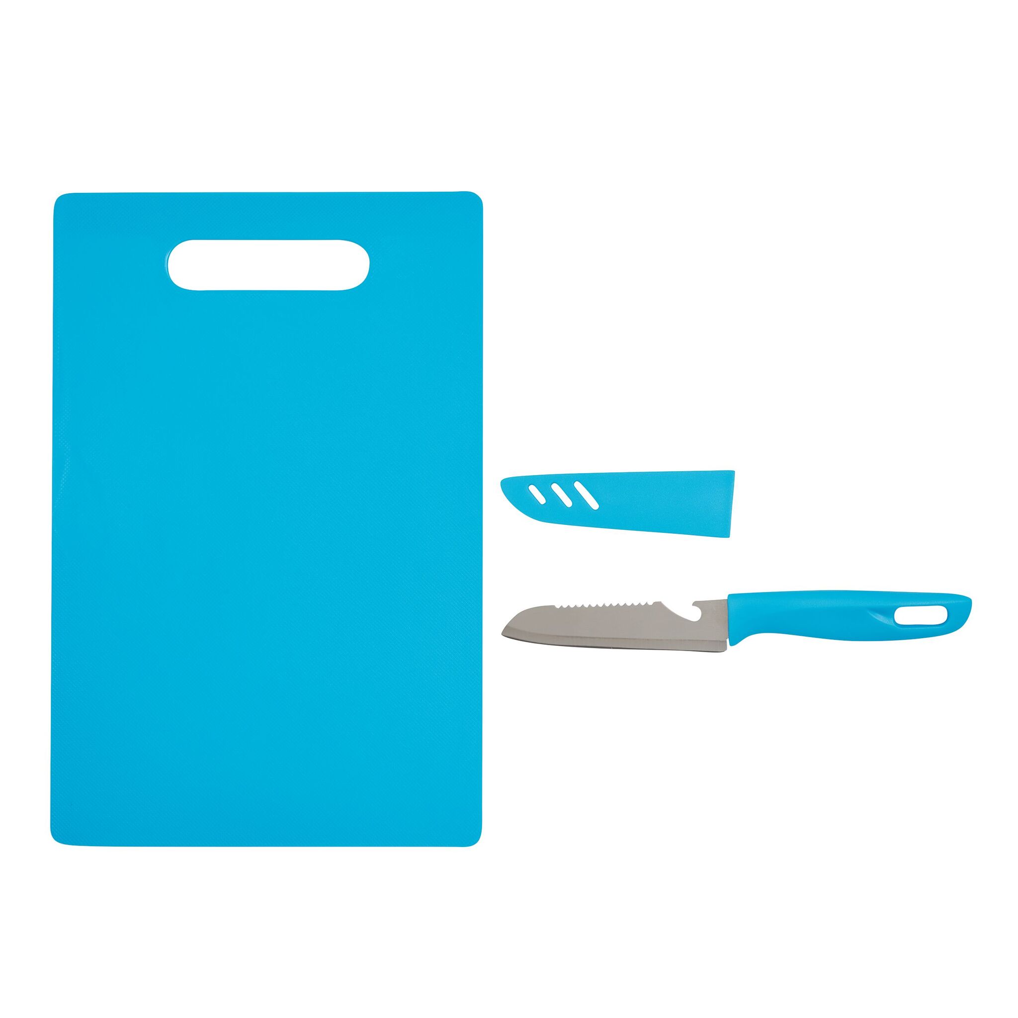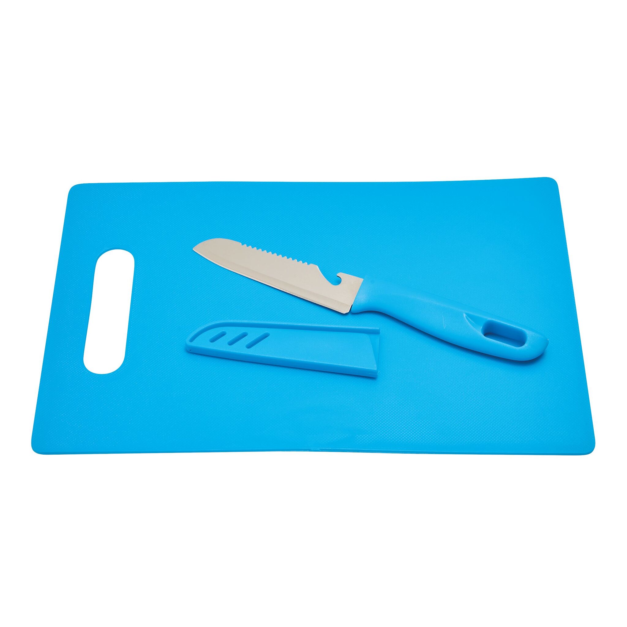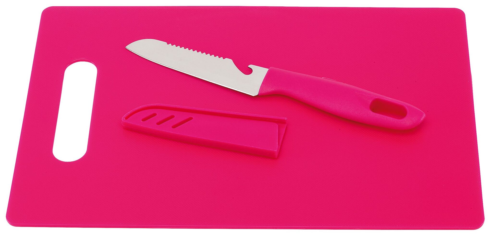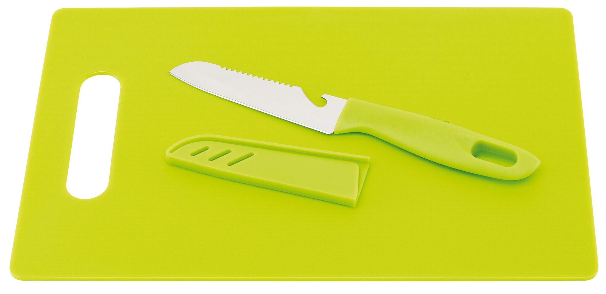 Разделочная доска SUNNY включает в себя нож из нержавеющей стали, со встроенной открывалкой для бутылок и ушко для подвешивания на ручке, защитный чехол, доску легко подвесить