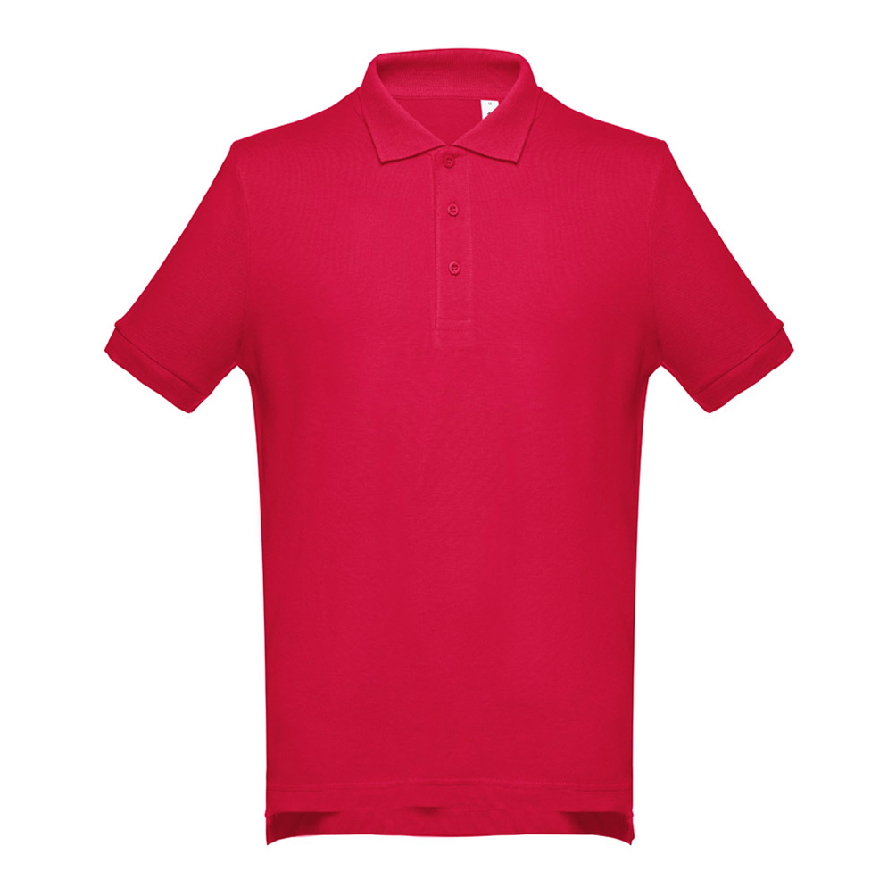 Мужское поло. Трикотаж пике 100% хлопок: 195 г/м². Манжеты и воротник на резинке. Укрепляющая лента на воротнике и планка c 3 пуговицами в тон. Нижняя часть с разрезами. Запасная пуговица на внутреннем шве. Завернутый шов внизу
